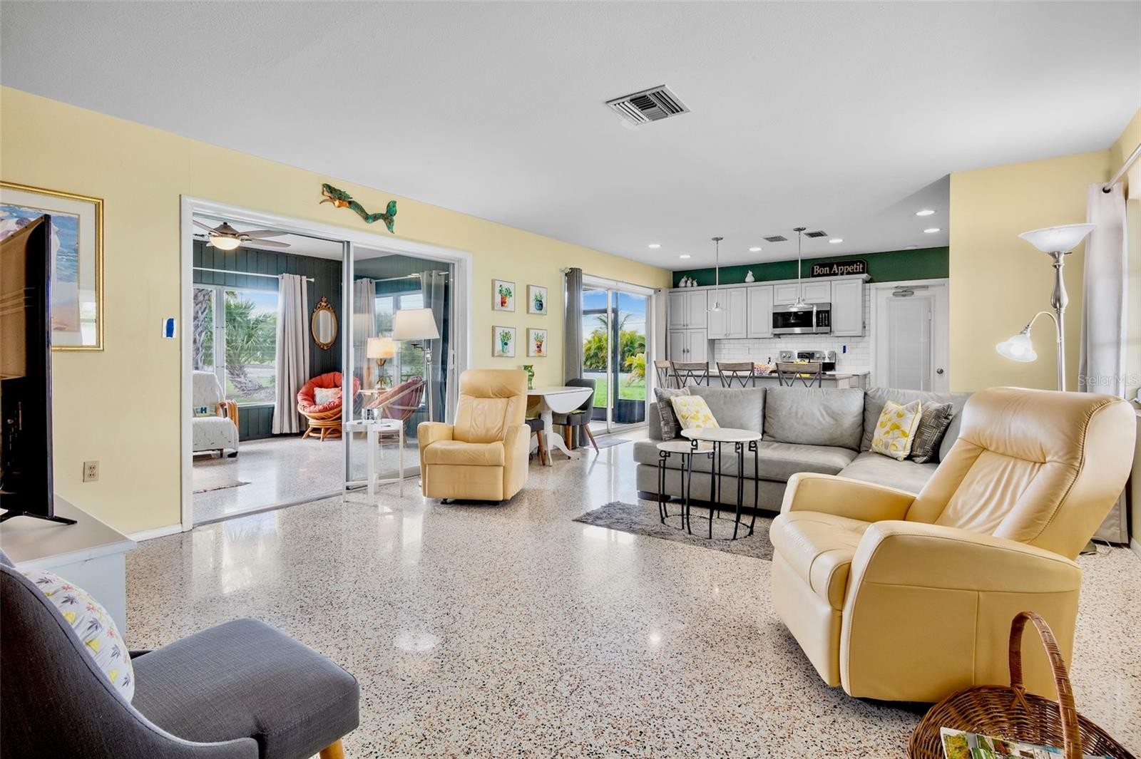 Mid-Century home located West of the Trail, just minutes from Nokomis Beach. This lovingly maintained property perfectly captures the coastal lifestyle, situated in a vibrant neighborhood where residents frequently walk, bike, or take golf carts to enjoy the beach and local sunsets. The interior features gleaming terrazzo floors throughout, an open kitchen equipped with quartz countertops and a large island, and an expansive owner's suite with an ensuite bath. Additionally, the home includes a large guest bedroom and a versatile, air-conditioned Florida room that can serve as an office or additional guest space. Outside, the extra-large lot offers significant room for a pool or further expansion, complemented by an extensive front porch and a screened back lanai. Offered Turn Key Furnished.