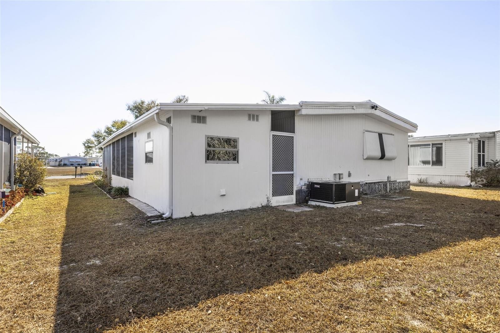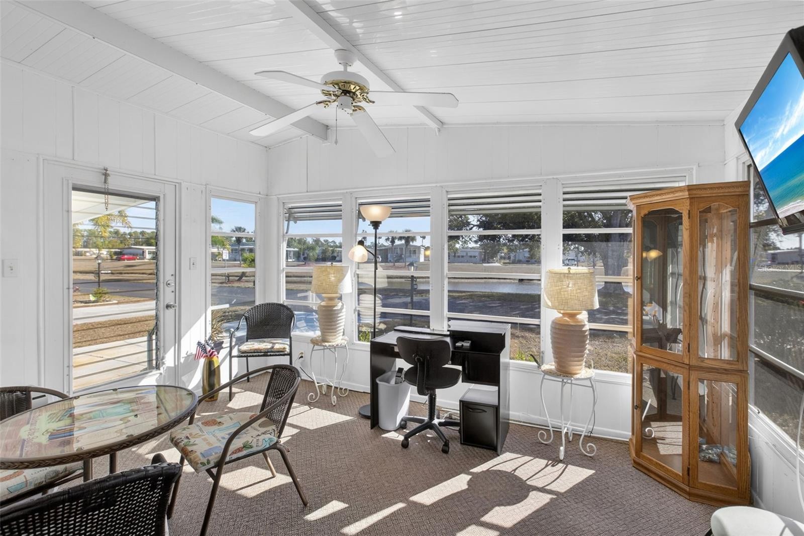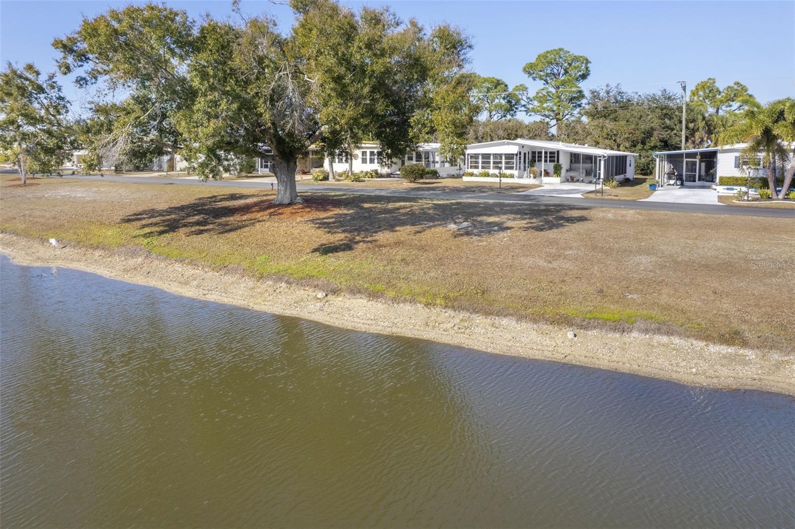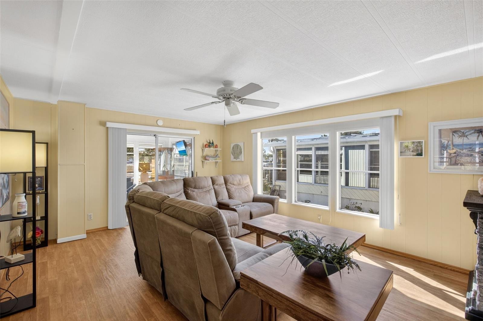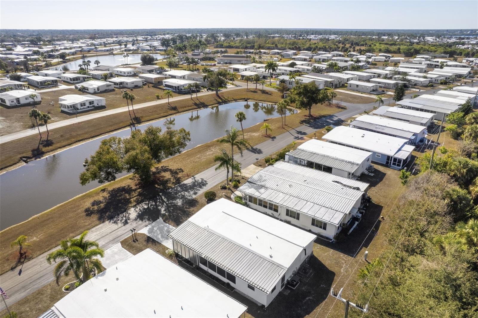 This inviting two-bedroom, two-bath home offers beautiful lake views and plenty of morning sunlight streaming through the front Florida room. The carport leads to a screen room and the utility room with a washer, dryer, deep sink and storage. The kitchen looks out over the lake and features newer cabinets, a breakfast bar, a disposal, and appliances. In the dining room, you'll find a built-in hutch for extra storage. The living room opens to a glass-enclosed Florida room with an awning, plus a door to the carport and more lake views. The hallway includes a pantry and a linen closet for added storage. The primary bedroom has a double closet and a dressing area with a vanity and an additional double closet. The primary bathroom features a walk-in shower. The guest bedroom also has a double closet, and the guest bathroom includes shiplap accent walls, a vanity, and a walk-in shower. The home has a new roof in 2023, an A/C, ceiling fans, and laminate flooring throughout.