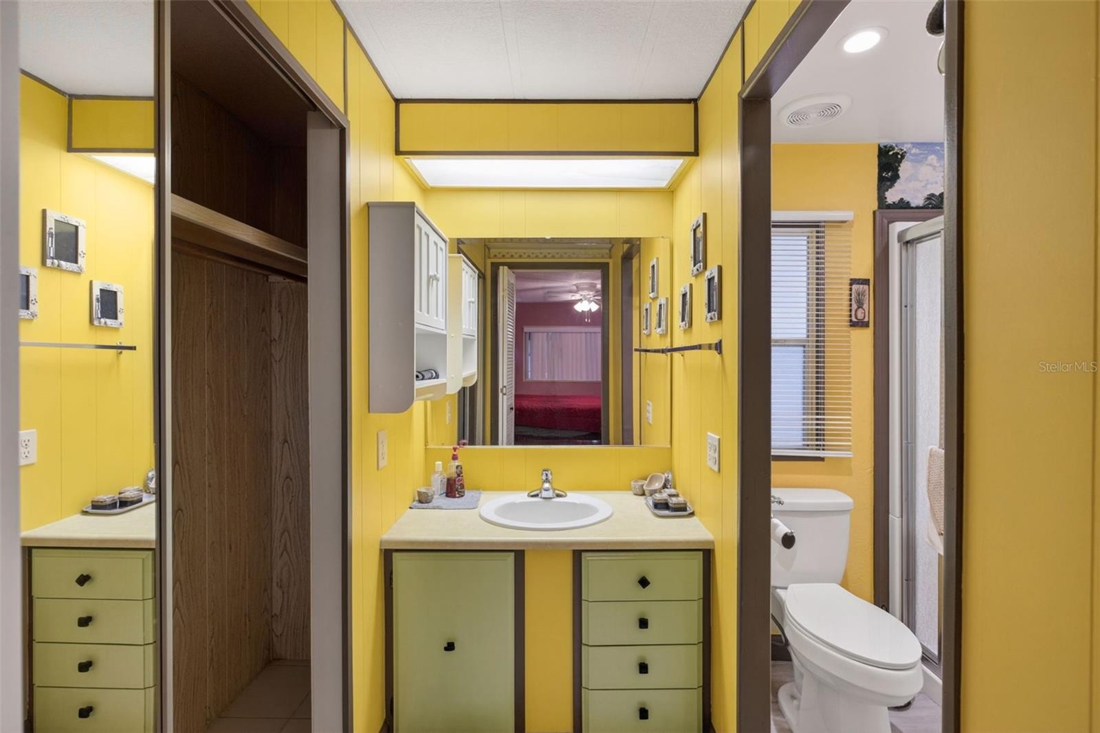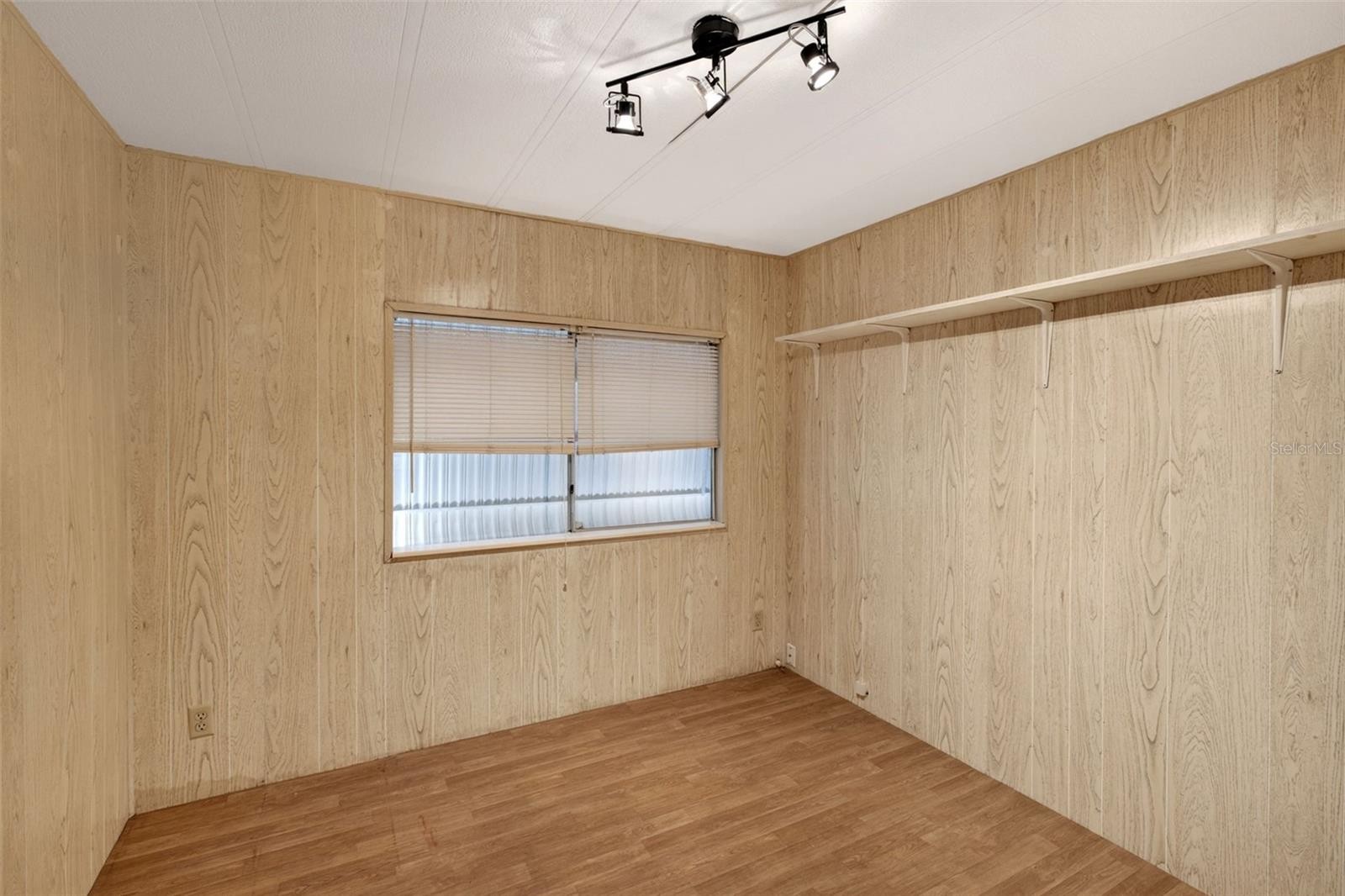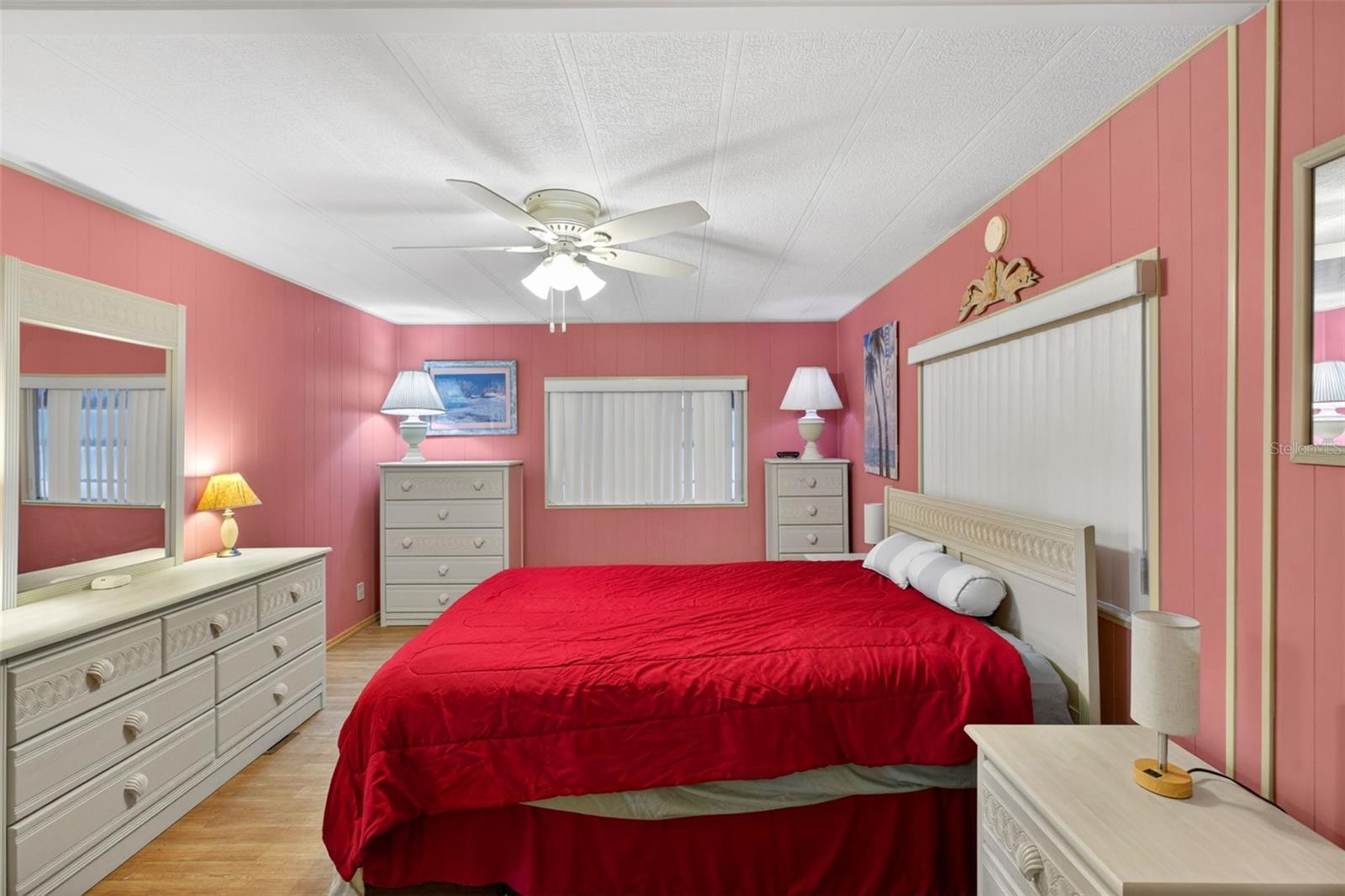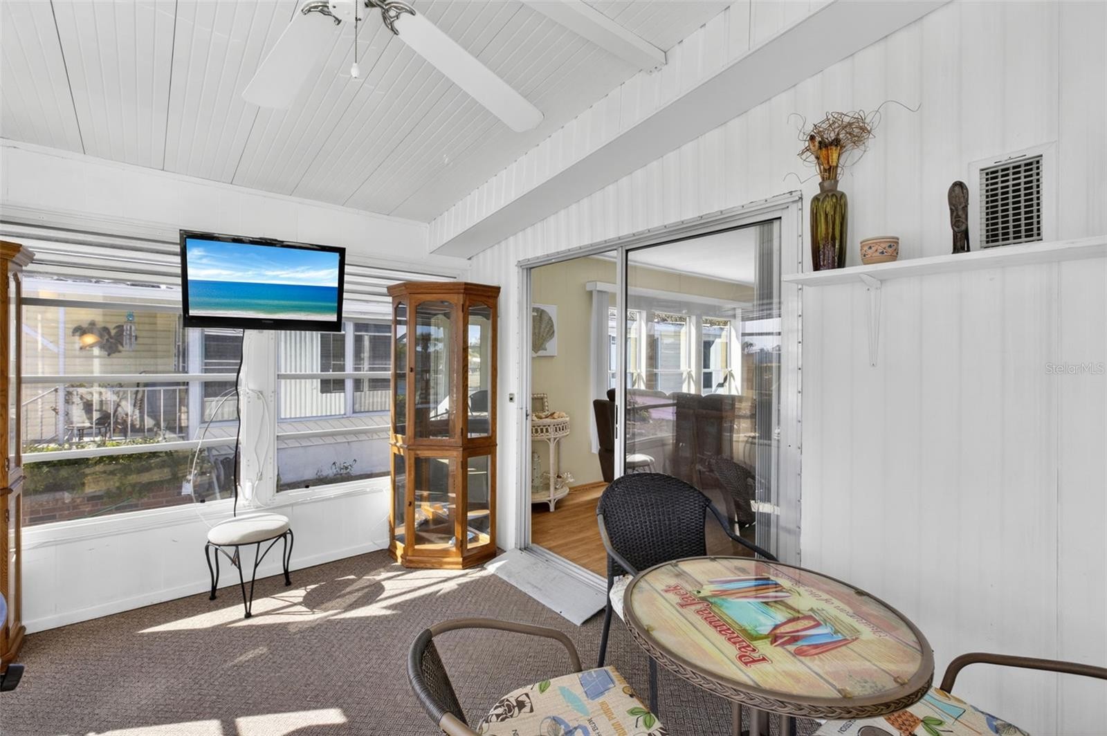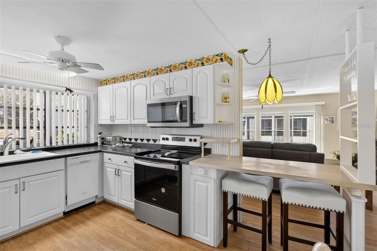 This inviting two-bedroom, two-bath home offers beautiful lake views and plenty of morning sunlight streaming through the front Florida room. The carport leads to a screen room and the utility room with a washer, dryer, deep sink and storage. The kitchen looks out over the lake and features newer cabinets, a breakfast bar, a disposal, and appliances. In the dining room, you'll find a built-in hutch for extra storage. The living room opens to a glass-enclosed Florida room with an awning, plus a door to the carport and more lake views. The hallway includes a pantry and a linen closet for added storage. The primary bedroom has a double closet and a dressing area with a vanity and an additional double closet. The primary bathroom features a walk-in shower. The guest bedroom also has a double closet, and the guest bathroom includes shiplap accent walls, a vanity, and a walk-in shower. The home has a new roof in 2023, an A/C, ceiling fans, and laminate flooring throughout.
