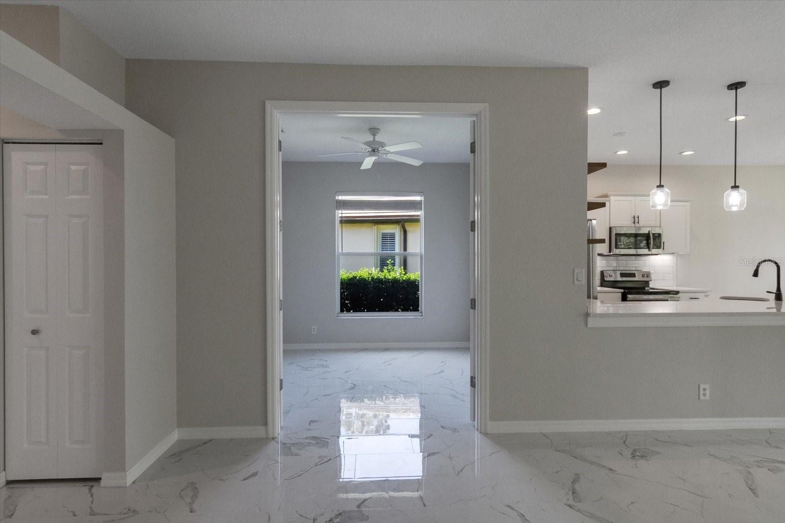 One or more photo(s) has been virtually staged. Welcome to 2295 Harrier Way – where elegance, comfort, and convenience come together in perfect harmony. This beautifully updated home offers a timeless design with carefully curated finishes. Nestled in Falcon Trace, the sought-after maintenance-free enclave of Calusa Lakes, this residence combines sophistication with everyday ease. Set on a spacious lot surrounded by lush vegetation and preserved woodlands, the property provides both natural light and serene privacy. Step inside to an open, thoughtfully designed floor plan with soaring ceilings and brand-new marble-look porcelain tile flooring throughout. The heart of the home is a modern chef’s kitchen, complete with quartz countertops, stainless steel appliances, and a peninsula that opens to the central living room—perfect for both entertaining and everyday living. A bright dining area, embraced by windows overlooking the natural surroundings, enhances the sense of connection to the outdoors. The primary suite is generously sized, offering room for a king bed with additional furnishings, along with dual walk-in closets. The ensuite bath is a luxurious retreat, featuring a new marble-tile shower, stone-topped vanities, updated fixtures, mirrors, and lighting. The split floor plan ensures privacy, with a spacious second bedroom and fully remodeled guest bath on the opposite side of the home. A versatile third room—accessible through French doors—can serve as an office, library, or guest bedroom. Additional features include a large two-car garage with a workbench, laundry area with washer, dryer, and utility sink, plus direct side-door access. Outside, the screened lanai opens to a completely private backyard framed by mature Florida landscaping—beautifully maintained year-round by the association. Living here feels like resort-style luxury. Just a short stroll away, residents of Falcon Trace enjoy an exclusive heated pool, with additional access to the main Calusa Lakes pool. The gated community also offers a clubhouse with restaurant and bar, tennis courts, and an 18-hole golf course, all surrounded by lakes, waterfalls, and tropical scenery. Ideally located between Sarasota and Venice, you’ll be just minutes from I-75, shopping, dining, boating, and some of Florida’s most famous beaches—including Nokomis Beach and Siesta Key, known for pristine white sands. 2295 Harrier Way is more than a home—it’s a lifestyle. Experience the perfect balance of elegance, tranquility, and convenience in one of Sarasota County’s most desirable communities.