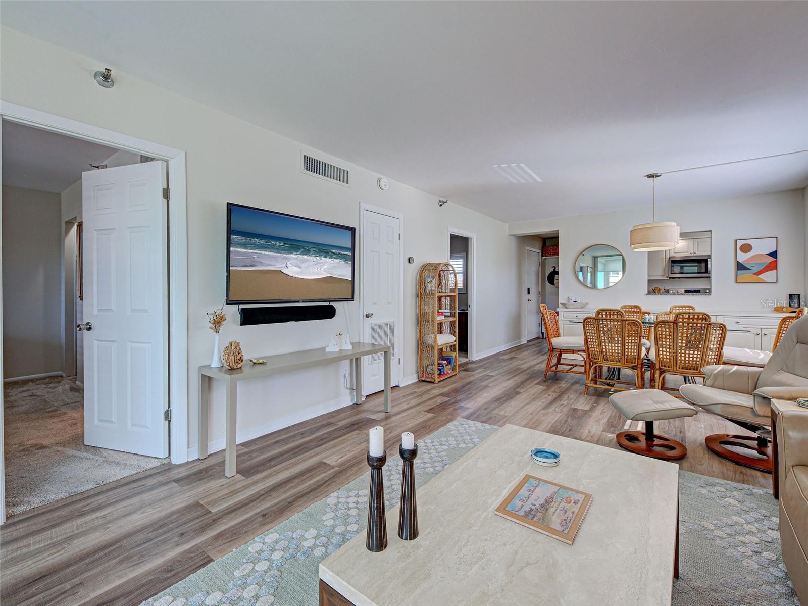 Location, Location, Location! Near the Venice Theater, Centennial Park, Library, Tennis & Pickleball, the beach and restaurants galore. Always something to do with a bike trail cross the street, sports, beach yoga, concerts & art shows at Centennial Park. Restaurants and shopping across the street. This condo is an end unit which offers about 10% more living space and 50% more natural light. It has recently been renovated throughout offering new flooring, fixtures, paint and impact / hurricane doors that will protect you and your stuff. Plantation shutters, new shades, a Nest thermostat and digital door lock are the finishing touch for a easy move in with remote access.