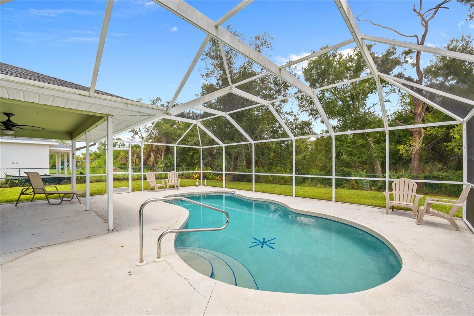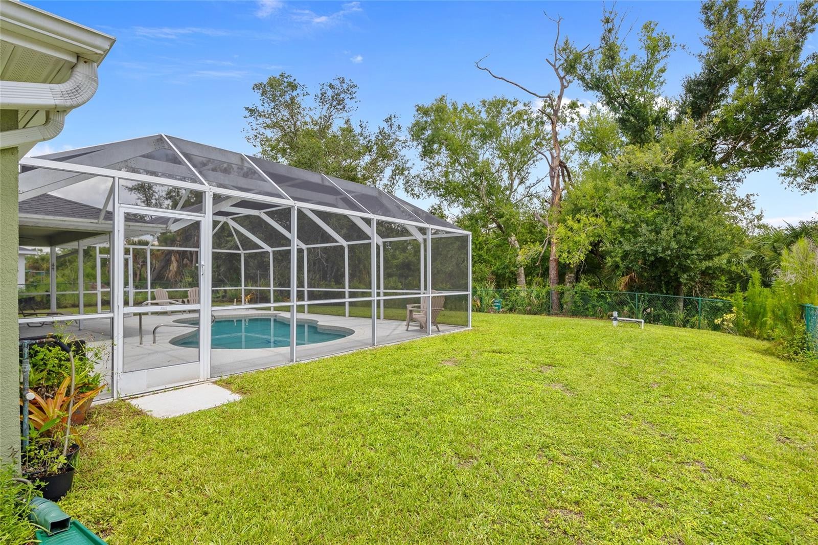 SPACIOUS 3 BEDROOM, 2 BATH, 2-CAR GARAGE CANAL FRONT POOL HOME IN NORTH PORT! This home features 1,623 sf of living space, high ceilings, laminate and tile flooring throughout. The kitchen offers an abundance of cabinetry, granite counters, stainless steel appliances, and breakfast bar that overlooks the dining and family room. Generous primary bedroom has views of the pool and lanai area, walk-in closet and private ensuite featuring dual sinks, soaker tub, and walk-in shower. Split floor plan ensures privacy, with two additional bedrooms sharing a full guest bath. Additional upgrades and features include newer roof 2022, hot water heater 2024, pool pump 2024, well pump 2024, water softener 2024, canal lot, nicely landscaped exterior, screen front entry and inside laundry room. Step outside to a covered lanai with screened pool overlooking fenced backyard with mature trees for privacy. Located near I-75, Murdock shopping and restaurant district, schools, hospitals and outdoor activities. Don’t miss this opportunity! Schedule your private showing today!