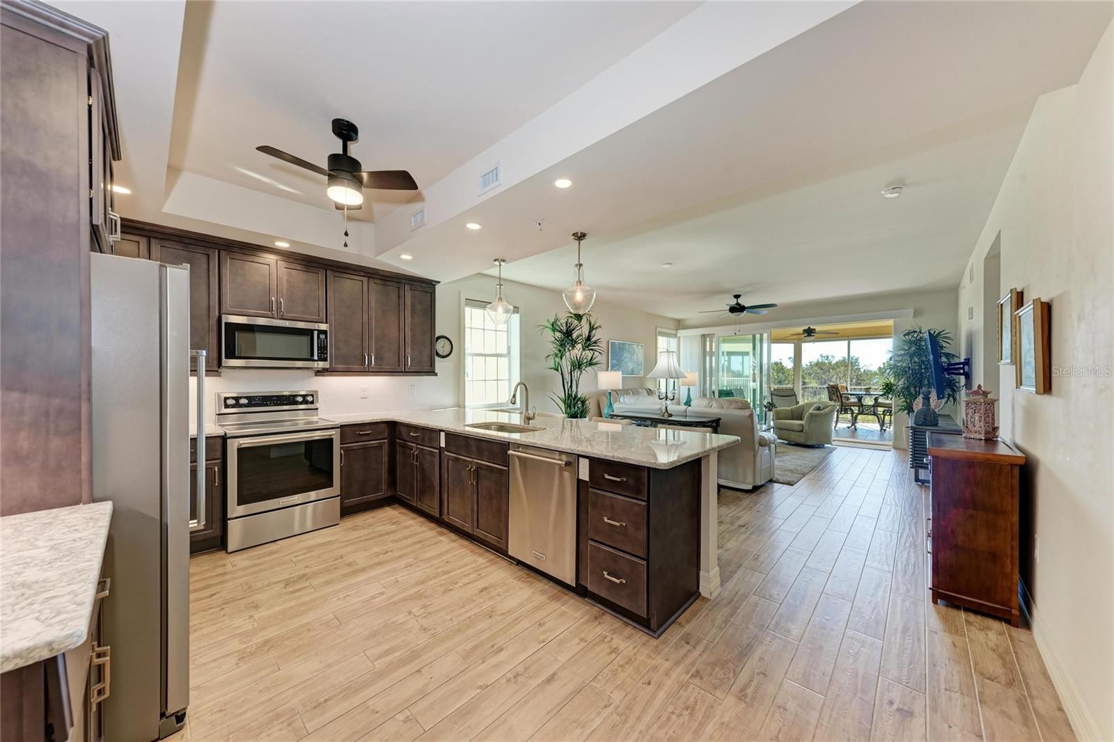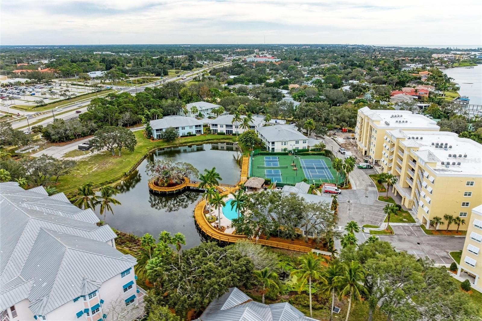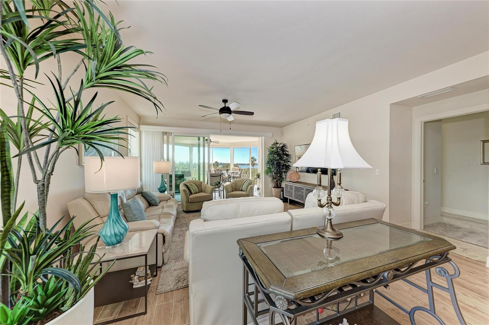 Enjoy sweeping water views and stunning sunsets over Little Sarasota Bay from this spacious third-floor corner residence in the gated waterfront community of Edgewater at Hidden Bay. Built in 2018, this three-bedroom plus den, 2.5-bath condominium offers nearly 2,200 square feet of living space with easy elevator access and one assigned parking space in the building. The attractive open floor plan features soaring ceilings, impact-rated windows and sliding doors, easy maintenance tile plank flooring and abundant natural light throughout. The kitchen includes granite countertops, solid wood cabinetry, stainless steel appliances and custom storage with pullout drawers. The living area offers a built-in dry bar with wine refrigerator and opens to a large, screened-in terrace with privacy-screens and expansive bay views. The primary suite includes dual walk-in closets and a luxurious bath with dual quartz vanities, decorative tile flooring, makeup vanity and walk-in shower. Additional features include a private den/office, in-unit laundry room, two full baths and a powder room. Edgewater at Hidden Bay is a gated, resort-style community set on 14 acres along Little Sarasota Bay and the Intracoastal Waterway, directly across from Casey Key. Community amenities include a waterfront clubhouse with kitchen and quartz bar, heated pool and spa, fitness center, library, tiki hut with grilling stations, pickleball and tennis courts, kayak launch, fishing pier, dog play area, and an elevated boardwalk through mangroves and palm-lined grounds. Hidden Bay is conveniently in Osprey just south of Sarasota, near area beaches, shopping and dining, and only minutes from Venice.