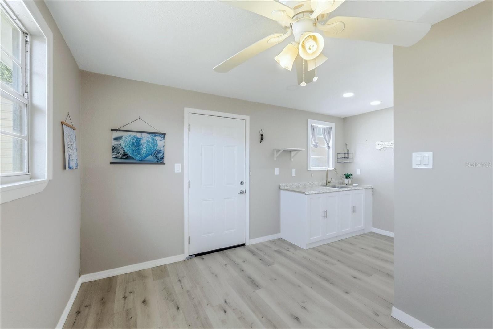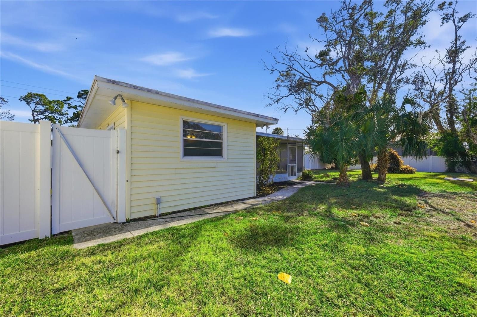Cute and charming SOUTH VENICE home featuring a welcoming front porch, a functional floor plan, and solid bones—ready for its next owner to make it their own. This 2-bedroom, 1-bath home includes a separate STUDIO APARTMENT and sits on an expansive 120 x 100 fully fenced lot, offering space, privacy, and versatility. The home boasts a recently REMODELED KITCHEN with brand-new Stainless Steel appliances, a modern sink, New Counter Tops, dining area, and an eat-in kitchen with breakfast bar—complete with a built-in computer/workstation. New carpeting in the bedrooms adds comfort and freshness. Enjoy Florida living in the newly screened, covered lanai overlooking a beautifully landscaped oversized FENCED backyard. Additional features include EXTRA oversized storage/workshop/garage space large enough to fit a vehicle, and an attached one-car garage. A updated-new electrical panel has just been installed for added peace of mind. Conveniently located just minutes from local beaches, historic downtown Venice, shopping, and dining. Optional membership in the South Venice Civic Association provides access to a PRIVATE BEACH via ferry and a BOAT RAMP, exclusively for residents—truly a FISHERMAN'S PARADISE. A wonderful opportunity to enjoy the Florida Lifestyle and Sunshine in a desirable Venice location!