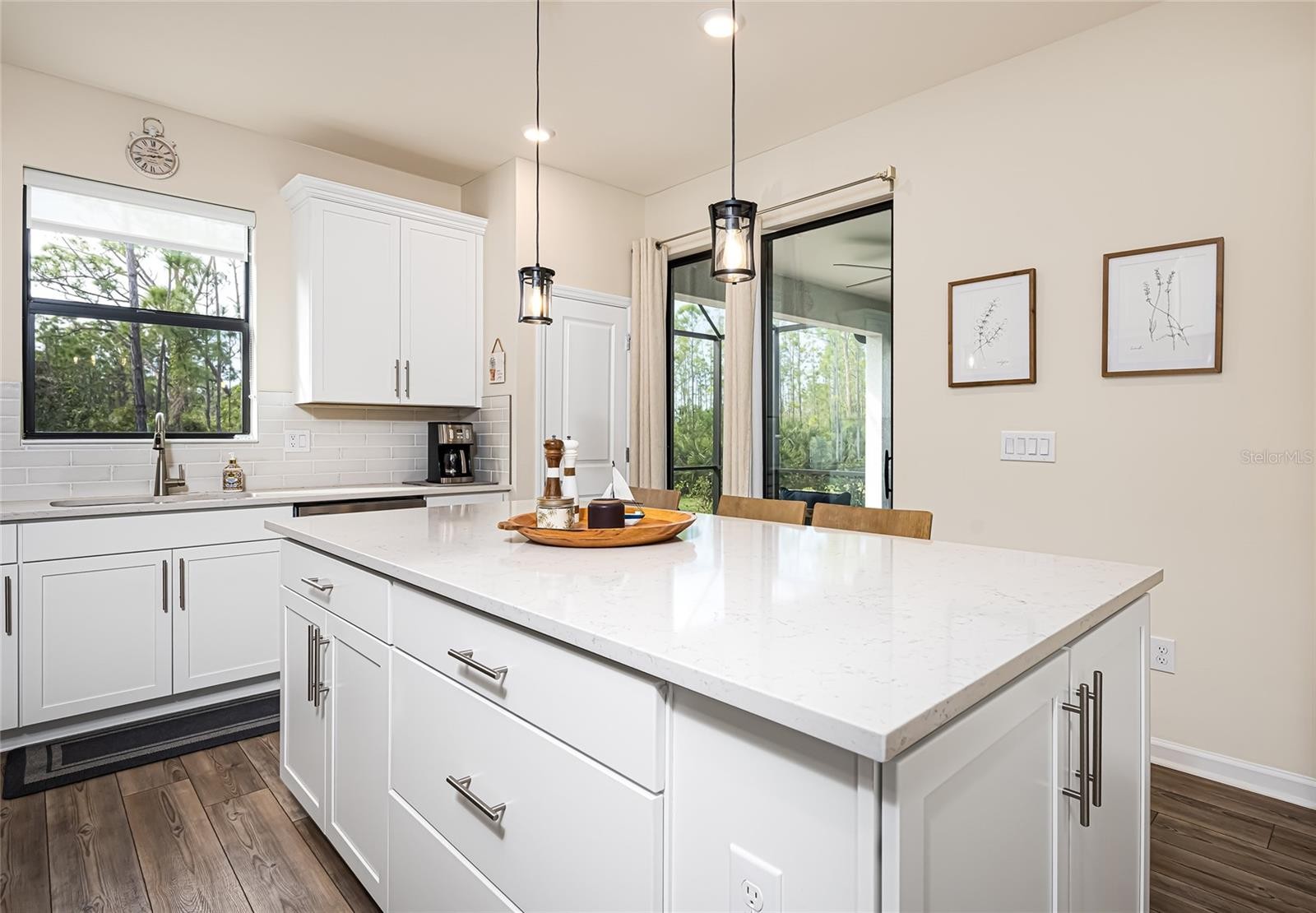 Welcome to Cypress Falls at the Woodlands, an exclusive 55+ gated community in North Port. This immaculately maintained, 2-year-old FURNISHED home is move-in ready and located outside of a flood zone. Conveniently located near shopping, dining, and I-75, the home features a modern 3-bedroom, 2-bathroom open-concept layout with numerous upgrades. The kitchen includes quartz countertops, upgraded appliances, custom soft-close cabinets and drawers, a large center island with extra storage, a premium sink and faucet, and new pendant lighting. Luxury vinyl flooring is featured in the main living area and the 3rd bedroom. Additional upgrades include custom plantation shutters, updated light fixtures, an exterior cooking exhaust fan, and ceiling fans in all bedrooms and the living room. The living room, primary bedroom, and 3rd bedroom (currently used as an office) are pre-wired with Cable/Ethernet and connect to a dedicated modem enclosure in the laundry room. The extended screened lanai offers a pull-down privacy screen and peaceful views with no neighbors directly in front or behind. The extended 2-car garage provides extra storage and attic access. A slate tile roof and stone-accented exterior enhance curb appeal. Cypress Falls offers resort-style amenities, including three community pools (large pool, spa, and resistance pool), pickleball and tennis courts, a bocce ball area, and tree-lined walking paths. The community center provides a fitness room, ballroom, kitchen, reading room, and crafts area. An activities director ensures a full calendar of events, and 24/7 security cameras support peace of mind. Don’t miss this opportunity to own a beautiful home in a quiet, highly desirable gated community. Most furnishings convey. Schedule your tour today!