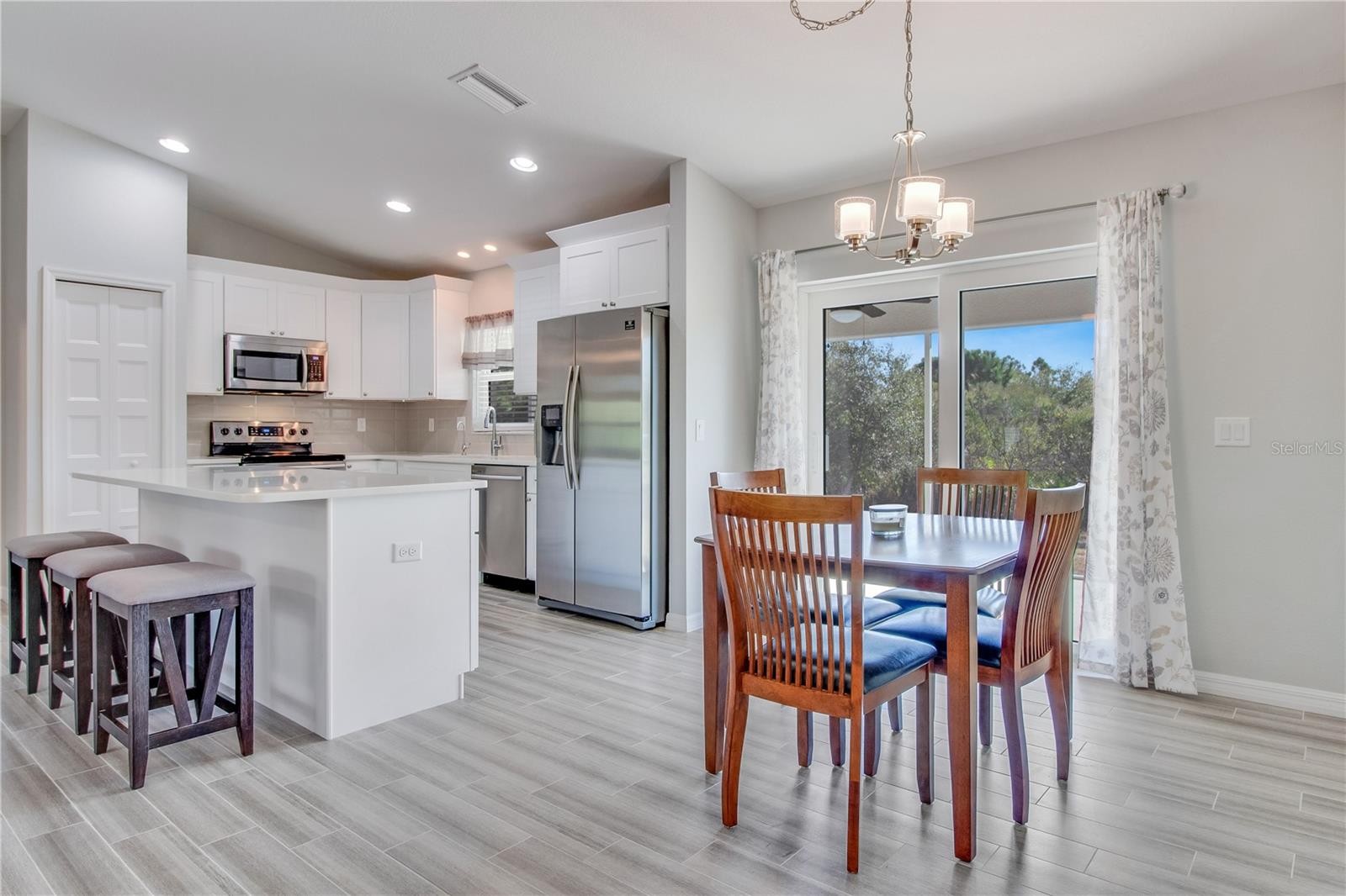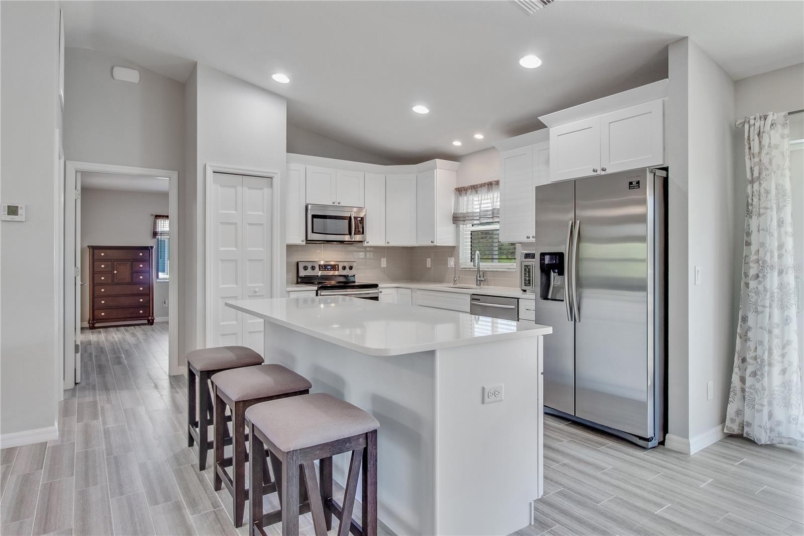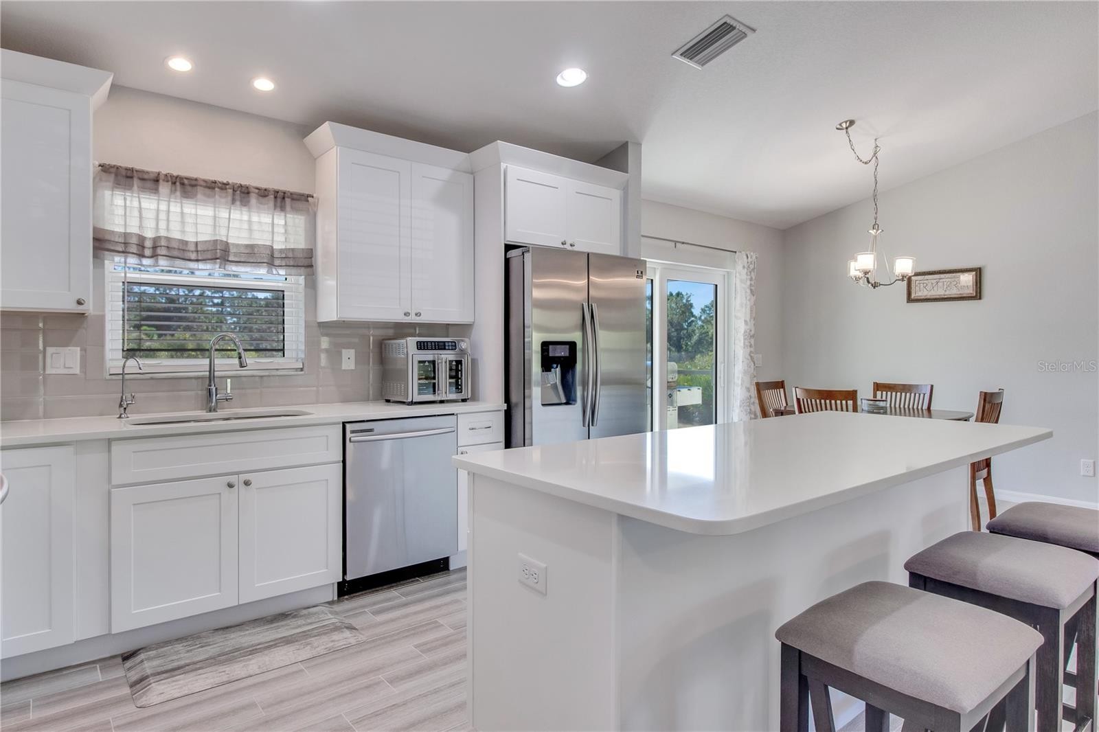 **3D interactive virtual tour available** Welcome to this meticulously maintained and tastefully updated 2020 Walker home, offering 3 bedrooms, 2 bathrooms, and a 2-car garage, perfectly positioned in one of North Port’s most desirable neighborhoods. Built for comfort and peace of mind, this home features full exterior gutters, five-panel interior doors, soft-close cabinetry, regularly serviced A/C and pest control, plus HURRICANE IMPACT WINDOWS AND DOORS throughout. Tucked away on a quiet street and surrounded by nature conservatory lots, the setting offers a true sense of privacy and tranquility. Curb appeal shines with fresh landscaping, decorative pebble rock, exterior lighting, and elegant entry pillars that welcome you home. Step inside and instantly feel at home as you’re greeted by a spacious and open floor plan, featuring high, vaulted ceilings, neutral tones, and wood-plank style porcelain tile runs the entire home making cleaning a breeze and pet friendly. Front windows from the Great Room, allow natural sunlight to shine through. The kitchen is truly the heart of the home, featuring quartz countertops, white cabinetry with decorative molding, a closet pantry, plant shelves, and an under-sink reverse osmosis system. A centrally located island offers additional storage and seating, all beautifully illuminated by recessed lighting. Best of all, the stainless-steel appliances are included. Just off the kitchen, a cozy dining area provides the perfect spot to enjoy your morning coffee while you get ready to start your day. The desirable split-bedroom layout offers privacy for both owners and guests. Guest bedrooms are generously sized with ceiling fans, ample closet space, and natural light. The guest bathroom includes a tiled tub and shower combination, modern vanity, and upgraded lighting. The primary owner’s suite is a relaxing retreat with a walk-in closet and a well-appointed en-suite bath featuring dual vanities, linen closet, and a stunning walk-in shower complete with river stone flooring, built-in niche, and bench seating. A large interior laundry room adjacent to the kitchen provides room for storage and functionality all within your air-conditioned living area. From the dining area, HURRICANE IMPACT sliding glass doors lead to a screened in lanai, a wonderful space to unwind and relax with a good book, all while taking in the serene setting of your spacious backyard with a natural backdrop of sunshine, chirping birds, and mature oaks, which creates a relaxing outdoor retreat. The well-kept, attached two-car garage is well equipped with shelving, wall cabinets, and a workbench with pegboard, perfect for hobbies or weekend projects. With no HOA, no deed restrictions, and no flood zone designation, this home offers exceptional flexibility. Conveniently located near schools, dining, Coco Plum Shopping Center, and the vibrant Wellen Park area featuring the Atlanta Braves Spring Training stadium, dining, fishing pier, and weekly Sunday farmers market. Easy access to I-75 and US-41 puts you just a short drive from some of Florida’s most beautiful beaches. Whether you are searching for a full-time residence or a seasonal escape, this beautifully cared-for home delivers comfort, style, and functionality in a prime location. Schedule your showing today and start your next chapter here.