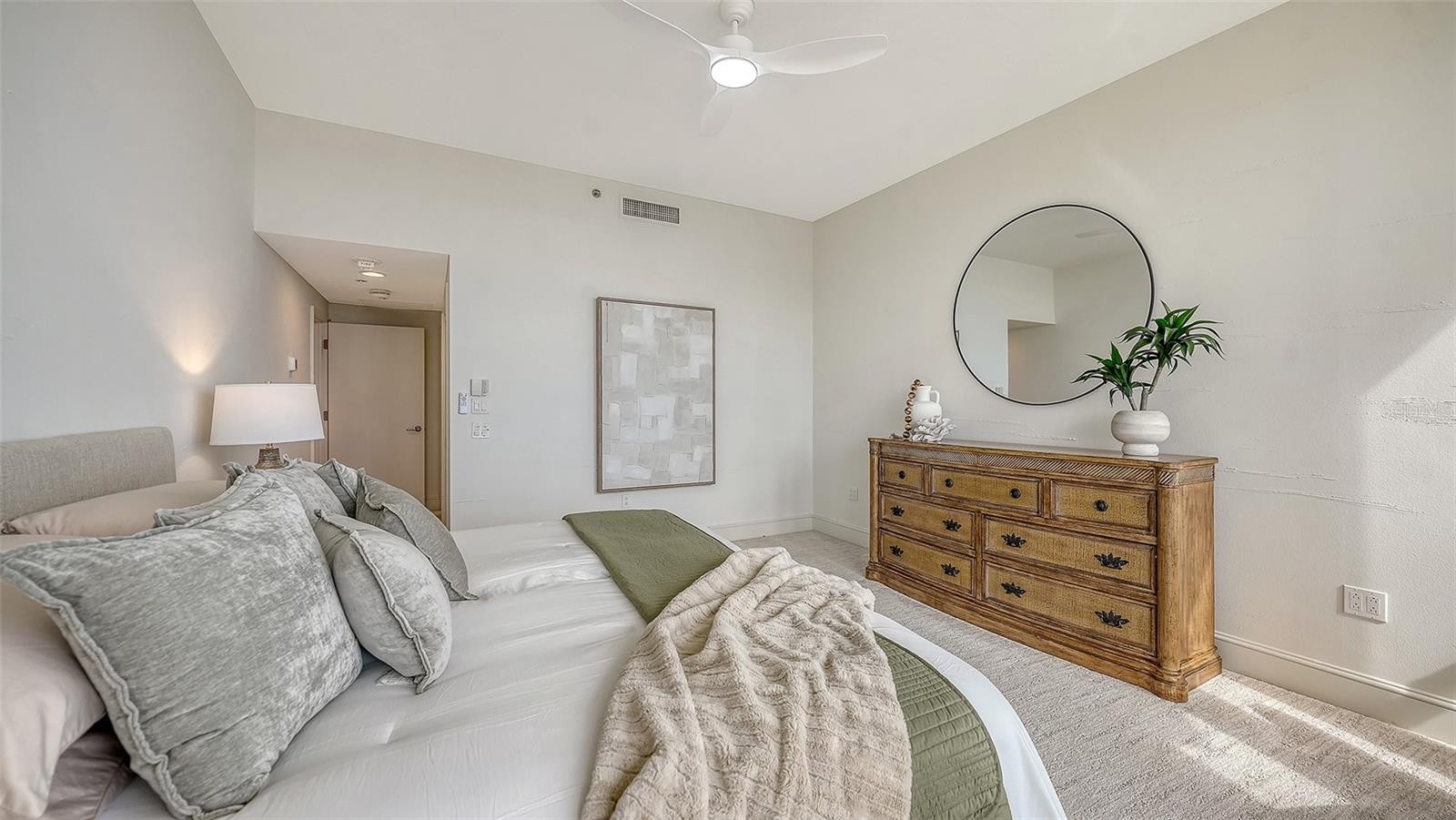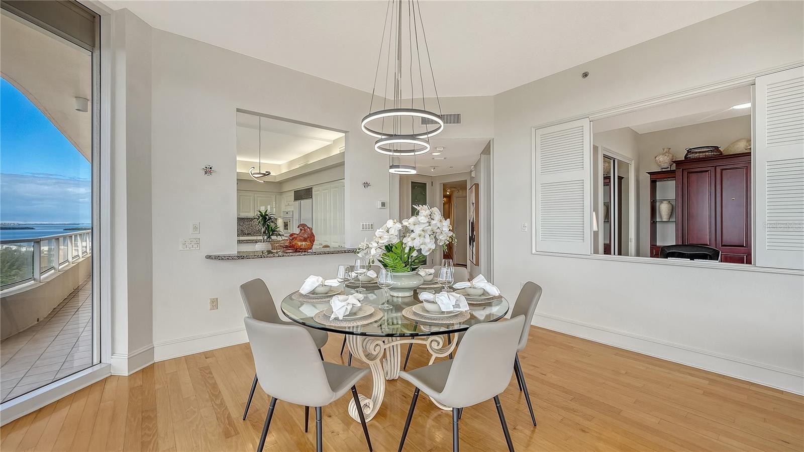 Positioned high on the south side and 9th floor of Building One, this turnkey-furnished residence at Grand Bay offers expansive Sarasota Bay, golf course and downtown views, refined interiors, and effortless resort living on Longboat Key. Spanning nearly 2,300 square feet, the open layout is framed by walls of glass and a wraparound terrace with access from nearly every room—creating a seamless connection between indoor spaces and the ever-changing water views below. Recently refreshed with new contemporary furnishings included, the residence is truly move-in ready. The spacious great room flows naturally into the dining area and kitchen, creating an inviting setting for entertaining or relaxed daily living. Floor-to-ceiling glass sliders bring in abundant natural light while showcasing views of the bay, marina, and downtown Sarasota. The primary suite is a private retreat with terrace access, generous closet space, and a well-appointed en-suite bath. Two additional bedrooms provide flexibility for guests, office use, or extended stays, each positioned to enjoy natural light and views. Electric storm shutters throughout offer convenience and peace of mind. This residence includes two deeded parking spaces and an additional storage unit, a valuable combination rarely available at this elevation. Grand Bay is one of Longboat Key’s most sought-after gated communities, offering residents a full suite of resort-style amenities including two heated swimming pools with sundecks, Har-Tru tennis courts, a modern fitness center, clubhouse, and an active social calendar. On-site management and 24-hour security ensure a well-maintained, secure environment. As an exclusive benefit, owners enjoy deeded access to the private Bay Isles Beach Club, where Gulf-front pavilions, grilling areas, and pristine shoreline create the perfect setting for beach days and sunset gatherings. Located behind the gates of Bay Isles, Grand Bay balances privacy with proximity. Just minutes away are the boutiques and restaurants of St. Armands Circle, the cultural offerings of downtown Sarasota, championship golf and marina access at Harbourside, and the beaches of Lido and Siesta Key. From boating and tennis to theater, dining, and art, this residence places the best of Sarasota living within easy reach. A rare opportunity to enjoy turnkey bayfront living in one of Longboat Key’s premier communities.