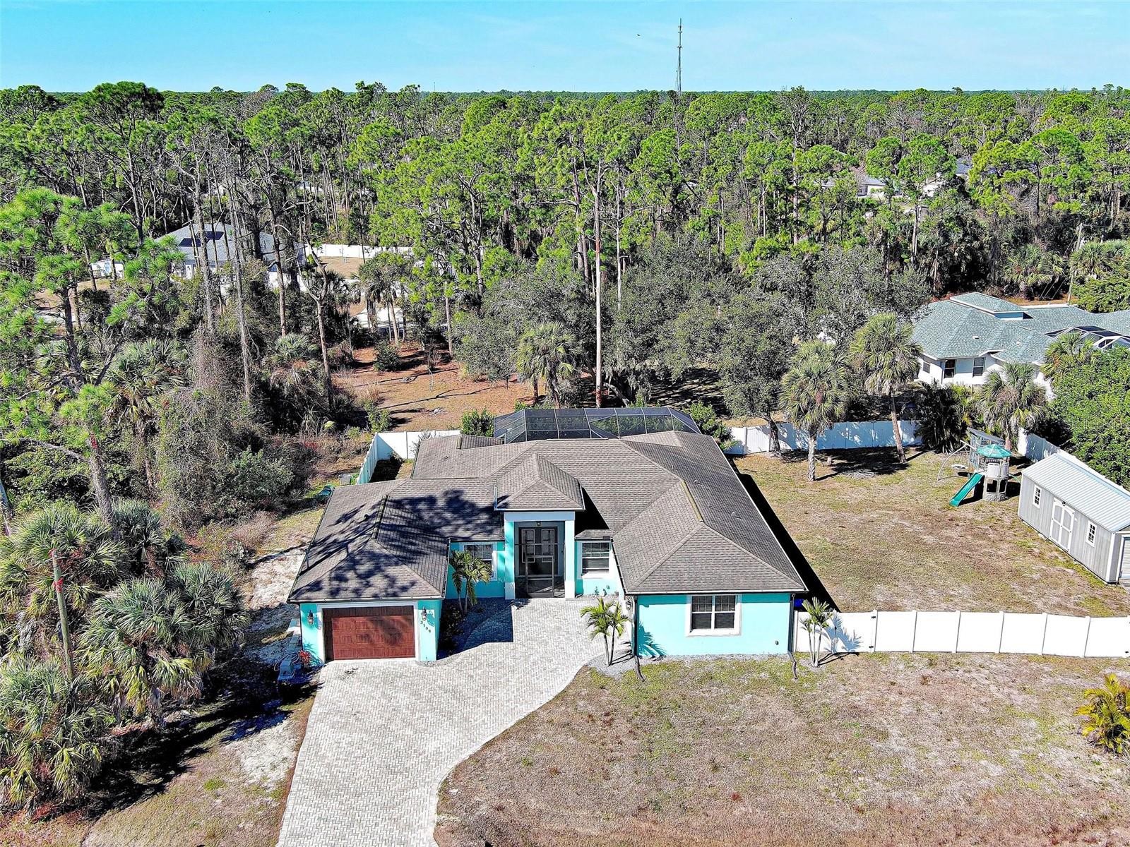 Welcome to this 2018 custom-built home located in the ever-growing City of North Port! This stunning residence offers 4 bedrooms, 3 full bathrooms, and 2,337 square feet on an expansive 0.47-acre lot, creating the perfect setting for comfortable living, entertaining, and embracing the Florida lifestyle. A paver driveway and paver entryway enhance the home’s curb appeal and welcoming first impression. The open-concept design connects the great room, dining area and kitchen. Upon entry, the den offers flexible options such as a home office, study, or gym. Stone countertops, stainless steel appliances, an oversized island, along with a built-in buffet and additional storage complete this chef-inspired kitchen. The primary suite serves as a retreat, featuring sliding glass doors leading to the lanai, a walk-in closet, an ensuite bathroom with dual vanities, a walk-in shower, and a relaxing soaking tub. Two generously sized guest bedrooms provide abundant natural light and ample storage. This home includes a separate in-law suite, ideal for multigenerational living or hosting extended guests. This private space features a living room, kitchenette, bedroom, bathroom, private patio access, and its own attached garage, offering comfort and independence. Step outside to your oasis, highlighted by a Stonescapes heated saltwater pool with a mosaic mermaid design and a 6-jet spa. Entertaining is effortless with the outdoor kitchen, while the fully screened lanai provides the perfect setting to relax and enjoy peaceful yard views. Additional features include a vinyl-fenced yard and storage shed for added convenience. Ideally located minutes from the future Sarasota Memorial Hospital, shopping, dining, and I-75, this home offers convenient access to Gulf beaches approximately 25 miles away and within one hour from Sarasota and Fort Myers airports. Schedule your private showing today!
