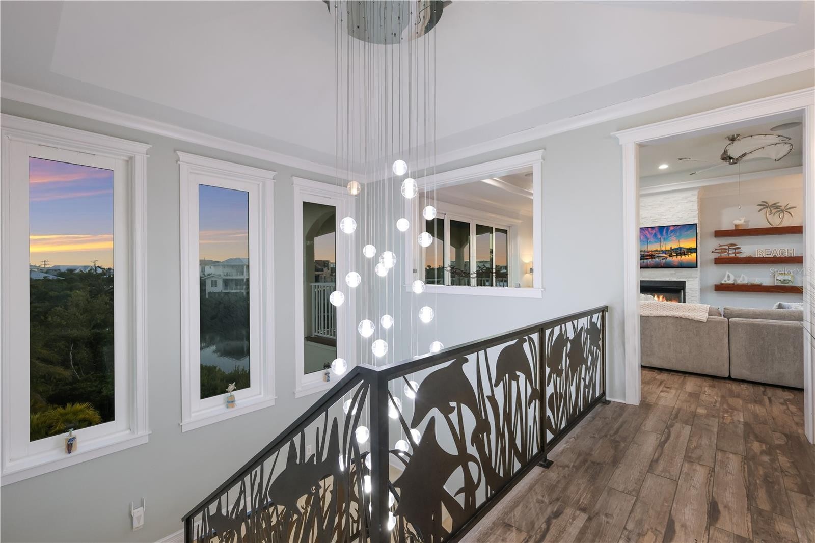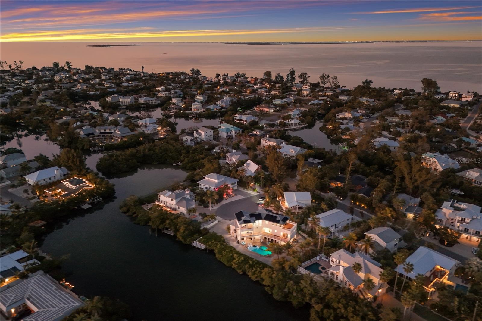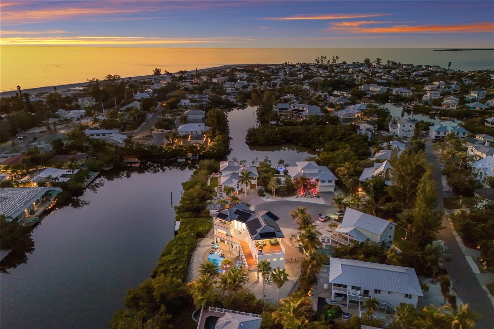 This waterfront coastal retreat embodies refined island luxury, offered completely turnkey and thoughtfully designed for both elevated living and exceptional entertaining. Positioned on a quiet cul-de-sac the home makes an immediate impression with its stately architecture, paver driveway, lush tropical landscaping, and landscape lighting that beautifully illuminates the property at dusk. Inside, travertine flooring flows throughout, complemented by crown molding in every room and tray ceilings that add architectural depth and sophistication across all three levels. The top floor serves as the heart of the home, where an expansive living and dining area is framed by large sliders that capture vibrant sunset skies and lead to two generous balconies, seamlessly blending indoor and outdoor living. The chef’s kitchen is a showpiece, appointed with premium Monogram appliances, a professional gas range with pot filler, custom cabinetry, striking backsplash detail, and abundant counter space designed for effortless entertaining. The living room offers an abundance of natural light that frames a beautiful fireplace adding an elevated ambiance. Designer lighting, custom stair railings, and carefully curated finishes create a cohesive coastal elegance that feels both polished and welcoming. The mid-level hosts 4 spacious bedrooms enhanced with shiplap accent walls in select rooms, adding warmth and texture, along with a comfortable family room that opens to an oversized balcony overlooking the tranquil bayou. A private elevator provides convenient access to every floor, while modern enhancements including a security system, Sonos sound system inside and out, solar panels, and a tankless hot water heater deliver efficiency and peace of mind. Outdoors, the property transforms into a true waterfront oasis featuring a sparkling heated pool and spa, fire features, expansive paver deck, screened-in patio lounge area, and multiple covered spaces ideal for year round enjoyment. The private dock is equipped with electric and water, offering boating access and completing the ultimate Florida lifestyle experience. The pass-through two car garage, paired with separate storage rooms is designed to accommodate lifestyle amenities and the home’s location within a short-term rental zone presents outstanding investment potential. From sunrise coffee on the balcony to sunset reflections dancing across the bayou, every detail of this exceptional residence has been thoughtfully designed to capture the very best of coastal living.