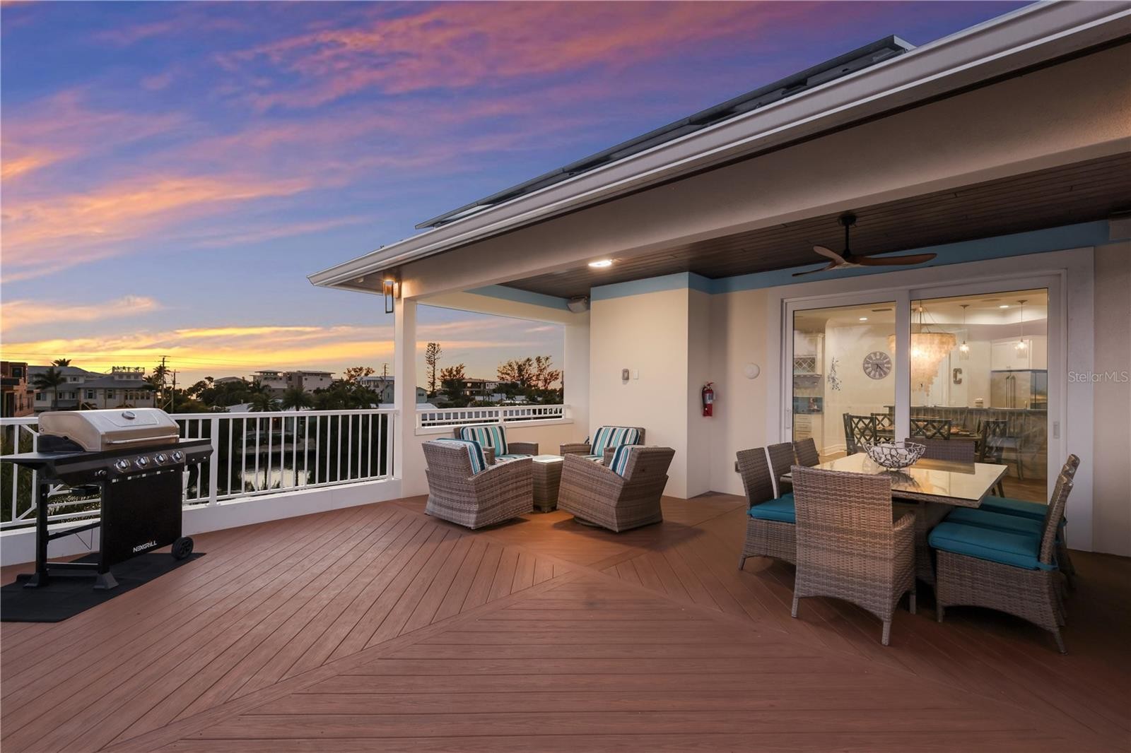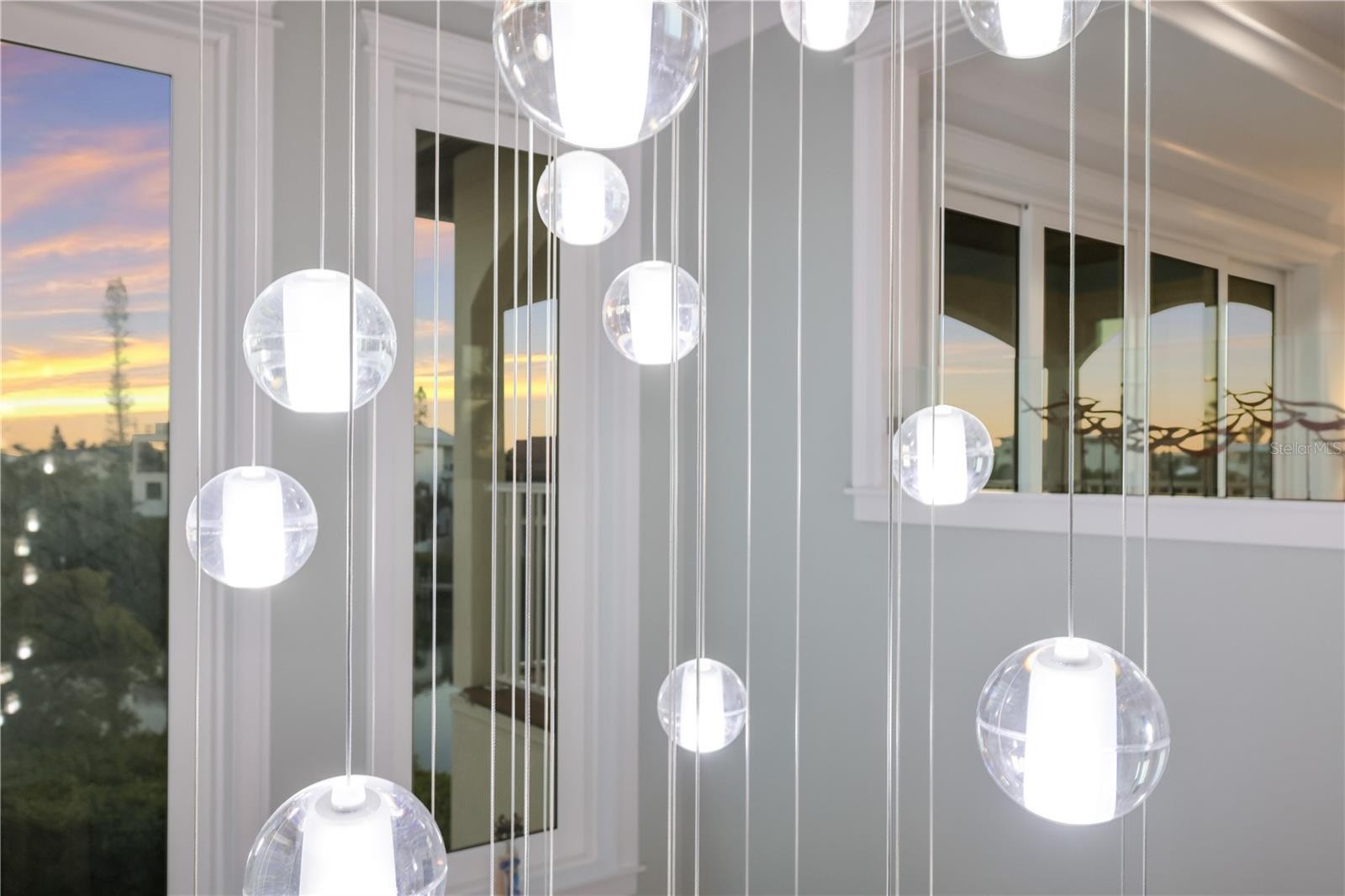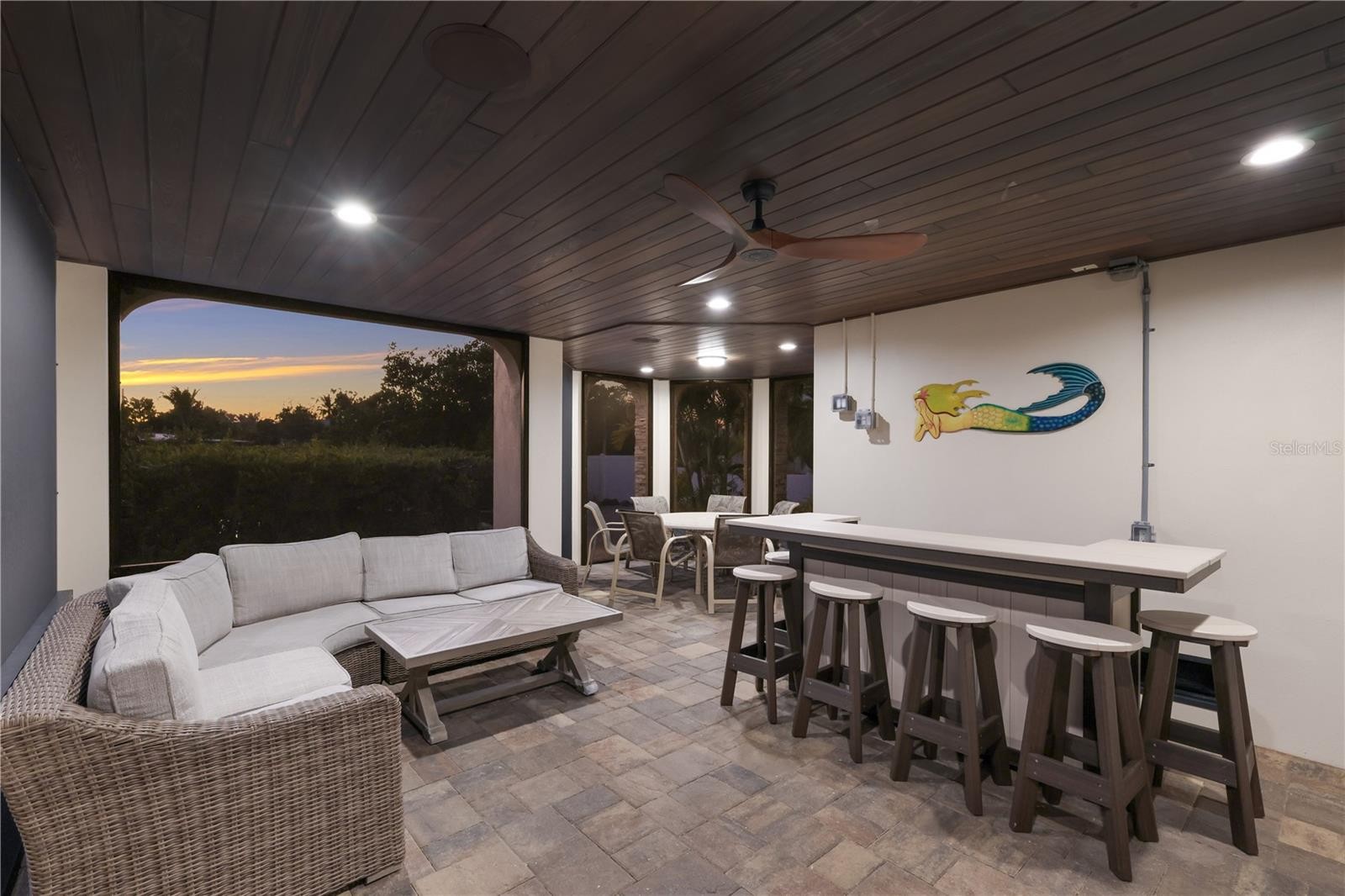 This waterfront coastal retreat embodies refined island luxury, offered completely turnkey and thoughtfully designed for both elevated living and exceptional entertaining. Positioned on a quiet cul-de-sac the home makes an immediate impression with its stately architecture, paver driveway, lush tropical landscaping, and landscape lighting that beautifully illuminates the property at dusk. Inside, travertine flooring flows throughout, complemented by crown molding in every room and tray ceilings that add architectural depth and sophistication across all three levels. The top floor serves as the heart of the home, where an expansive living and dining area is framed by large sliders that capture vibrant sunset skies and lead to two generous balconies, seamlessly blending indoor and outdoor living. The chef’s kitchen is a showpiece, appointed with premium Monogram appliances, a professional gas range with pot filler, custom cabinetry, striking backsplash detail, and abundant counter space designed for effortless entertaining. The living room offers an abundance of natural light that frames a beautiful fireplace adding an elevated ambiance. Designer lighting, custom stair railings, and carefully curated finishes create a cohesive coastal elegance that feels both polished and welcoming. The mid-level hosts 4 spacious bedrooms enhanced with shiplap accent walls in select rooms, adding warmth and texture, along with a comfortable family room that opens to an oversized balcony overlooking the tranquil bayou. A private elevator provides convenient access to every floor, while modern enhancements including a security system, Sonos sound system inside and out, solar panels, and a tankless hot water heater deliver efficiency and peace of mind. Outdoors, the property transforms into a true waterfront oasis featuring a sparkling heated pool and spa, fire features, expansive paver deck, screened-in patio lounge area, and multiple covered spaces ideal for year round enjoyment. The private dock is equipped with electric and water, offering boating access and completing the ultimate Florida lifestyle experience. The pass-through two car garage, paired with separate storage rooms is designed to accommodate lifestyle amenities and the home’s location within a short-term rental zone presents outstanding investment potential. From sunrise coffee on the balcony to sunset reflections dancing across the bayou, every detail of this exceptional residence has been thoughtfully designed to capture the very best of coastal living.