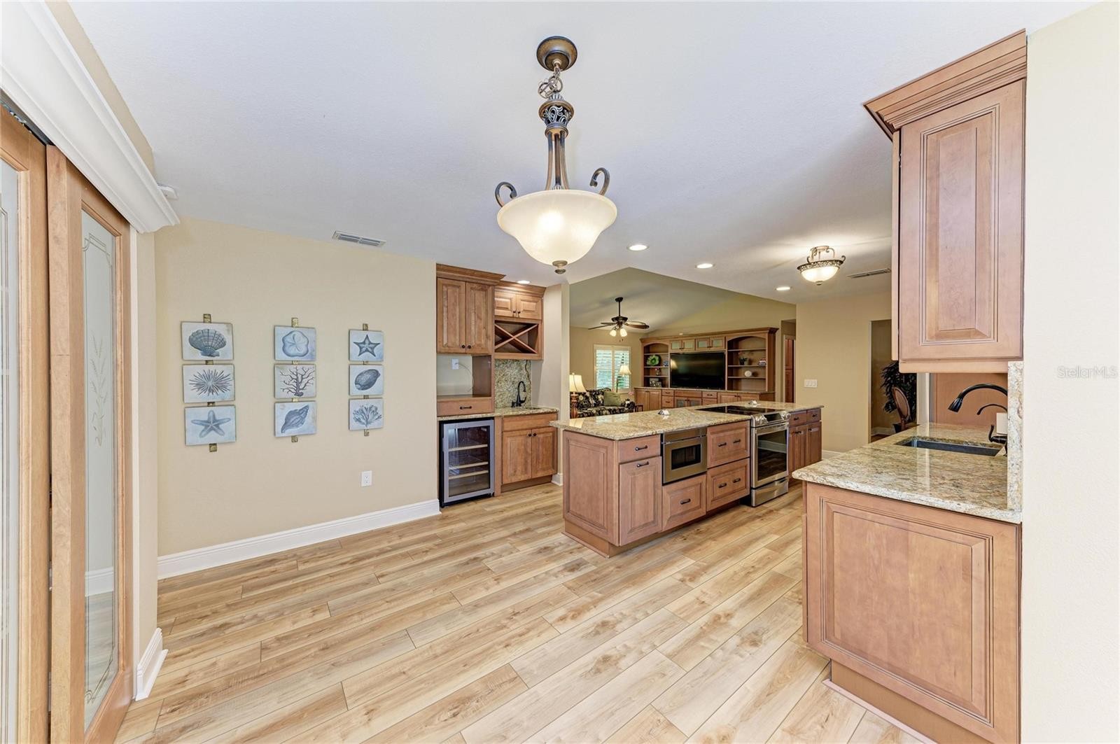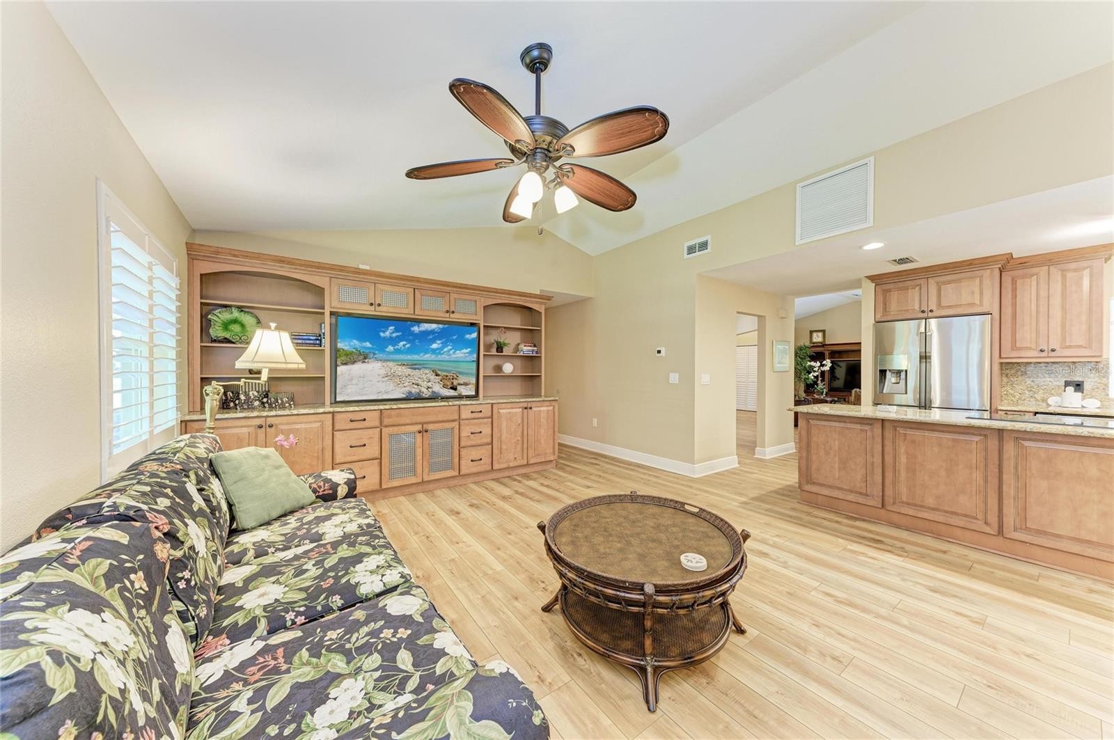 This TURN KEY FURNISHED tile roof home has almost 2300 sq ft of living space in the heart of sunny Venice Florida. There is beautiful high-end Luxury Vinyl Plank flooring throughout, no carpet here. All the interior walls and baseboards are newly painted. There are spacious living areas and a large open dining area great for family gatherings and parties. The 22 ft. open kitchen was completely redone and has many upgrades and special features. There are gorgeous maple cabinets with pullout drawers, granite counters and backsplash, high end appliances, and two pantries spanning an entire wall. There is also a cool coffee/wine wet bar area with its own glass front beverage refrigerator. The air conditioned Sunroom has 4 impact resistant sliding doors that open fully to a private, covered, screened 32 x 17 back lanai. For privacy two motorized shades can fully cover all sliding doors. The master suite includes a large walk-in closet and an updated bath with walk-in shower. The sliding doors provide easy access to the back lanai. The guest room also has a large walk-in closet, upgraded full bath directly across the hall and a pocket door that separates this area from the home creating a secondary suite. This home provides a newer AC system with two UV lights and an automatic I-flow system, new water heater, whole home water filtration/softner system and alarm system coponents. You will love all the great amenities here in this welcoming community including a large pool, spa, gym, tennis, pickleball, library, and a park area. NO CDD FEES here. Venice and the surrounding areas here have so much to offer. Within 5 miles is Nokomis Beach, 7 miles to Manasota Beach, famous Siesta Key Beach is only 22 miles away. Cool Today Baseball and Recreation Park which is only about 7 miles away hosts Spring Training for the Atlanta Braves. There are many unique Boutique shops nearby and waterfront restaurants. And when visitors come to visit, Sarasota International Airport is nearby.