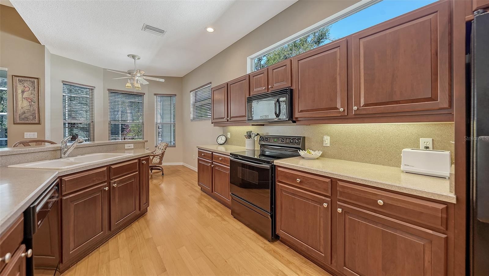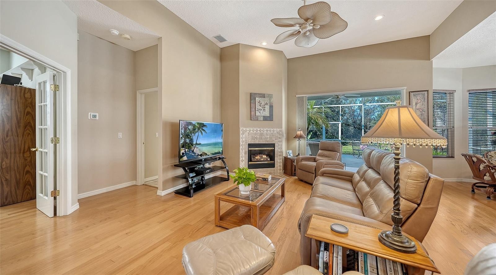Welcome to Oak Court, a private, tree-lined, gated community located less than 4 miles from vibrant downtown Sarasota. Tucked away in a lush, park-like setting, this hidden gem offers a peaceful retreat while remaining centrally located near everything Sarasota has to offer. Well-maintained residence features key updates, including a new A/C system (2022), re-piping (2019), and a roof replaced in 2017. The open floor plan is enhanced by soaring ceilings, 12-ft in the main living areas and 10-ft in the bedrooms, creating a bright and airy feel throughout. Wood flooring and ceramic tile throughout the home. A welcoming living room includes a propane fireplace and sliding glass doors out to the lanai, opening to the kitchen. Solid wood cabinetry, under-cabinet lighting, breakfast bar, and a cozy breakfast nook. Step outside to the extended screened lanai with covered seating area, where tranquil pond views create the perfect space for relaxing or entertaining. A split-bedroom floor plan provides privacy and flexibility. The primary suite features a large walk-in closet, sliding glass doors to the lanai, and an en-suite bath with split vanities, walk-in tiled shower, and a private water closet. Two additional bedrooms and a full bathroom are thoughtfully tucked behind a pocket door, making them ideal for guests or a home office setup. Additional highlights include a two-car garage and an interior laundry room with built-in storage, utility sink, and GE washer and dryer. Oak Court is an intimate, gated community located off of Fruitville Road, offering a heated pool, walking paths, sidewalks, and serene ponds surrounded by mature landscaping. Ideally located near Nathan Benderson Park, University Town Center shopping and dining, downtown Sarasota’s arts and cultural venues, and the world-renowned beaches of Siesta Key.