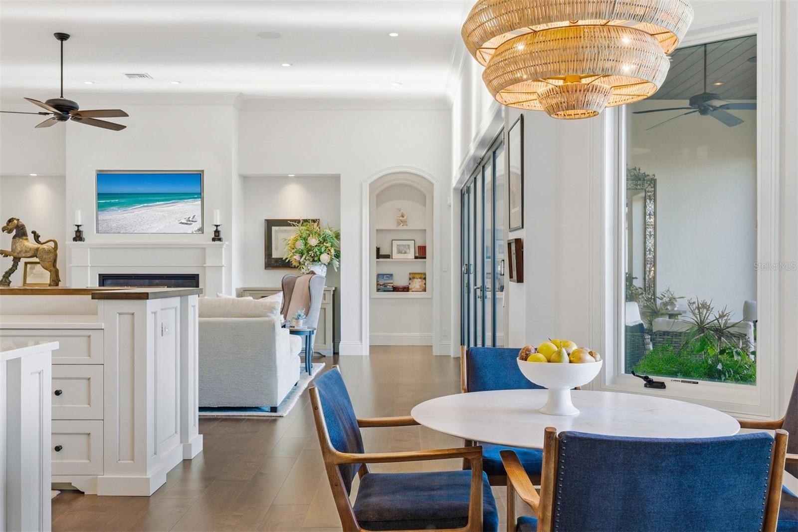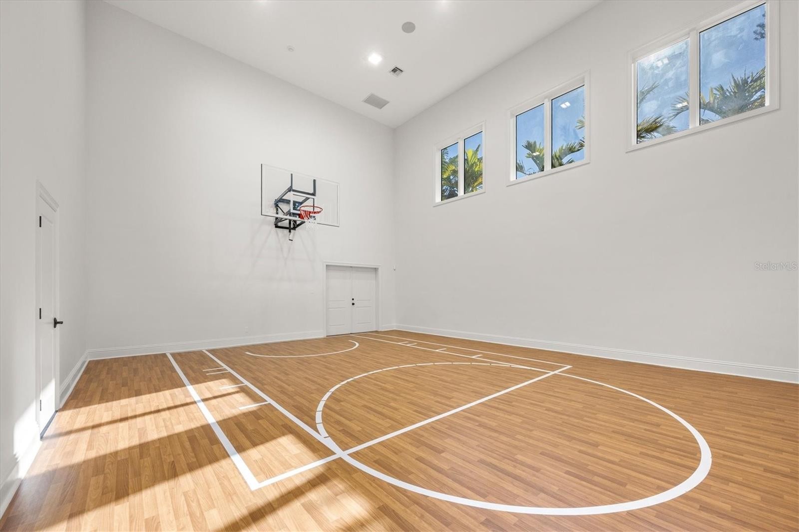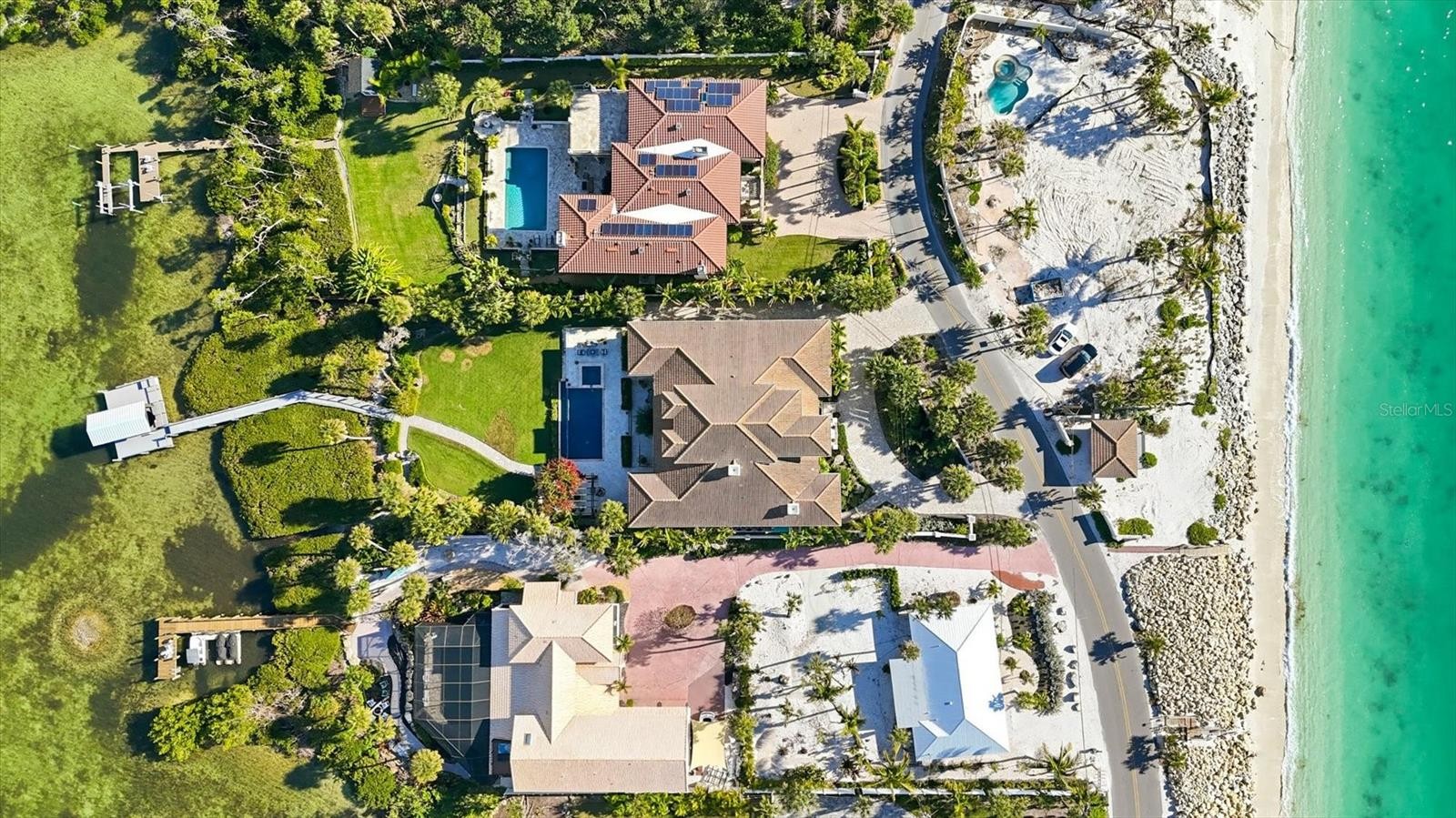 Set along one of Casey Key’s most coveted stretches, 3210 Casey Key Road presents a rare Gulf-to-Bay estate where water defines nearly every moment of daily life. Enjoy your private beach with rare, grandfathered cabana and your private bay frontage with dock and irreplaceable covered boat lift. Spanning almost 5,400 square feet under air across three-plus levels, this 2018-built residence offers four bedrooms, four full baths, a powder bath, multiple living and bonus spaces and, last but not least, an indoor half basketball court, all framed by impact-rated glass and serviced by a three-stop elevator. Arrival begins through a lushly landscaped circular motor court leading to a coastal-inspired façade and a covered entry accented by wood inlay ceilings. Inside, engineered wood floors, crown molding, and curated architectural details introduce interiors that balance sophistication with warmth. The dining room captures Gulf views through an oversized window, while the library doubles as a refined retreat with beamed ceilings, built-ins, a fireplace, and French doors opening to a Gulf-facing terrace. At the heart of the home, the great room unfolds around a stone-clad fireplace and opens through Euro-wall glass doors to expansive outdoor living. The chef’s kitchen is both beautiful and highly functional, anchored by two oversized islands and finished with quartz countertops, tile backsplash, custom cabinetry, and a premier appliance suite including Wolf, Sub-Zero, Miele, and Vent-A-Hood. A walk-in pantry with additional prep space, a light-filled breakfast nook overlooking the bay, and a well-appointed laundry room complete the main living level. Two private primary suites on the main floor offer exceptional flexibility, each opening to terraces with pool and Intracoastal views. One features a steam shower and tailored walk-in closet, while the other is styled as a spa retreat with chandelier-lit marble finishes, a freestanding soaking tub, and a custom-designed dressing room. Upstairs, a lounge-style bonus room with wet bar and Gulf views creates an ideal gathering space, accompanied by two guest suites, both enjoying tranquil Intracoastal outlooks. The expansive lower level introduces remarkable versatility, with bonus living areas including a dedicated craft room and extensive storage rarely found in coastal homes. An indoor half-court basketball court makes this amenity driven property even more interesting. Outside, the estate truly comes into its own. A heated saltwater infinity-edge pool and spa anchor the backyard, complemented by an outdoor kitchen, pergola with gas firepit, outdoor shower, and pass-through bar for effortless entertaining. A Trex boardwalk leads to the dock and rare and irreplaceable covered boat lift, offering direct Gulf-to-Bay boating with no fixed bridges. On the beach side, a grandfathered cabana is the perfect venue for enjoying specular everyday sunsets. Situated on approximately 0.82 acres, the property provides both scale and privacy, framed by mature landscaping and sweeping water views on both sides. Set on the serene barrier island of Casey Key, this Gulf-to-Bay estate offers effortless access to boating, beach, and the dining and cultural scenes of Venice and Sarasota. More than a home, 3210 Casey Key Road is a refined coastal retreat where sophisticated interiors, resort-style amenities, and exceptional waterfront living come together.