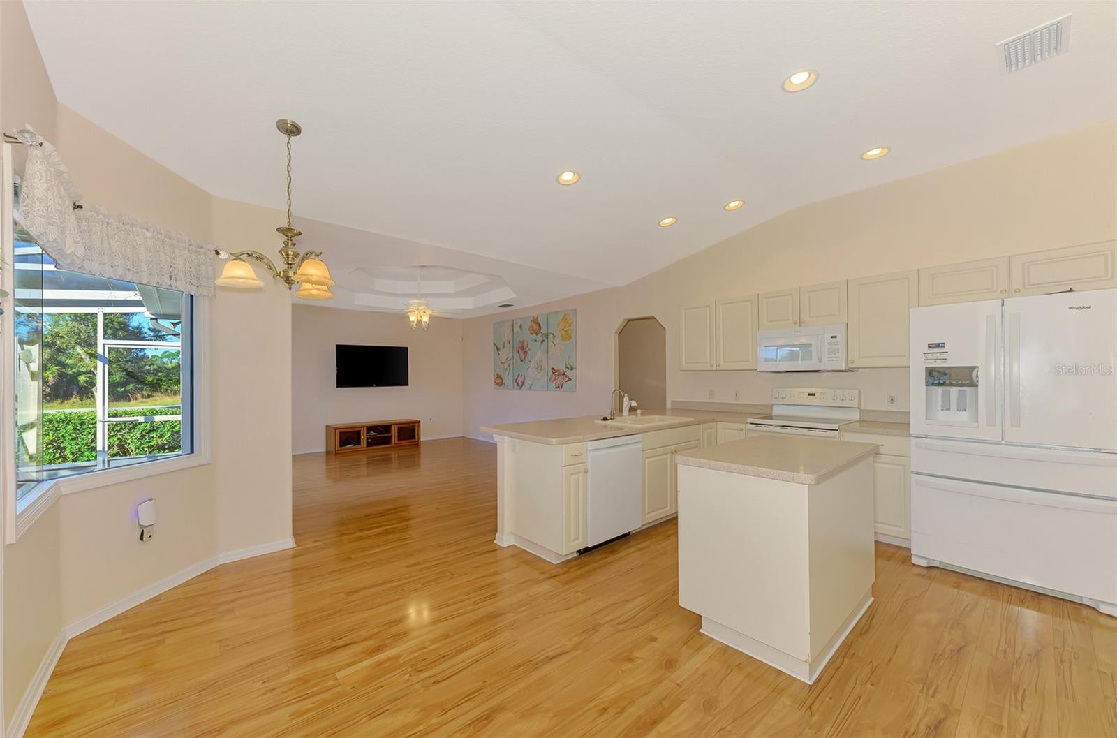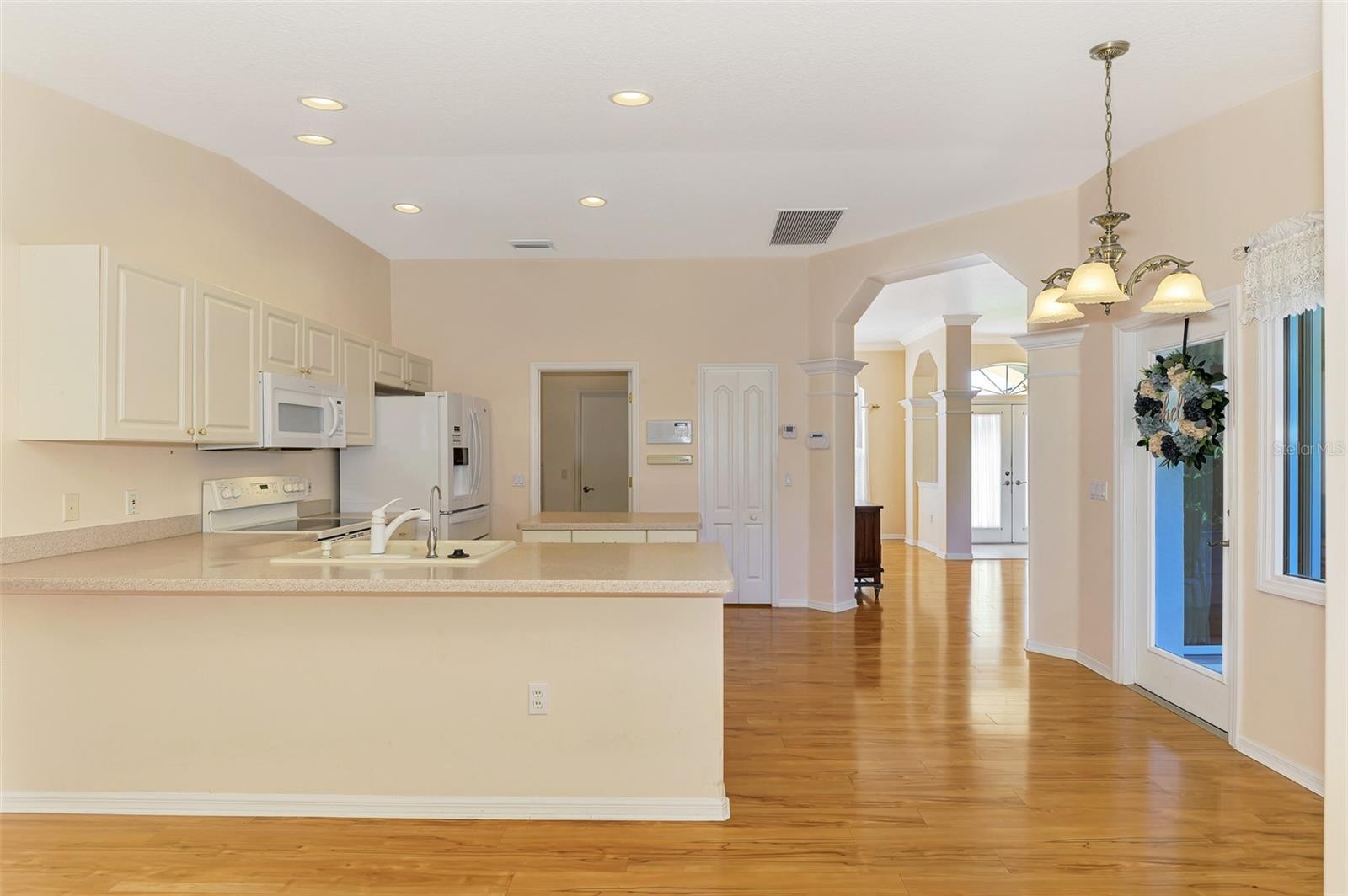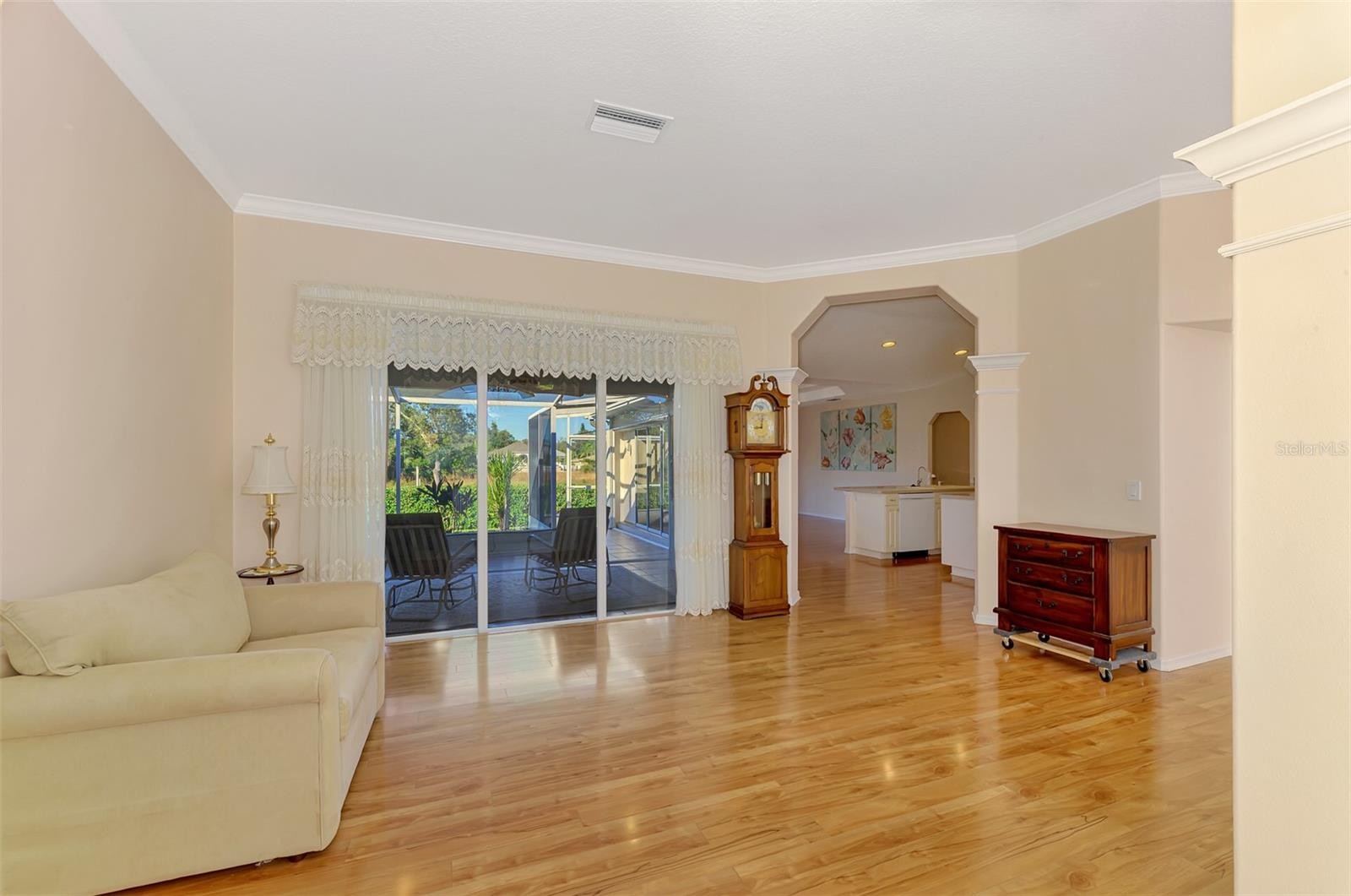 Under contract-accepting backup offers. WARM MINERAL SPRINGS BEAUTY! This exceptional 3-bedroom, 2-bath, 2-car garage home in peaceful Warm Mineral Springs is truly a showpiece of quality and care. With its impressive pillared double-door entry, beautiful landscaping, and a sidewalk that wraps around the property, this residence blends elegance with comfort from the moment you arrive. A new roof (2022) adds lasting value and peace of mind, while accordion hurricane shutters provide full protection for every window and door. Step inside and feel the bright, airy flow of the 1,808 sq. ft. split floor plan, filled with thoughtful upgrades. A sparkling Murano crystal chandelier greets you in the foyer, setting the tone for the formal living and dining rooms that feature crown molding, volume ceilings, and sliding glass doors leading to the lanai. The arched entryway to the kitchen adds architectural charm, while the kitchen itself is a chef’s delight—complete with solid-surface countertops, recessed lighting, a new dishwasher (2023), center island, lazy Susan, and a reverse osmosis purification system under the sink. Enjoy breakfast by the Aquarium glass window dinette, where sunlight pours in and a door opens to your covered lanai. The family room is the perfect gathering space, highlighted by an eye-catching octagon double tray ceiling and sliding doors to the tiled patio. The master suite impresses with its 21-foot length, tray ceiling, French doors, and two walk-in closets. The ensuite bath offers dual sinks, a walk-in shower with grab bars, and ceramic tile flooring. Additional features include a new hot water heater (Aug 2024), indoor laundry room with washer, dryer, and built-in sink, and laminate wood flooring throughout most of the home. The expanded screened lanai wraps around the back, creating a perfect space to relax, grill, or garden, complete with a drip system for plants. Extras abound—intercom and security systems, Rain Bird irrigation, Culligan water softener and chlorinator, 240-volt garage outlet, and garage screen doors. All just minutes from Wellen Park, Atlanta Braves’ stadium, shopping, dining, and the white-sand Gulf beaches only 20 minutes away. Experience true pride of ownership in this Warm Mineral Springs gem—a home that combines timeless beauty, comfort, and convenience in one incredible package.
