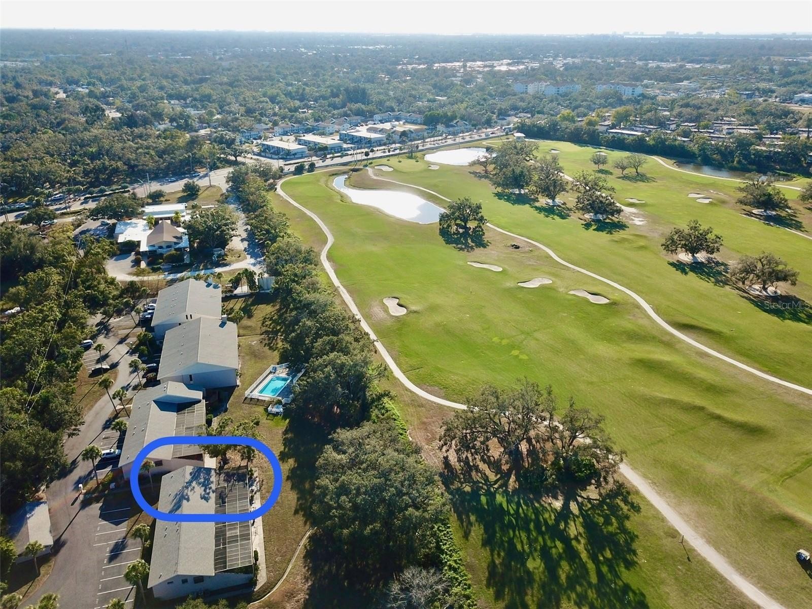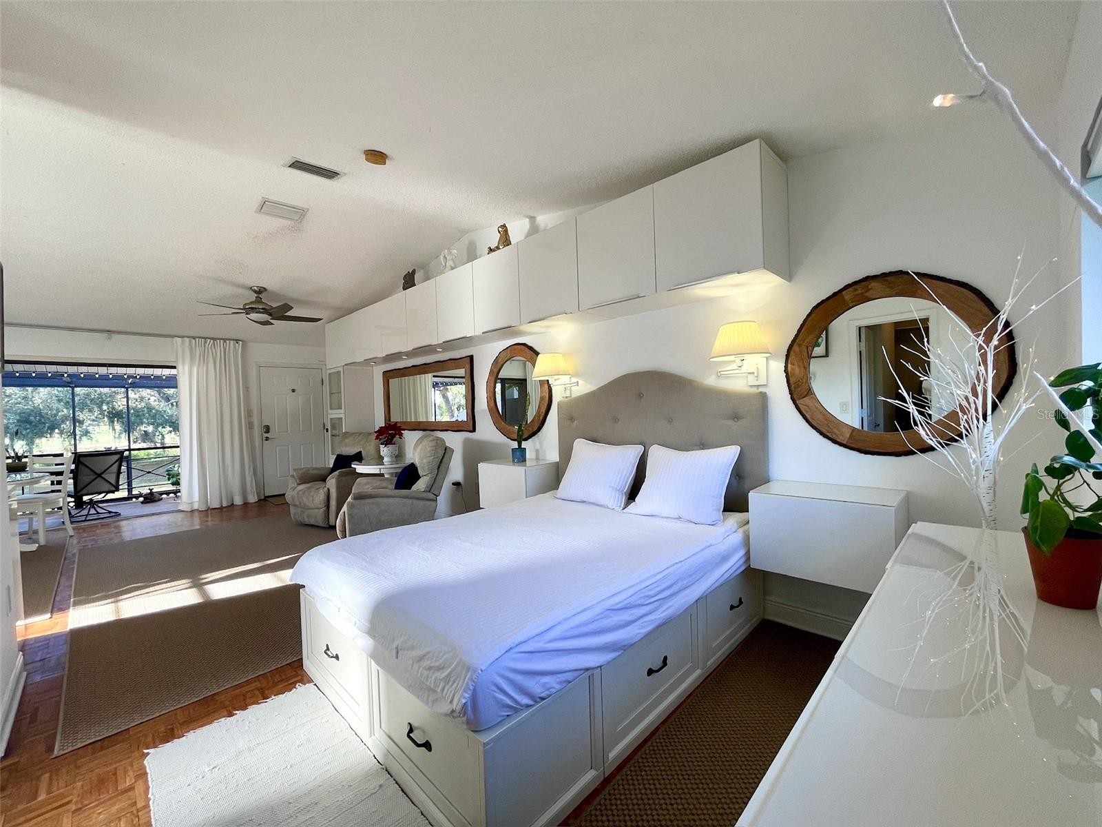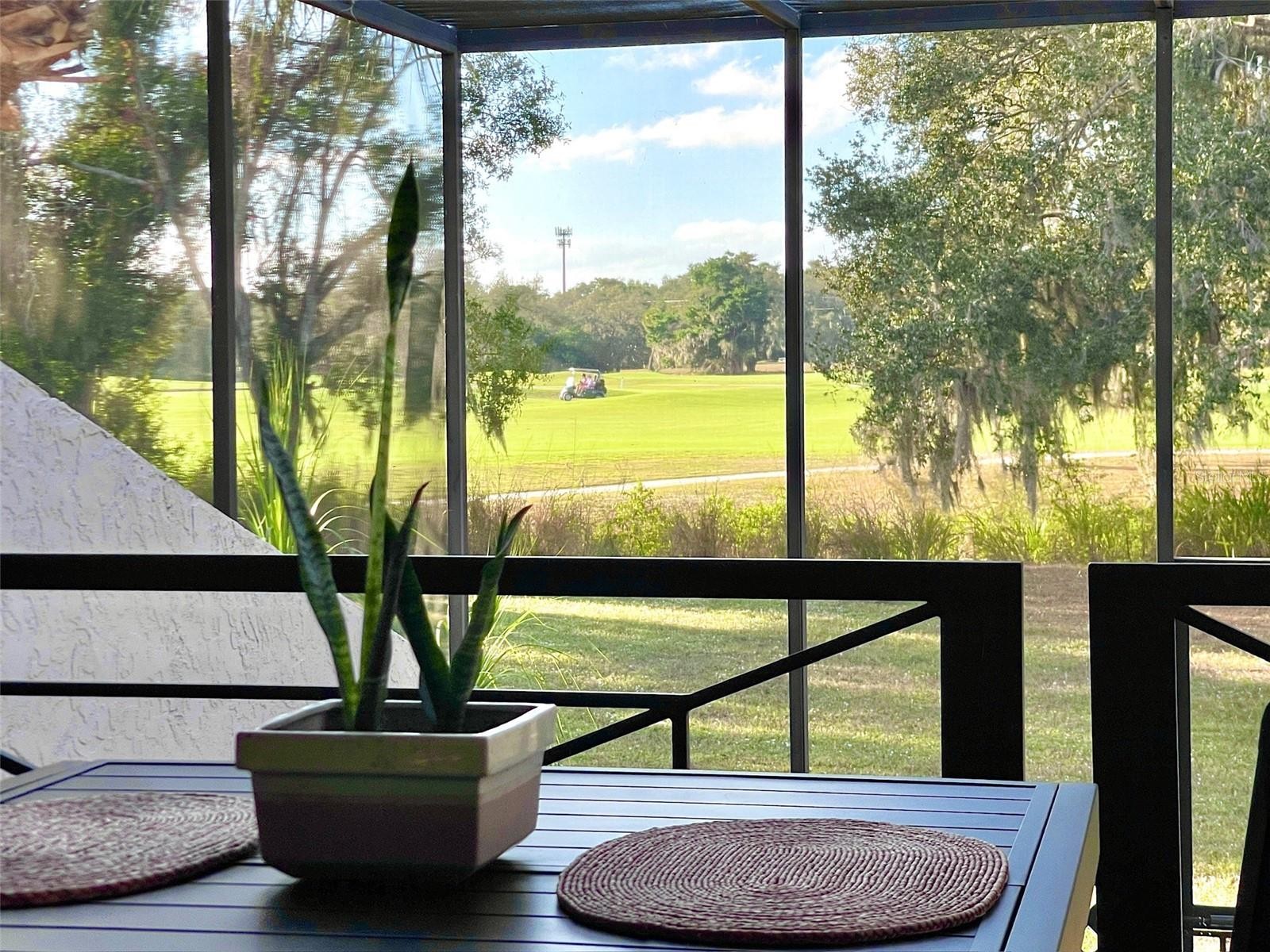 RARE GARDEN-STYLE END UNIT IN THE HIDEAWAY. This elevated condo lives like a private row-house, offering 954 total usable sq ft when including the expansive outdoor spaces. Enter through a 450-sq-ft fully screened and paved courtyard, then step up to an upper wood deck connected to the interior by a 12-ft wide sliding glass doors, creating a seamless indoor-outdoor lifestyle that feels far larger than the 504-sq-ft interior. Inside, cathedral ceilings, extra side windows, and an open floor plan fill the space with light and air. European-inspired parquet wood floors, built-in furnishings, a walk-in closet for storage, and a bright tiled bathroom complement the minimalist, thoughtfully designed layout. Enjoy panoramic views of the newly rebuilt Bobby Jones Golf Course, with majestic oak trees and a gentle creek providing a natural privacy buffer. Exceptionally rare parking includes two assigned open spaces plus one private carport—1 of only 4 in the entire association—located directly behind the unit. The Hideaway is a maintenance-free, pet-friendly community allowing two pets up to 40 lbs, featuring two pools and condo fees that include exterior maintenance and water. A truly unique offering ideal for those who value outdoor living, privacy, and efficient design in a prime Sarasota location.
