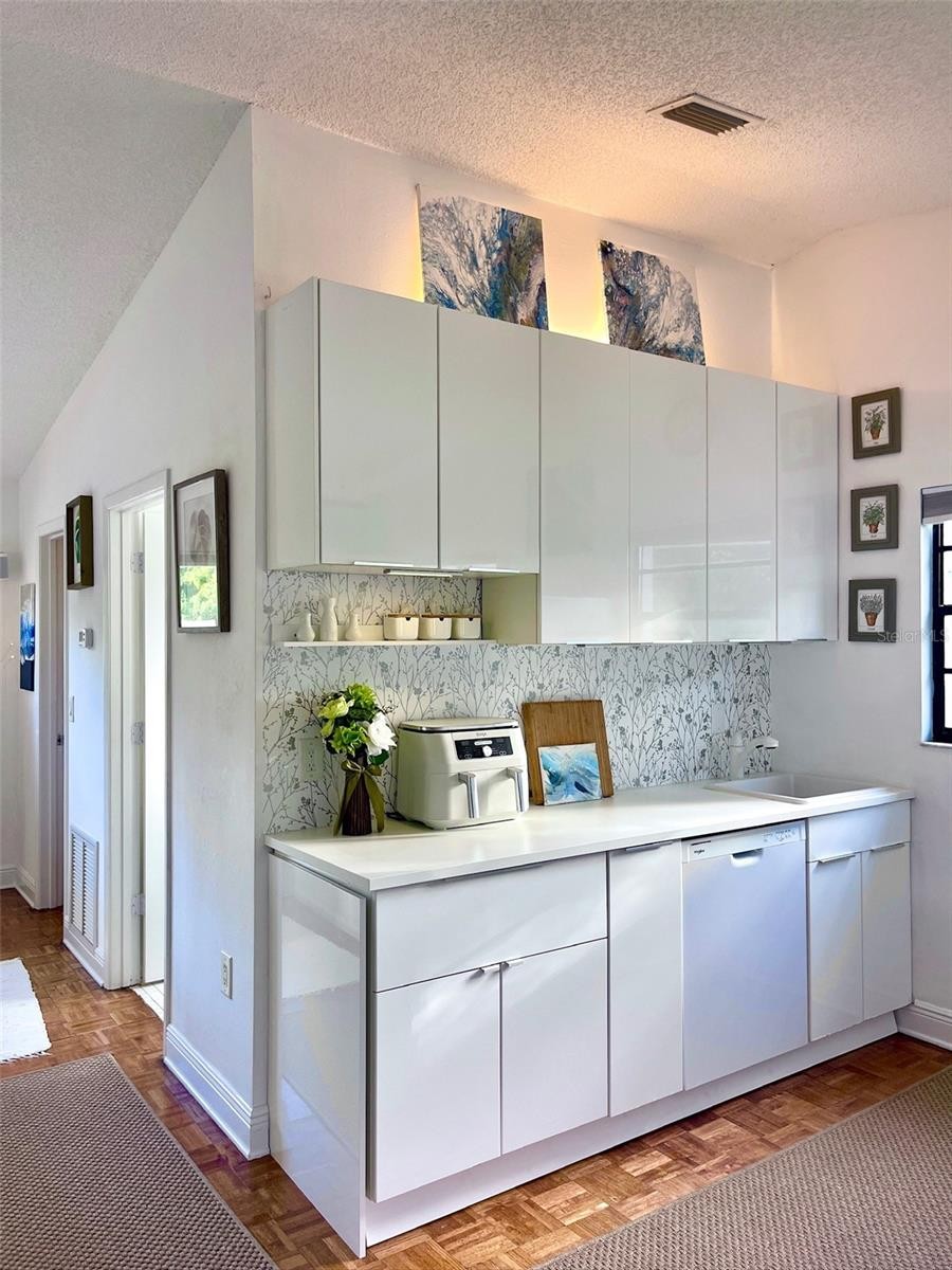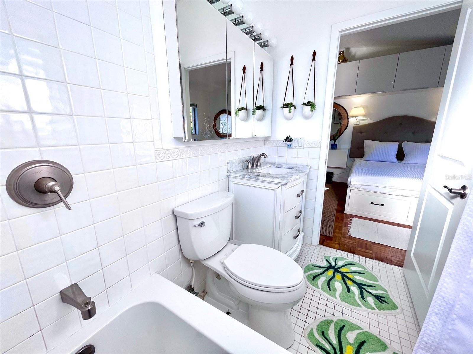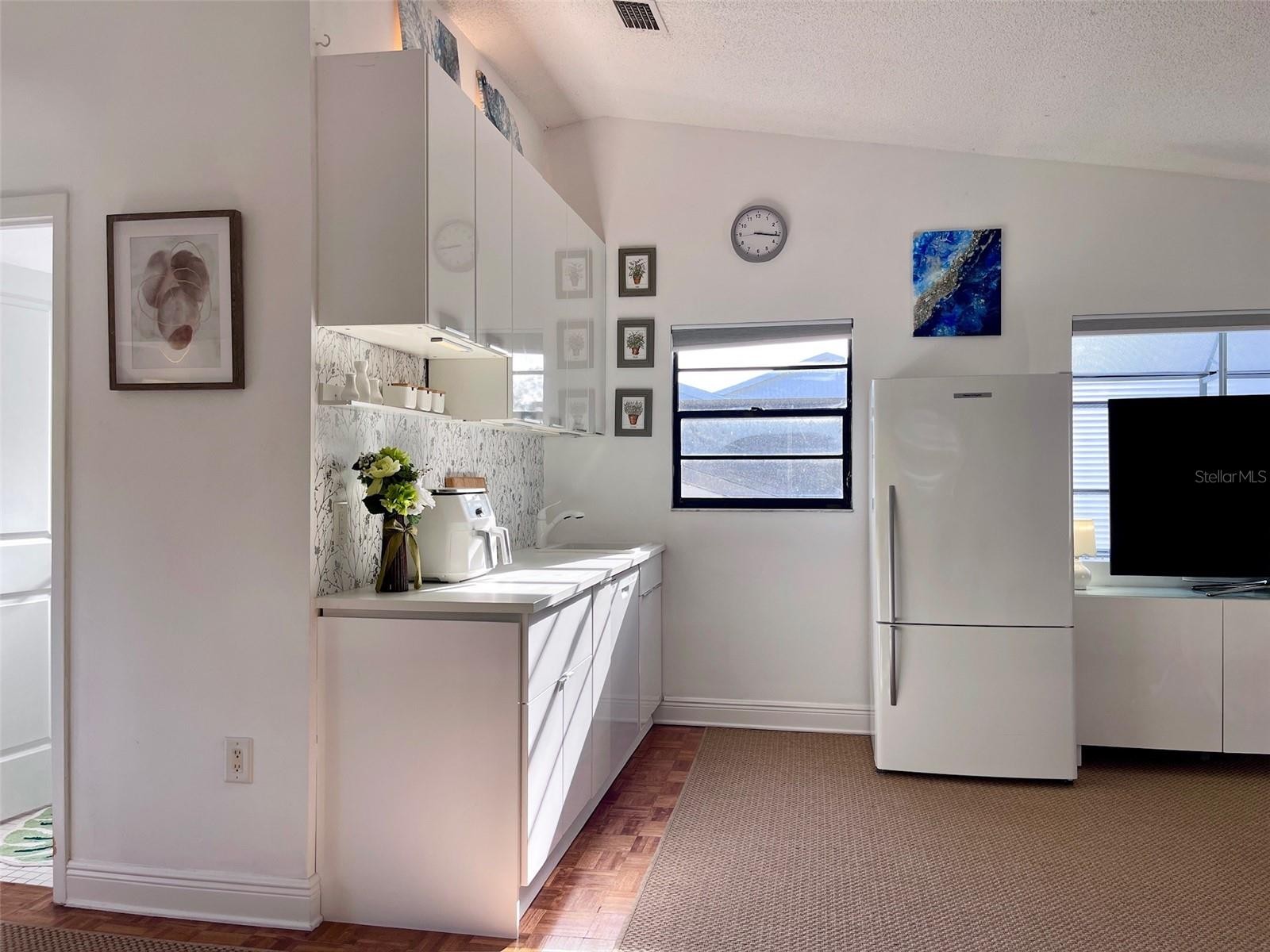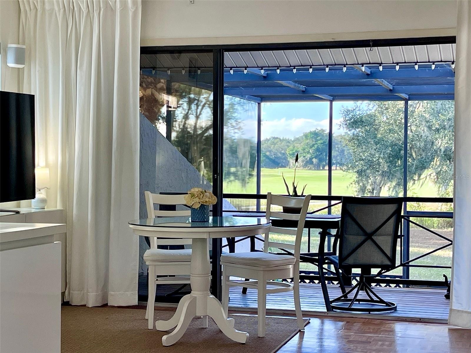 RARE GARDEN-STYLE END UNIT IN THE HIDEAWAY. This elevated condo lives like a private row-house, offering 954 total usable sq ft when including the expansive outdoor spaces. Enter through a 450-sq-ft fully screened and paved courtyard, then step up to an upper wood deck connected to the interior by a 12-ft wide sliding glass doors, creating a seamless indoor-outdoor lifestyle that feels far larger than the 504-sq-ft interior. Inside, cathedral ceilings, extra side windows, and an open floor plan fill the space with light and air. European-inspired parquet wood floors, built-in furnishings, a walk-in closet for storage, and a bright tiled bathroom complement the minimalist, thoughtfully designed layout. Enjoy panoramic views of the newly rebuilt Bobby Jones Golf Course, with majestic oak trees and a gentle creek providing a natural privacy buffer. Exceptionally rare parking includes two assigned open spaces plus one private carport—1 of only 4 in the entire association—located directly behind the unit. The Hideaway is a maintenance-free, pet-friendly community allowing two pets up to 40 lbs, featuring two pools and condo fees that include exterior maintenance and water. A truly unique offering ideal for those who value outdoor living, privacy, and efficient design in a prime Sarasota location.