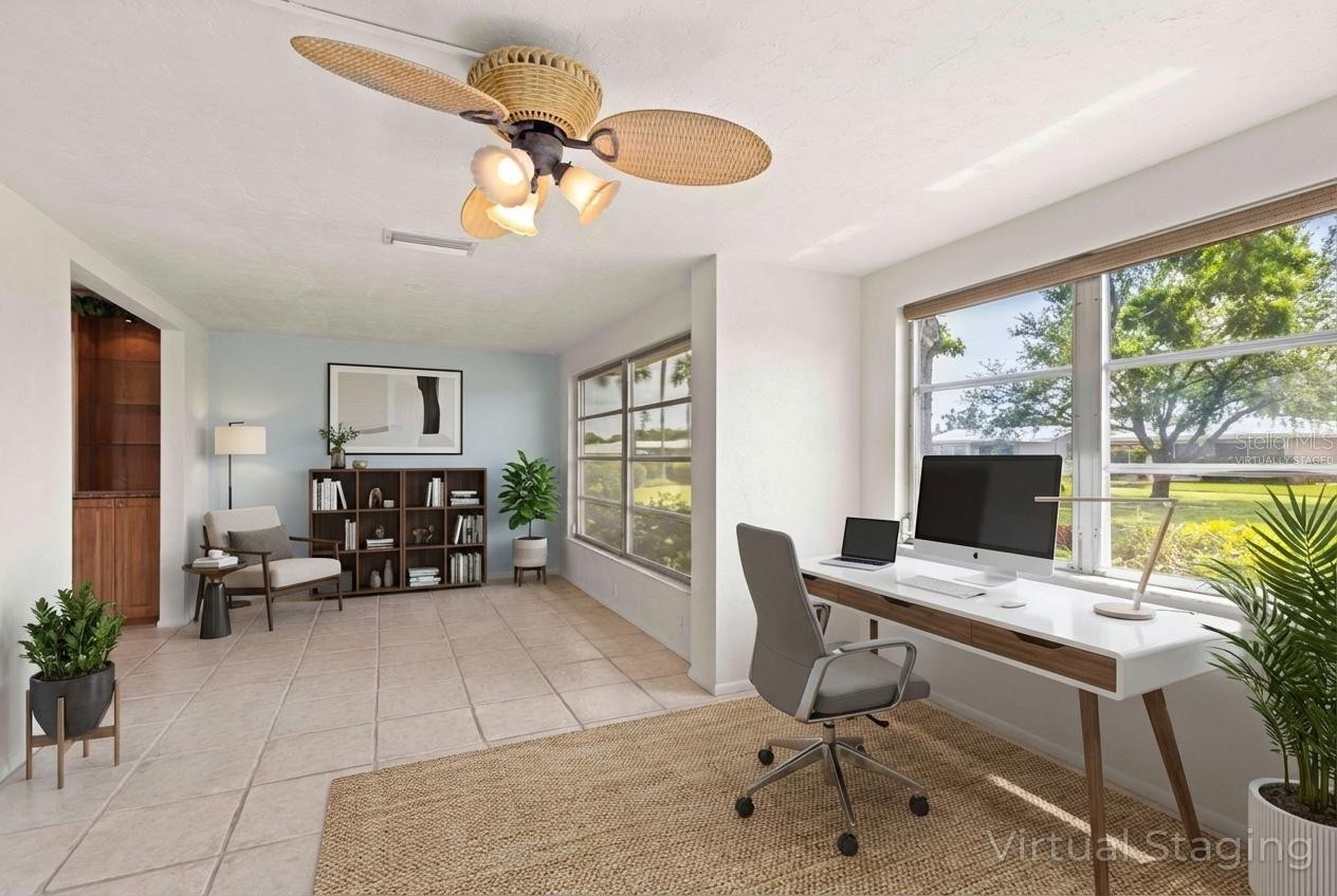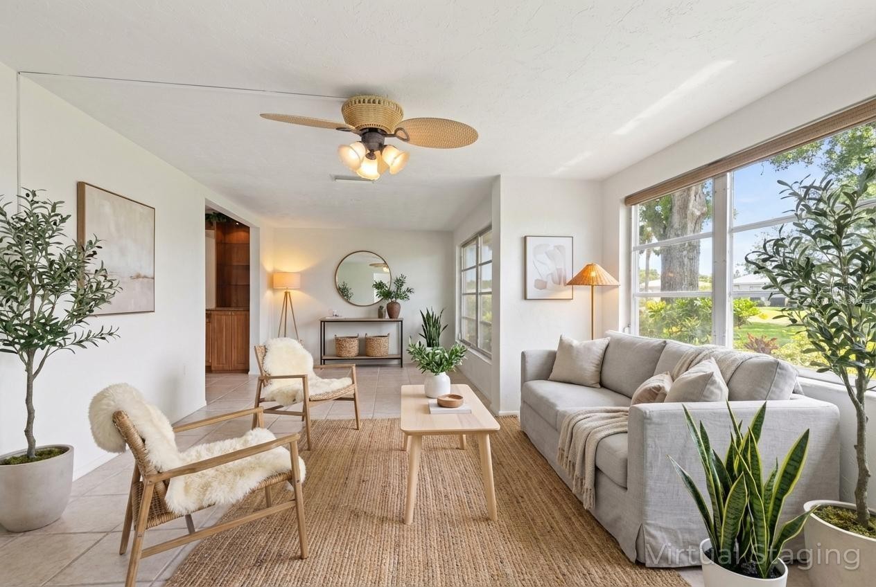 One or more photo(s) has been virtually staged. LOWEST PRICED VILLA IN VILLAGE GREEN!! Discover a meticulously maintained move-in ready 2 bed/2 bath villa in the tranquil 55+ community of Village Green in Sarasota. Tucked away on a private dead-end street, this home provides the comfort and exclusivity of a single-family residence with an expansive layout that includes separate living, dining, and Florida rooms—ideal for both relaxation and entertaining. AC replaced in 2020, new water heater 2025, flat roof over garage replaced Sept. 2025 with transferable warranty and exterior painted Dec. 2025. The well-appointed kitchen is a chef’s delight, featuring generous counter space, abundant cabinetry, deep set pantry, a built-in desk and room for a cozy bistro set. There's also a large indoor utility room complete with a laundry sink and coupled with a walk-in closet outfitted with extensive shelving and additional cabinets, ensuring that every storage need is met. For added convenience, the separate entrance from the garage to the kitchen makes it easy to transfer groceries from the car. Wood plantation shutters adorn the windows in both bedrooms and large windows throughout the home provide plenty of natural light. The screened patio overlooking a lush greenbelt is a perfect haven for your morning coffee or a great spot to unwind at the end of the day to enjoy the warmth of sunset. Maintain an active lifestyle with the quarter-mile loop right outside your back door, designed for getting your steps in along the picturesque Village Green. Just two doors down, the community pool and ramada create a welcoming setting for neighbors to gather and socialize. Experience a maintenance-free Florida lifestyle at an attractive price, with shopping centers, dining, hospitals, and beautiful beaches all within easy reach. Don’t miss your chance to join this vibrant, active community in the heart of Sarasota—schedule your private tour today and experience the charm of Village Green living!