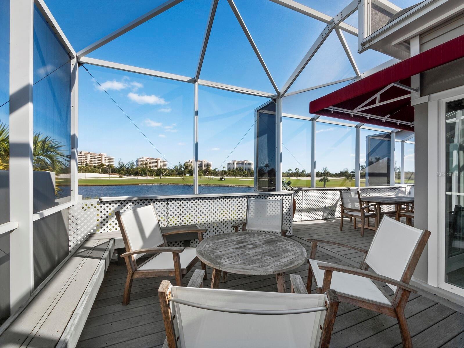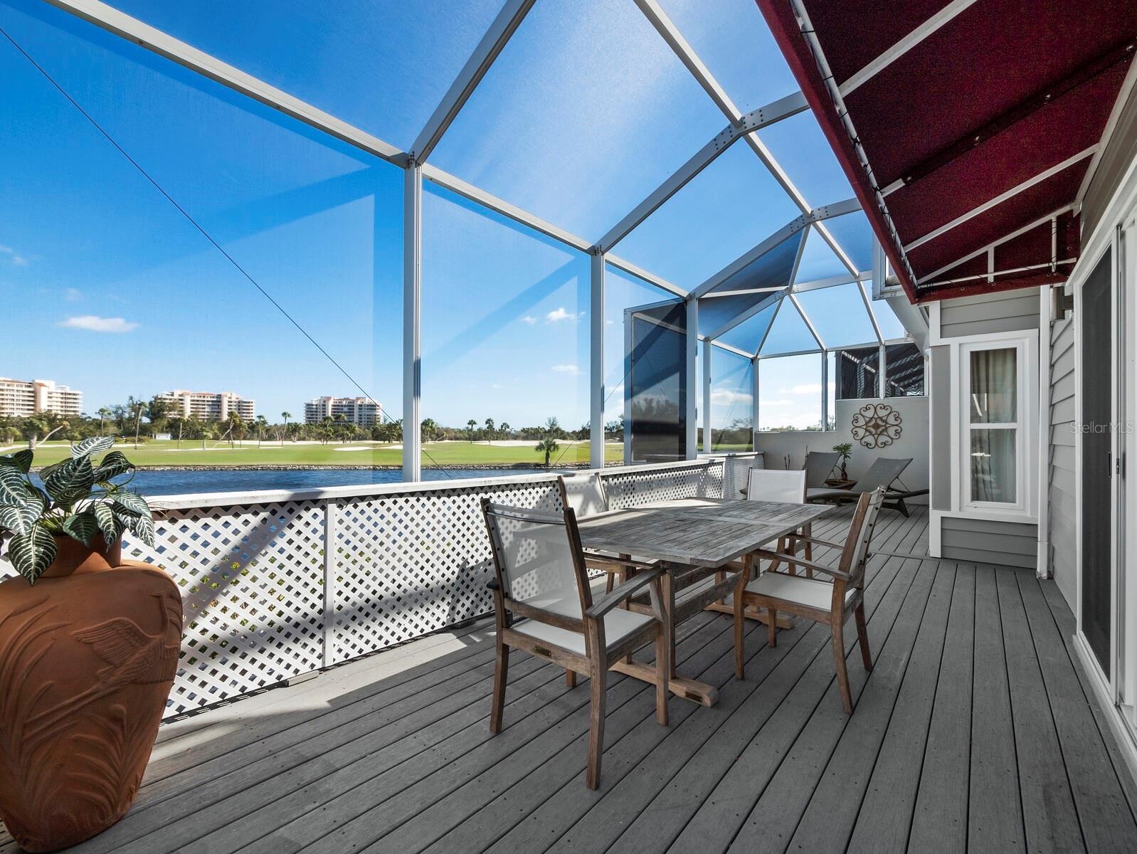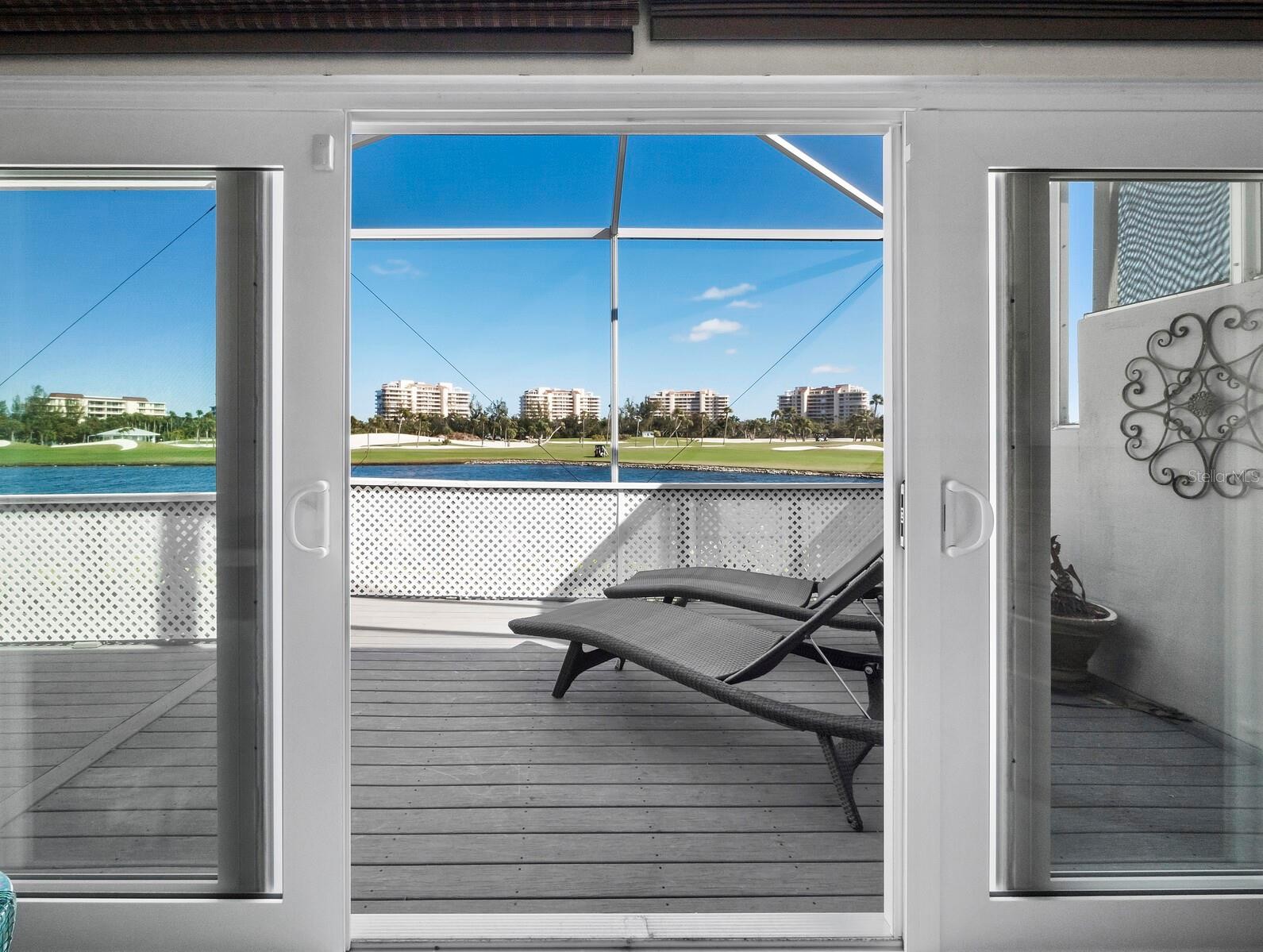 Own your own slice of tropical paradise on Longboat Key with this beautiful two bedroom two and on half bath Villa in the exclusive Winding Oaks Community located behind the gates of Bay Isles Association. Sweeping views of the Longboat Key Club Harbourside Golf Course and a sparkling inland waterway from your primary bedroom and expansive living/dining room combo that both exit through sliders to a fully enclosed wrap around deck to further enhance your tropical lifestyle. Open floor plan with soaring ceilings and enclosed atrium help to maximize the natural light and make the 2,555 sq feet feel even larger. Beautifully updated eat in kitchen with striking tray ceiling, ample pantry storage, bright white cabinets, quartz countertops and stainless steel appliances. Primary owners suite includes an designer walk in closet, updated bath with ceramic tile, walk in shower, double sinks and quartz counter tops. Split layout offers a private guest suite, with walk in closet, updated ensuite bathroom with ceramic tile, walk in shower and quartz counter tops. Large office with desk nook could easily be converted to another bedroom. Laundry room with storage and sink adjacent to large 2 car garage with epoxy floors and storage cabinets. Meticulously maintained, Impact Windows and sliders throughout, low maintenance mature plantings in private enclosed front courtyard. Dog friendly community. Beautiful updated community pool with bathrooms. Beach access via Bay Isles Beach Club which offers a private pavilion with bathrooms, volleyball, picnic tables, grills and ample parking. Low maintenance community where all exteriors and court yards are maintained by the association. Conveniently located mid key, one mile from Publix and CVS and a short drive to the restaurants and shops of St Armand’s and Downtown Sarasota.
