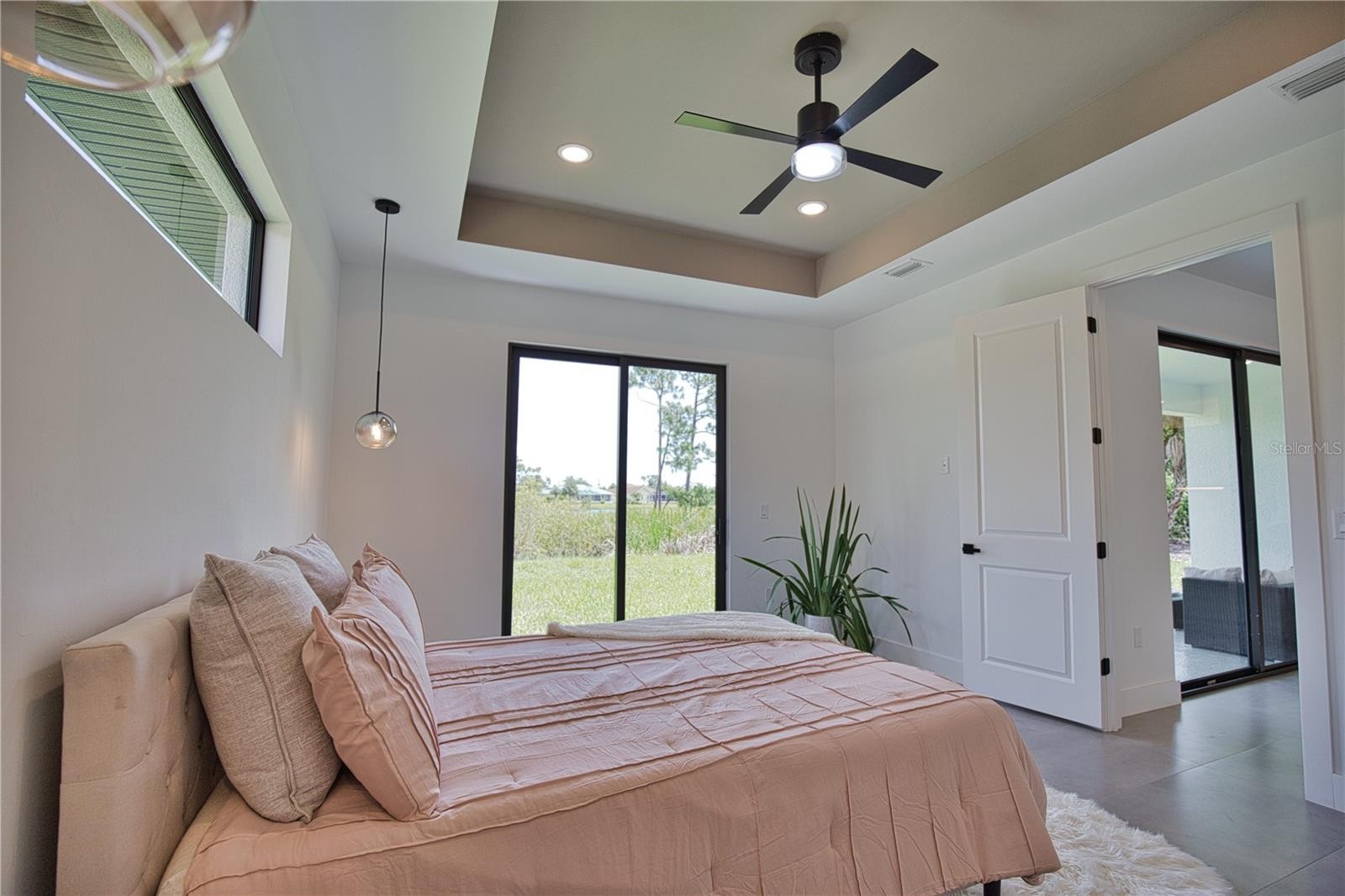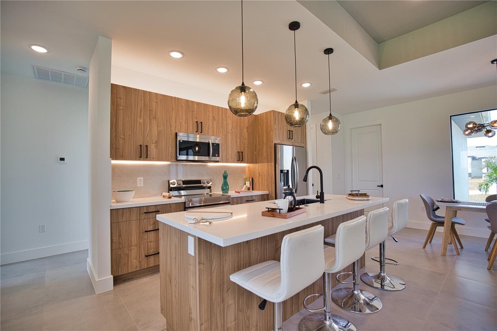 This GREAT VALUE, new-construction 4/2 home provides a modern and peaceful living space in the thriving community of Venice. The NO HOA, NO FLOOD ZONE, 1 YEAR BUILDER'S WARRANTY and LOCATION make this home a real find! As a SOUTH VENICE resident, you can take advantage of the SOUTH VENICE BEACH FERRY, transporting you to your own PRIVATE BEACH on Manasota Key and gain access to the resident BOAT LAUNCH. This serene neighborhood is close to many unique activities such as several nature parks, Legacy Trail, Historic Downtown Venice, Warm Mineral Springs, Venice Fishing Pier and is a 6 minute drive to Manasota Beach, a 15 minute drive Venice beach! The 4th bedroom gives the flexibility of use for an office, gym or craft room to suit your needs. The home's exterior is welcoming and stylish with modern lighting and landscaping along with the peace of mind of hurricane impact windows and a high elevation. The open floor plan allows you to enjoy the main living areas simultaneously. The living room, dining area, and kitchen flow together perfectly, providing the ideal space for entertaining or family gatherings. The high tray ceiling, ceiling fan and large windows flood the main area with natural light and create a cheerful and inviting atmosphere. The neutral color palate allows you to add your personal touches and customize your look. The heart of this home is the sleek, modern kitchen. The quartz countertop and breakfast bar are perfect for casual dining and gathering. Soft close cabinets with gola profile and drawers with a modern, stylish and clean look. Stainless steel appliances, ample cabinet storage space and pantry complete the wish list for a perfect kitchen. The spacious dining area is designed for serving family meals or entertaining and includes a beautiful chandelier that contributes to this home's unique charm. Sliding glass doors provide access to the large covered porch off the main living area creating a seamless transition from indoor to outdoor living space. The master suite is a TRANQUIL RETREAT elevated by gorgeous tray ceiling, ceiling fan and sliding door to back yard. The en-suite bathroom feels like a PRIVATE SPA with a gorgeous OVERSIZED SHOWER, rain shower head, upgraded LED mirrors and soft LED lighting under the vanity to provide you a peaceful haven. 3 additional bedrooms with ample closet space and ceiling fans share a well-designed bathroom with a tub and the same upgraded rain shower head, LED mirrors and LED lighting. Laundry will be less of a chore in this spacious and neat laundry room featuring a convenient utility sink with cabinet. The 2 car garage conveniently leads to the laundry room for the perfect transition upon your arrival home. This property is staged and easy to show! It's features, proximity to beaches, S Venice resident perks and unique outdoor/shopping activities make this house the ideal place to call home.