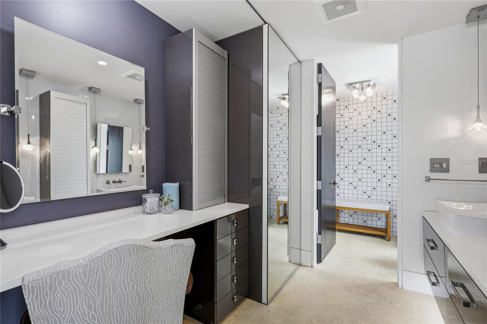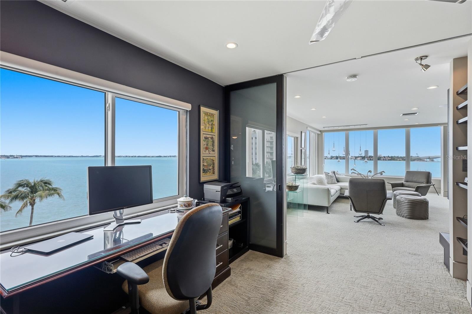 Refined waterfront living at the peaceful southwest corner of Golden Gate Point. This impeccably renovated corner residence captures sweeping, unobstructed views of Sarasota Bay, Bird Key, and the iconic John Ringling Bridge through walls of impact-rated PGT windows—delivering breathtaking sunsets and a true sense of coastal serenity. Designed for both elegance and ease, the open-concept living and dining spaces flow seamlessly from a sophisticated, modern kitchen featuring quartz countertops, sleek melamine cabinetry, and cork flooring. Premium stainless appliances include a JennAir induction cooktop with downdraft, Bosch dishwasher, LG refrigerator, KitchenAid trash compactor, and Whirlpool microwave/oven. A built-in desk, composite sink, and WaterPro Reverse Osmosis System for drinking water elevate everyday functionality, while a thoughtfully designed prep kitchen offers discreet, highly efficient storage for pantry items and small appliances. The primary suite is a private sanctuary, complete with a custom built-in dresser, mounted TV, designer pendant lighting, and a fully customized 13’ x 6’ walk-in closet by The Container Store. The spa-inspired bath showcases floating dual vanities, a dedicated makeup area, two appliance garages, a jetted tub/shower combination, heated towel rack, and a striking designer feature wall. The stacked washer and dryer are conveniently tucked away behind a sliding mirrored door. A versatile second bedroom with Murphy bed and closet easily transforms into a refined home office or guest retreat. Additional highlights include curated finishes throughout, including feature walls in the living room, primary suite, and primary bath, and a beautifully appointed guest bath with porcelain tile flooring and walls, floating vanity with under-cabinet lighting, and another towel warmer. Residents enjoy an intimate boutique setting with a heated bayfront pool, day dock, outdoor shower, renovated pool bath, covered assigned parking, and ample guest parking. Just moments from the dining, arts, and culture of Downtown Sarasota, the boutiques and restaurants of St. Armands Circle, and the white-sand beaches of Lido Key. A rare opportunity to own a turnkey residence in one of Sarasota’s most prestigious waterfront enclaves.