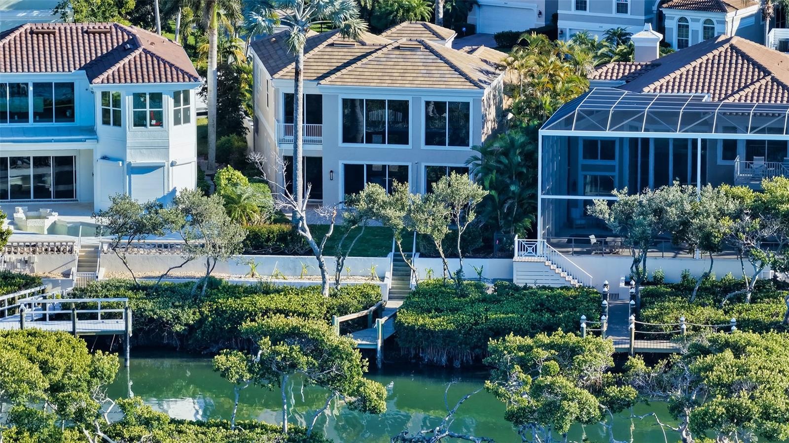 Located within the gated Queens Harbour enclave in Bay Isles, this direct bayfront residence offers a well-designed courtyard-style floor plan with water views, flexible living spaces, and a private dock—set on a quiet cul-de-sac in one of Longboat Key’s most established communities. Spanning approximately 3,470 square feet of living space across two levels, the home features four bedrooms, four full baths, and one half bath, with a layout that prioritizes privacy and functionality. The first floor hosts three en-suite guest bedrooms, a dedicated office, and the main living areas, while the entire second floor is reserved for the primary suite, creating a true owner’s retreat. The main level welcomes you with an open living and dining arrangement highlighted by cathedral ceilings, tile flooring, and walls of sliding glass doors that open to the screened bayfront patio. This seamless indoor-outdoor connection frames tranquil water views, ideal for relaxing or entertaining. The formal dining space also enjoys bayfront exposure and flows naturally into the kitchen. The kitchen is thoughtfully positioned for daily living and gatherings, offering solid wood cabinetry, stone countertops, a center island, breakfast bar seating, pantry storage, and a full suite of stainless-steel appliances. Adjacent family and living spaces enhance the home’s livability while maintaining clear sightlines to the water. Two of the first-floor guest bedrooms include en-suite baths, while a third guest suite—a private cabana across the pool courtyard—offers flexibility for visiting family or multi-generational living. The office is also located on the first level, providing the ideal amount of separation. Upstairs, the primary suite occupies the entire second floor, offering privacy and elevated views. This retreat features a spacious bedroom, walk-in closet, and a well-appointed en-suite bath with dual sinks, soaking tub, separate shower, and private water closet. Outdoor amenities include a private pool courtyard, open dock with direct bay frontage, providing access for boating and paddle sports. A new tile roof was installed in 2023, and the property includes a two-car garage. Queens Harbour residents enjoy a maintenance-free lifestyle with 24-hour guard-gated security, community tennis courts, and a heated pool and spa located just across the street. Ownership also includes deeded access to the private Bay Isles Beach Club, offering Gulf-front pavilions, grilling areas, and pristine beaches just minutes away. Perfectly positioned behind the gates of Bay Isles, this residence is close to Harbourside Golf & Marina, the Longboat Key Club, and island dining. St. Armands Circle, Lido Beach, and downtown Sarasota are all within easy reach, providing access to shopping, waterfront restaurants, cultural venues, and year-round events. A well-located bayfront opportunity offering space, privacy, and a flexible floor plan in one of Longboat Key’s most desirable communities.