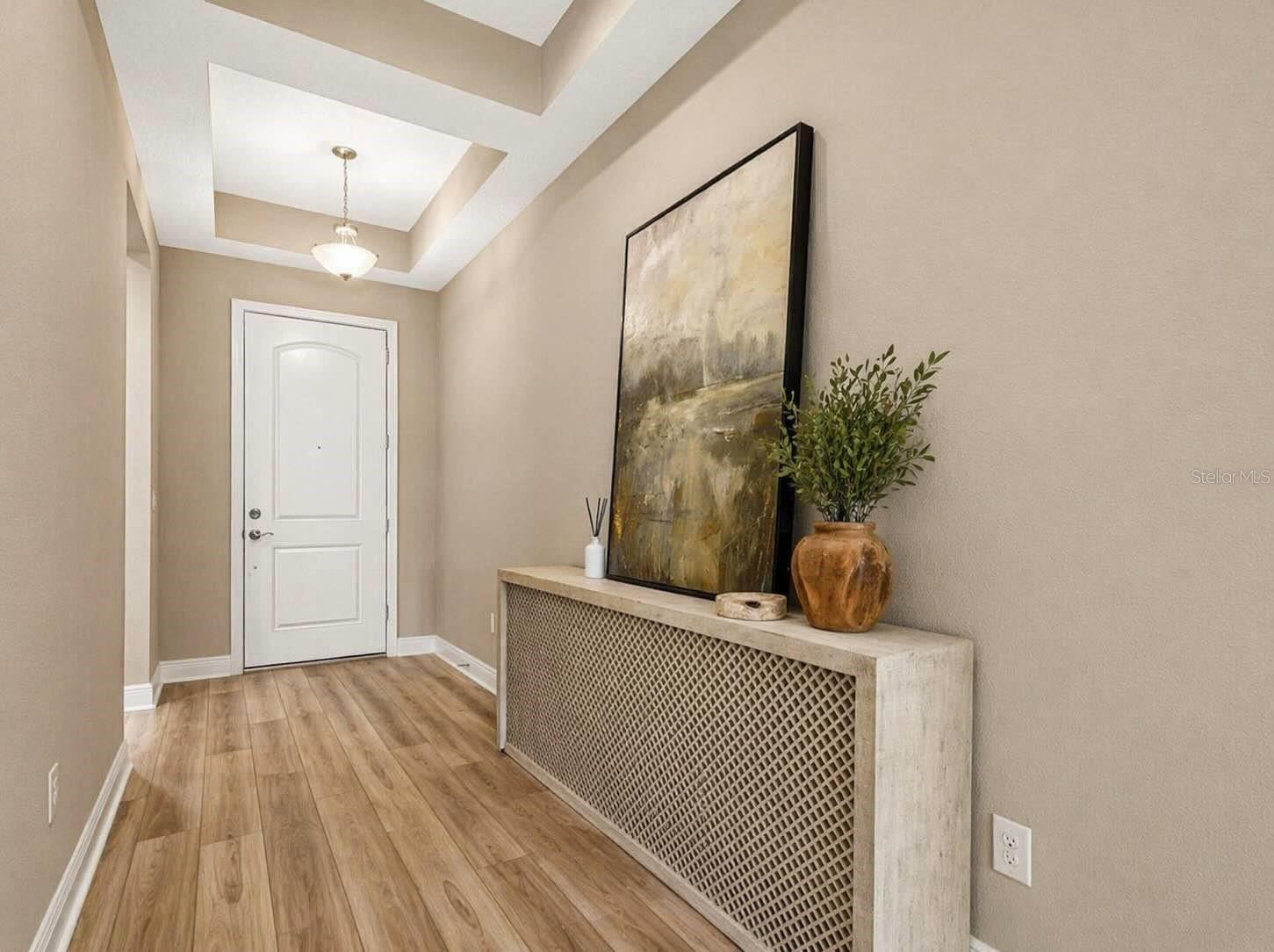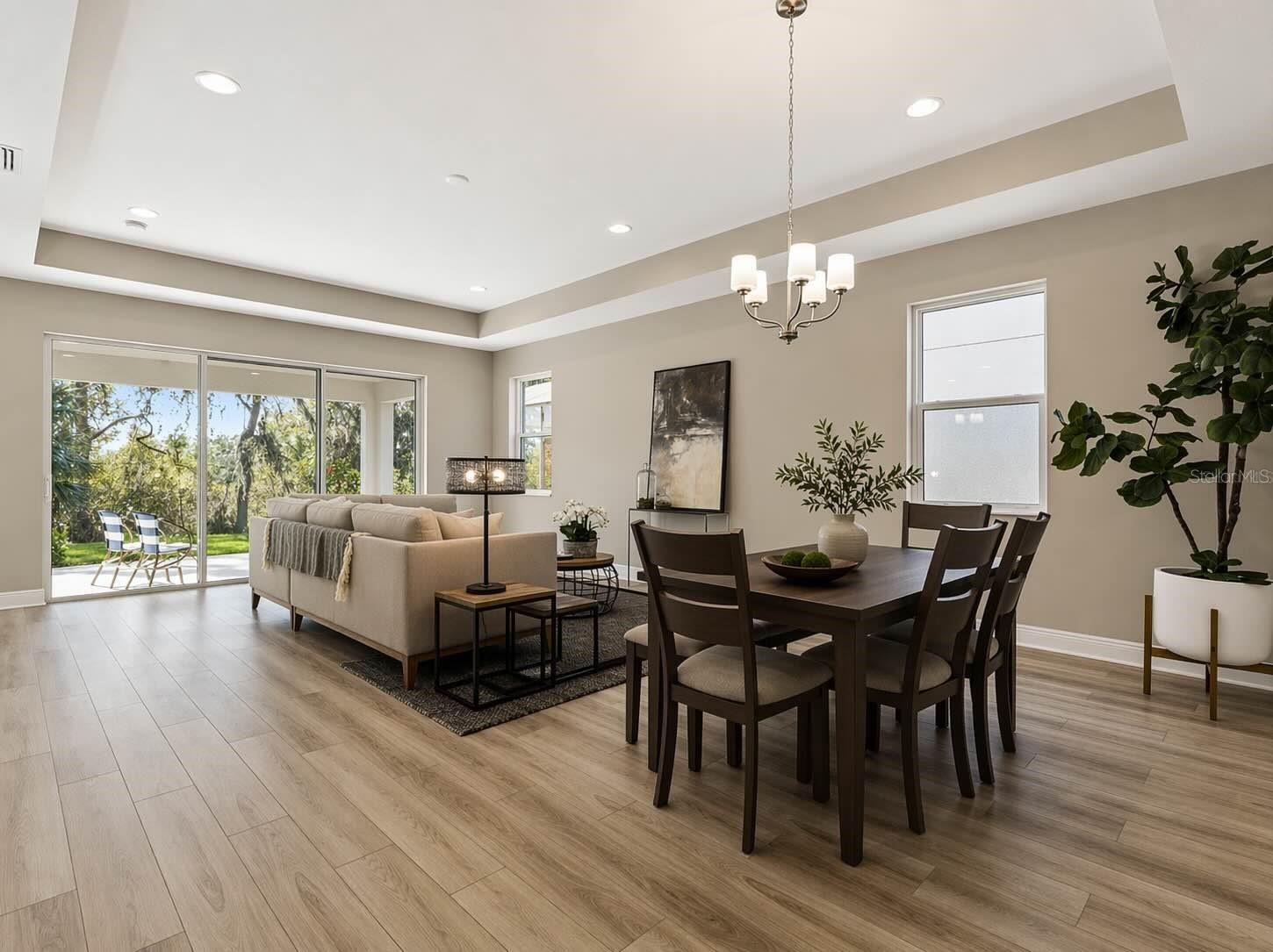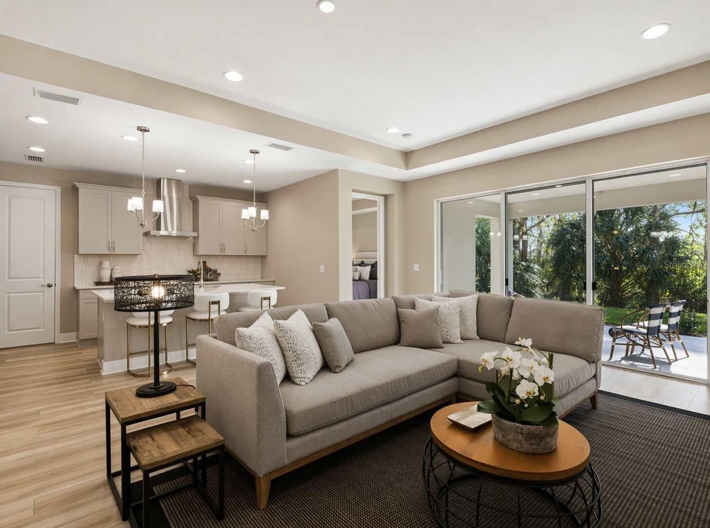 Welcome to this beautifully upgraded home in the highly desirable Hidden Creek community, offering the perfect blend of modern design, comfort, and functionality. With no CDD fees and low HOA, this nearly new home presents exceptional value in a prime location. This 3-bedroom, 2-bathroom home features a thoughtfully designed split-bedroom layout, ideal for both privacy and everyday living. From the moment you step inside, you’re greeted by an abundance of natural light, elegant tray ceilings, and 8-foot interior doors that create a bright, open feel. The foyer leads to two guest bedrooms and a full bathroom, providing a comfortable and functional space for family or visitors. The home then opens into a spacious great room, where the living, dining, and kitchen areas flow seamlessly together—creating a warm and inviting environment for both everyday living and entertaining. At the center of the home, the gourmet kitchen is a true standout. It features an oversized island with quartz countertops, offering ample seating and workspace for gathering, cooking, and entertaining. The upgraded cabinetry is enhanced with crown molding, soft-close drawers, and modern hardware, while the full designer tile backsplash adds a clean, custom look. A premium stainless steel appliance package includes a cooktop, built-in wall oven, designer hood, and dishwasher. The single-bowl undermount sink with a high-arc pull-out faucet adds both style and convenience. Just off the kitchen, a spacious pantry provides excellent storage and organization. The owner’s suite is privately situated at the back of the home, creating a peaceful retreat. It features tray ceilings and a beautifully designed en-suite bathroom with dual sinks, quartz countertops, a frameless glass walk-in shower with designer tile, and a spacious walk-in closet. Throughout the home, you’ll find luxury vinyl plank flooring in the main living areas, tile in all wet areas, and upgraded carpet in the bedrooms. Additional interior upgrades include recessed LED lighting, a two-tone paint package, upgraded baseboards, and thoughtful electrical features such as a floor outlet in the living area for a clean, modern setup. Step outside to the extended covered lanai, a true extension of the living space, overlooking a private backyard with plenty of room to add a pool. The home is also prepped for an outdoor kitchen with plumbing and electrical already in place—perfect for creating your ideal outdoor entertaining area. Additional features include an epoxy-coated garage floor, a larger garage door, smart home technology with a video doorbell, and enhanced curb appeal with stone exterior accents and brick paver detailing. With over $80,000 in builder upgrades, this home is truly move-in ready. Located just a short golf cart ride from Waterside and Lakewood Ranch, you’ll enjoy easy access to premier dining, shopping, and entertainment. Residents of Hidden Creek enjoy amenities including a sports field, playground, picnic areas, and scenic walking and biking trails. This property offers the perfect combination of luxury, location, and lifestyle.