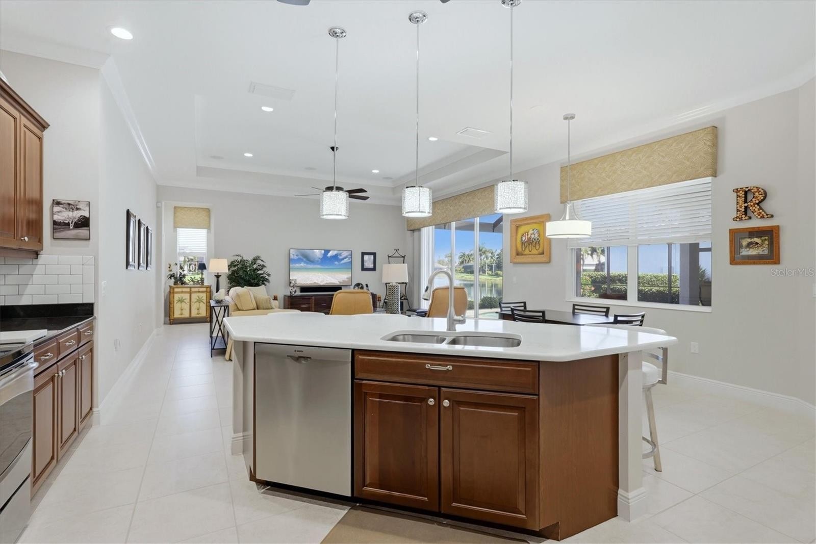Search no longer! This beautiful 3 bedrooms, 3 bathrooms, 3 car garage Oakmont model home in Sawgrass is waiting for you! This home has it all! "Location" is centrally convenient to all your wants & needs for shopping, dining & only minutes to "Historical Downtown Venice", "Beaches on the Gulf of Mexico" & "Intracoastal Waterway". Enter into this lovely home w/almost 2700 sq ft of living area that reaches out into covered lanai, enticing heated pool w/newer clear view screen cage, all overlooking large lake & landscaping. A spacious foyer gives great entry to this home w/generous volume ceilings, crown moldings & custom window treatments adding an extra touch of elegance. Ceramic tile floors flow throughout most of this home w/8 ft sliding glass doors giving generous feelings of openness & natural light! Centrally located are the family room, breakfast room & kitchen for easy access for all. Kitchen is handsomely complimented w/spacious custom cupboard, cherrywood cabinets, custom pullout drawers, granite counters & backsplash, along w/newer appliances just to start with, a great place for family & friends to gather or your own private times. Breakfast bar is accessible for several along w/spacious breakfast room adding to the ambiance of this home & family room. Family room is spacious, has coffered ceilings & ceiling fan, great for family get togethers or entertaining. Generous entry/exit access to pool area thru 8ft sliding glass doors to lanai. The Foyer entry to living room is light & bright w/great views out thru 8 ft sliding doors to lanai & pool area. A separate dining room gives extra spaces for those special dining experiences w/easy access to kitchen. Home is a split bedroom plan giving privacy to all. Nicely appointed entry foyer to master bedroom gives extra privacy & artistically enhancing. Master bedroom is roomy w/volume ceilings, coffered ceilings, ceiling fan, double walk in California closets & ensuite bathroom. Bathroom is large & accommodates double vanities nicely, large walk in shower, separate tub & water closet for privacy. Bedrooms 2 & 3 are quietly located by separate hallway from kitchen area giving easy access & privacy for both w/bath 2 serving both easily. Next is the "bonus room", now used as an office but perfect for multiple choices! Separated by hallway from family room you have privacy & lots of space. Bonus room is next to bath 3 w/shower & pool access. An inside laundry room w/storage, shelving, utility sink, washer & dryer is handy for everyone! Next, out to your 3 car garage w/durable flexible PVC flooring, cabinets & loads of storage for whatever your life desires.The home is not complete without this gorgeous heated pool & lanai area overlooking one of the greatest lakes in Sawgrass! The covered lanai easily accommodates table & chairs for your outdoor dining. The heated pool is surrounded by a custom designed deck & newly Panorama Full screen for views of lake, wildlife & tropical landscaping. You may have ease of mind w/ the front hurricane windows enhanced by remaining windows w/hurricane shutters & roll downs on all sliding glass doors. Home has had many updates/upgrades. Some include pool heater, pool pump, paint, AC, clothes washer, dryer, stove/microwave, refrigerator, garbage disposal dishwasher etc. Home has been professionally maintained and updated. Other lists available. Sawgrass is part of a golfing community but not required although golfing is reasonable. No CDDs here!!