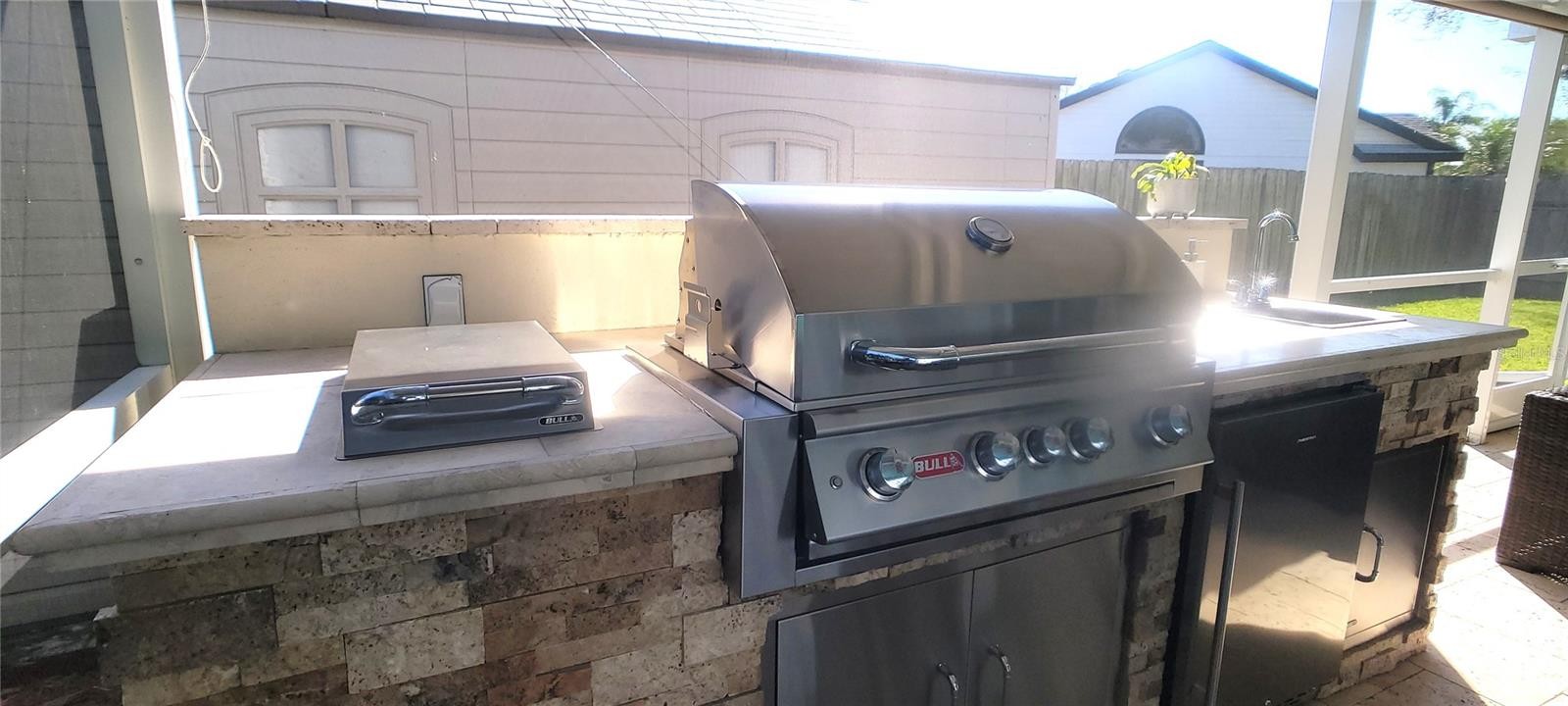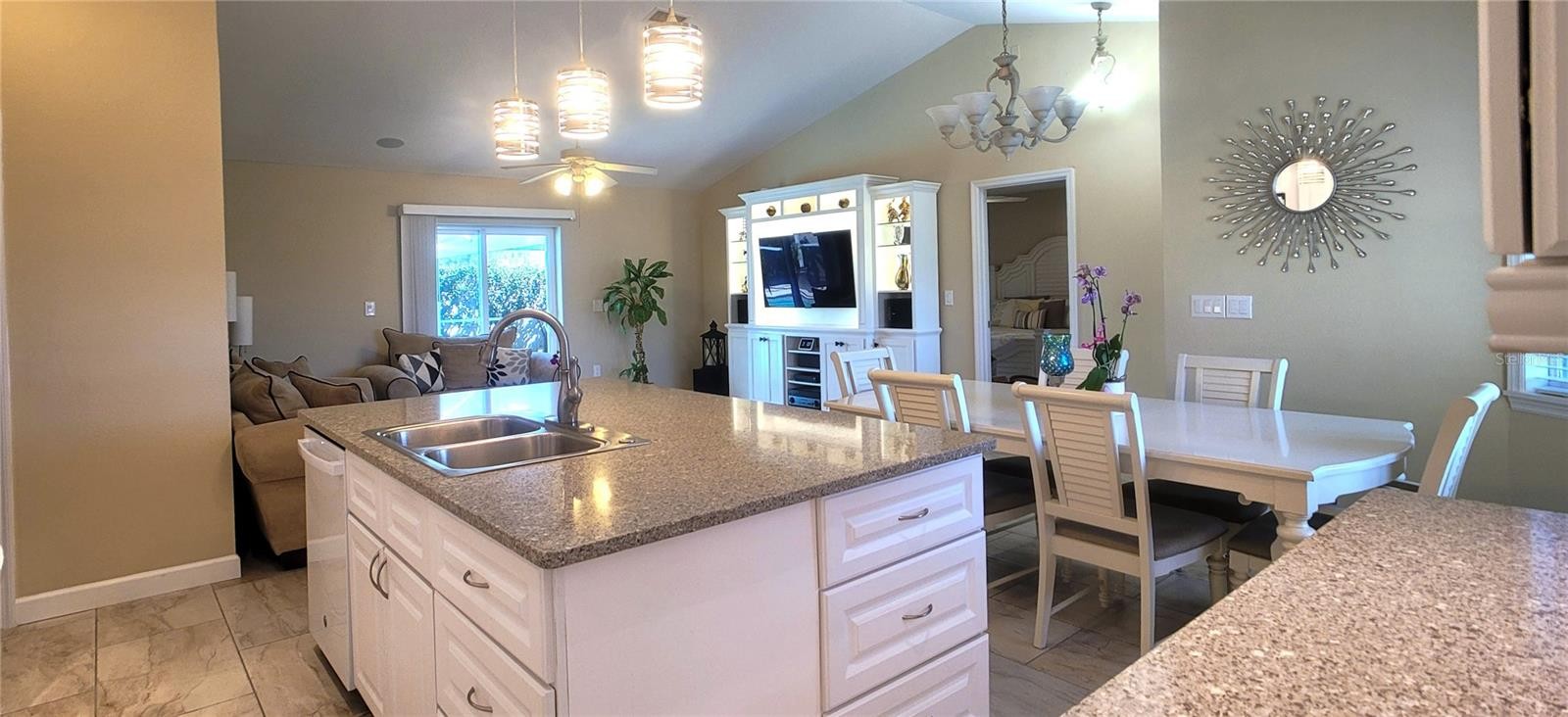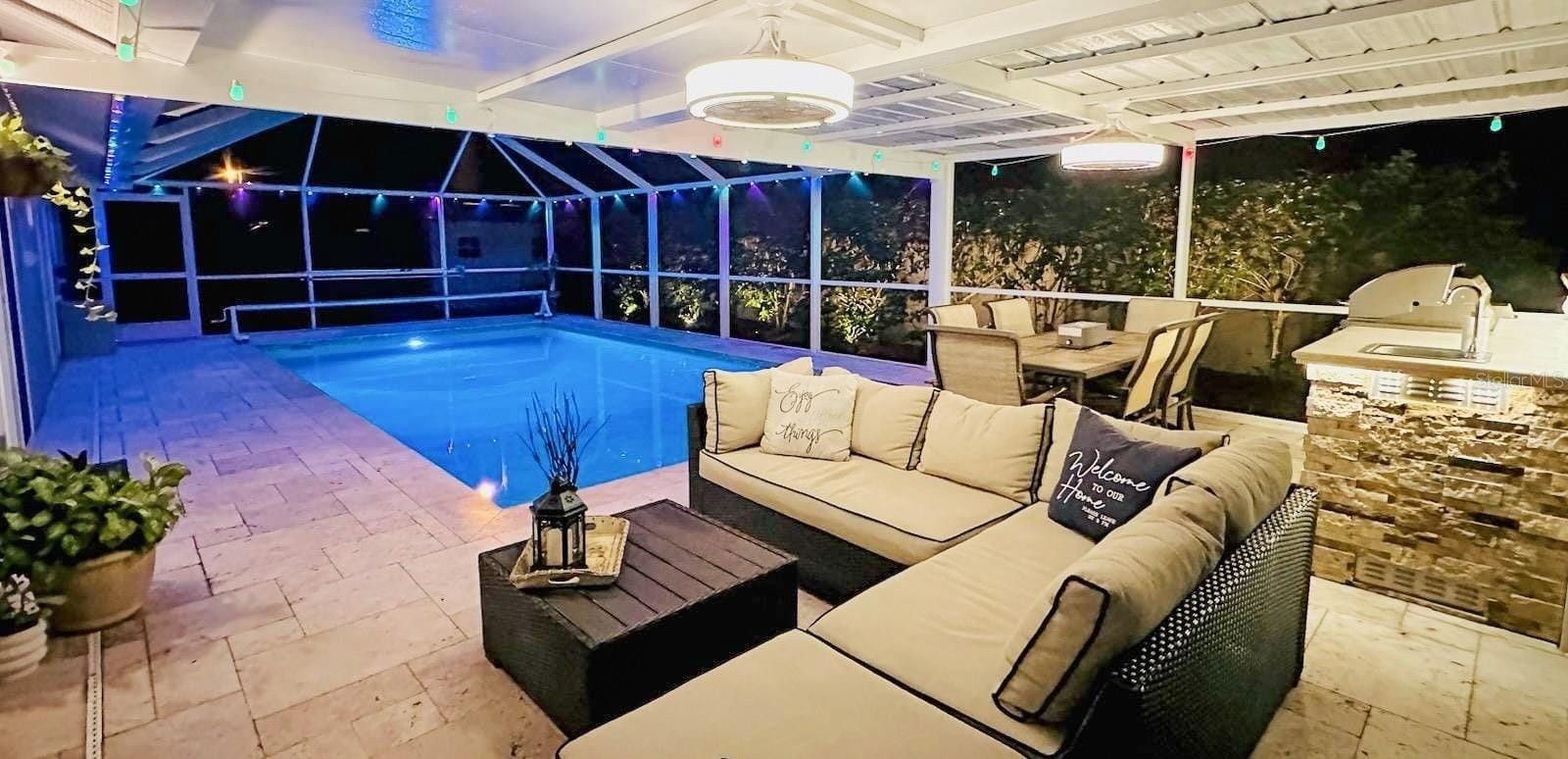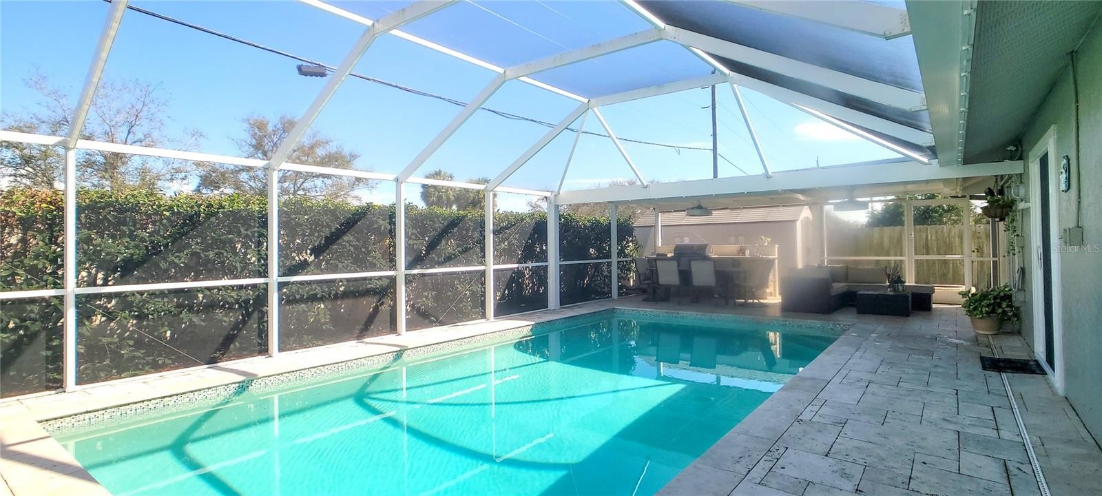 Welcome to your Florida dream home! This meticulously renovated 3-bedroom, 2-bathroom residence plus office has been thoughtfully updated to provide a seamless blend of style and comfort in every corner. At the heart of the home, you’ll find a spacious kitchen featuring an abundance of cabinetry, a dedicated pantry, elegant granite countertops, and a central island. This space flows effortlessly into the open-concept dining and living areas, creating a perfectly integrated environment for family life and entertaining. The interior shines with ceramic tile flooring throughout, complemented by a fresh, light color palette that highlights the modern finishes in every room. The primary suite serves as a private retreat, leading into a spa-like en-suite bath equipped with a double vanity and a modern freestanding bathtub—the ultimate spot to unwind and indulge after a long day. Step outside into your own tropical paradise. The exterior features a sparkling pool surrounded by premium travertine decking, a shaded outdoor kitchen, a dining area, and a dedicated TV lounge. This outdoor oasis is perfectly designed for year-round enjoyment. Additionally, the garage has been expertly converted to maximize the home's living space, now housing a private office, a laundry room, and a convenient storage area. Move-in ready and waiting for you. Roof 04/2025, Other major renovation in 2024 & Pool lanai 2018 / Hurricane shutters / Battery backup System
