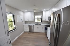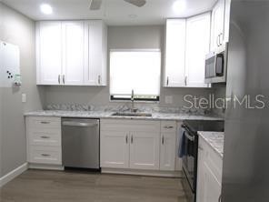 This little piece of paradise is centrally located and ready for you to call home. Nestled among the stately oaks and lush foliage of Village Oaks is a beautifully updated villa with many great features. New A/C (2023) new stainless appliances, all new kitchen cabinets and counter tops (2023) new luxury vinyl flooring, updated baths, new roofs (2019) and a new garage door. The living room has vaulted ceilings which adds to the spacious felling/. The master bedroom features a large walk-in closet, the master bath has a double vanity and large garden tub while the guest bedroom has an equally big walk-in closet. A laundry closet with side-by-side washer and dryer is conveniently located in the hallway across from the kitchen. Easy entry to the Villa from the attached 2 car garage is through the front screened porch. The lanai has been enclosed and features beautiful, tiled floors and Plenty of windows to let in the sunshine. Village Oaks is a great community offering a beautiful setting for it's lakeside pool, tennis courts and pickleball courts. Just minutes away from downtown Sarasota, the UTC Mall, Benderson Rowing facility and many options for dining and shopping.