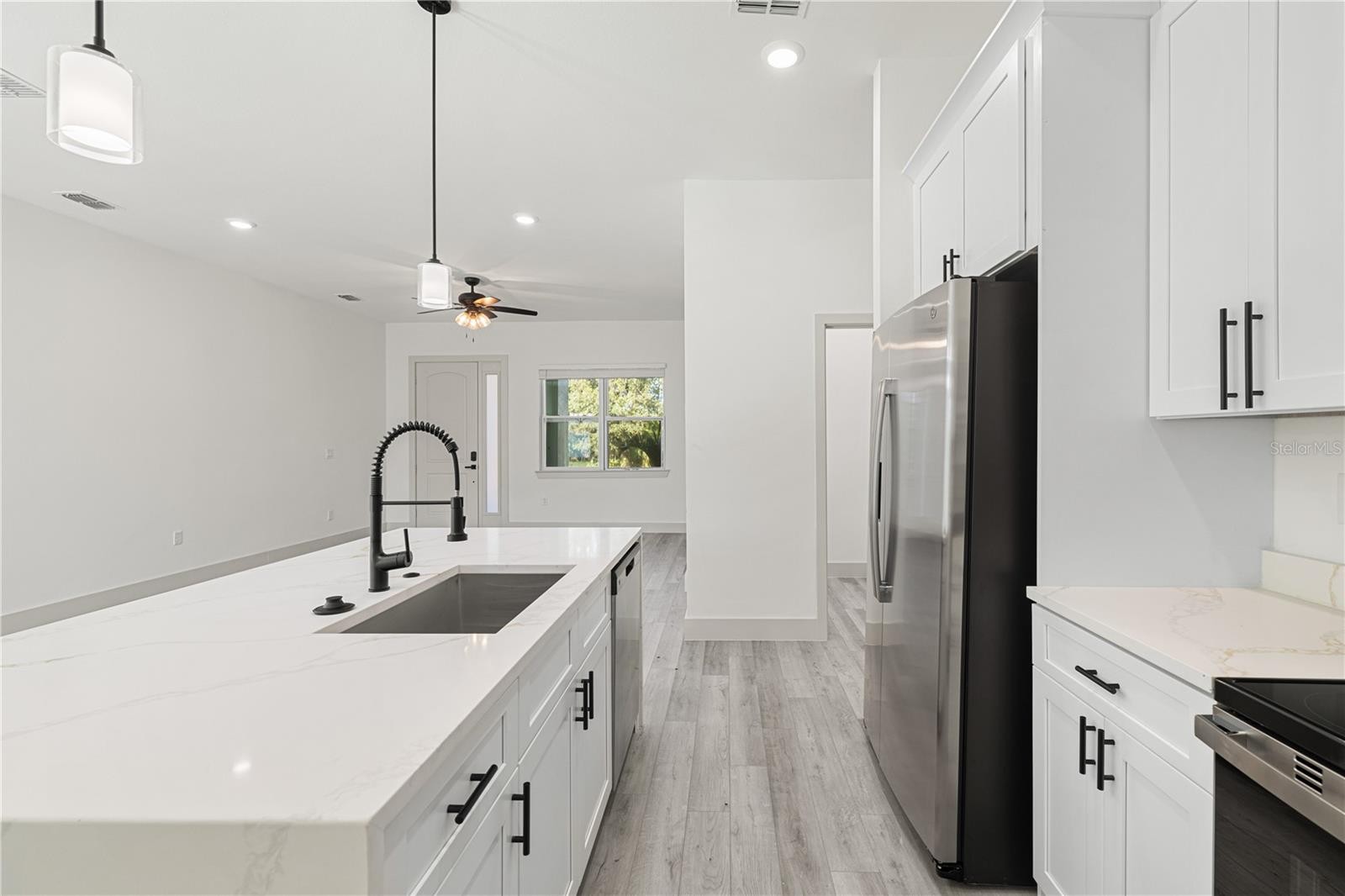 This elegant 4-bedroom, 2.5-bath home offers 1,695 sq.ft. of living space with an open-concept design and modern finishes throughout. The kitchen features a beautiful quartz waterfall island, sleek cabinetry, and all-dark fixtures that add a contemporary touch. The spacious living room includes an electric fireplace, creating a cozy and stylish gathering space. The primary suite offers a luxurious bathroom with a freestanding tub, dual sinks, and marble-style tile finishes. Enjoy outdoor living under the covered lanai, and the convenience of a double-car garage. With a total construction area of 2,412 sq.ft., this home combines functionality and modern design perfectly. Additional features include a SMART KEY system for enhanced security and the peace of mind that comes with a 2-10 HOME BUYERS WARRANTY. Don’t miss out—schedule a showing today!