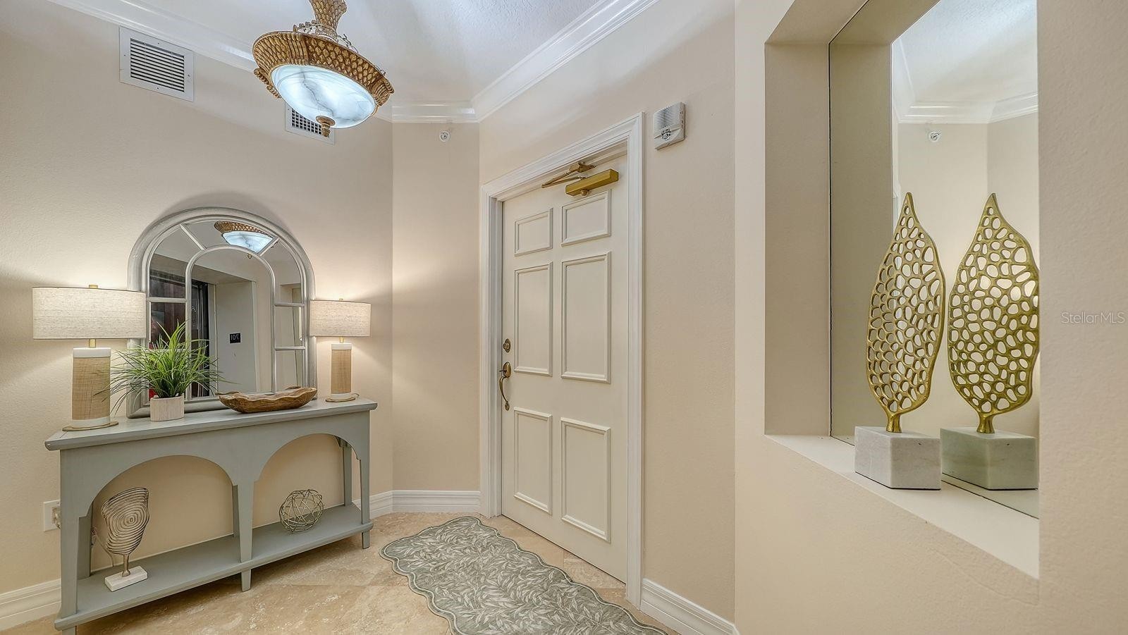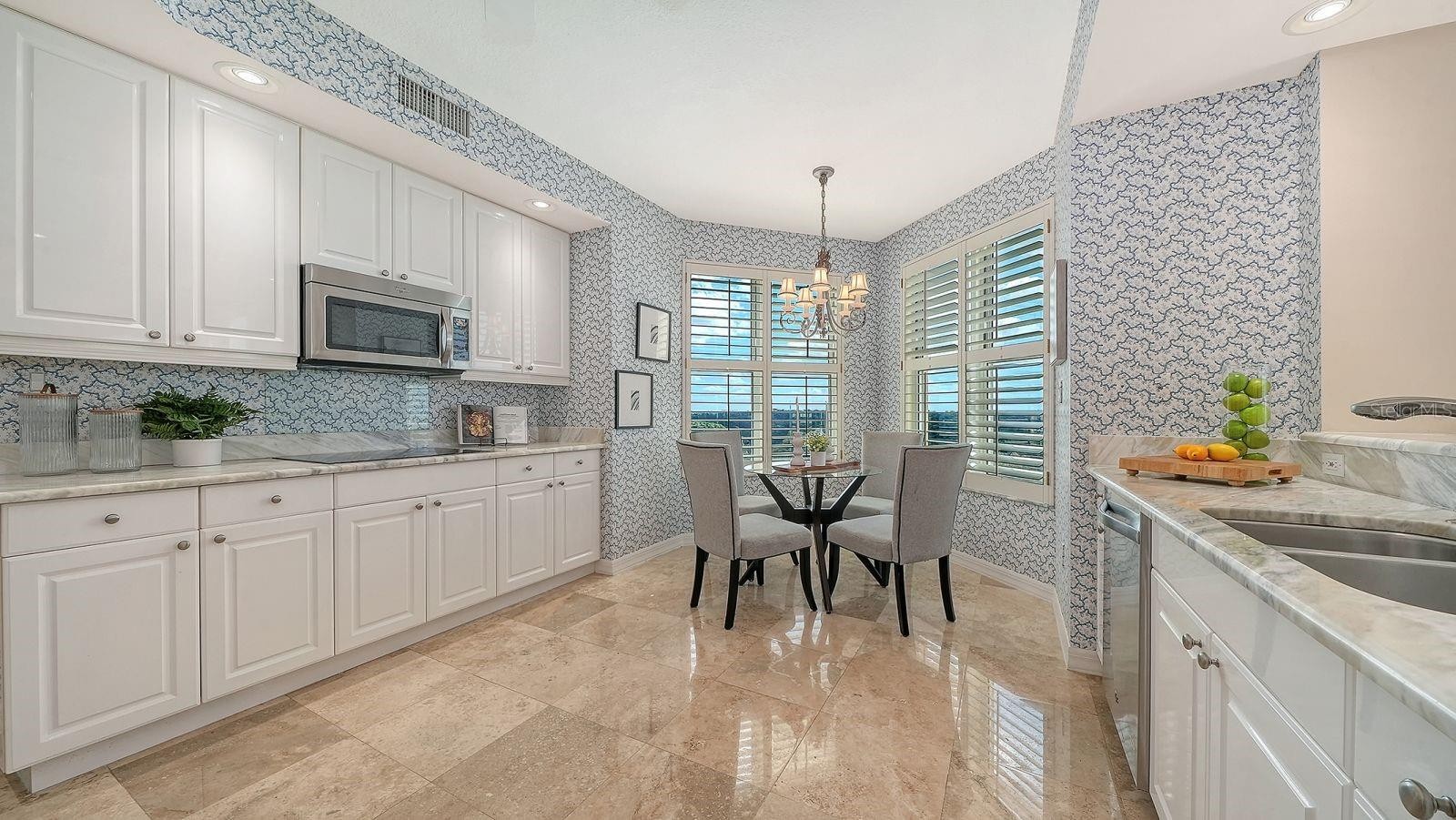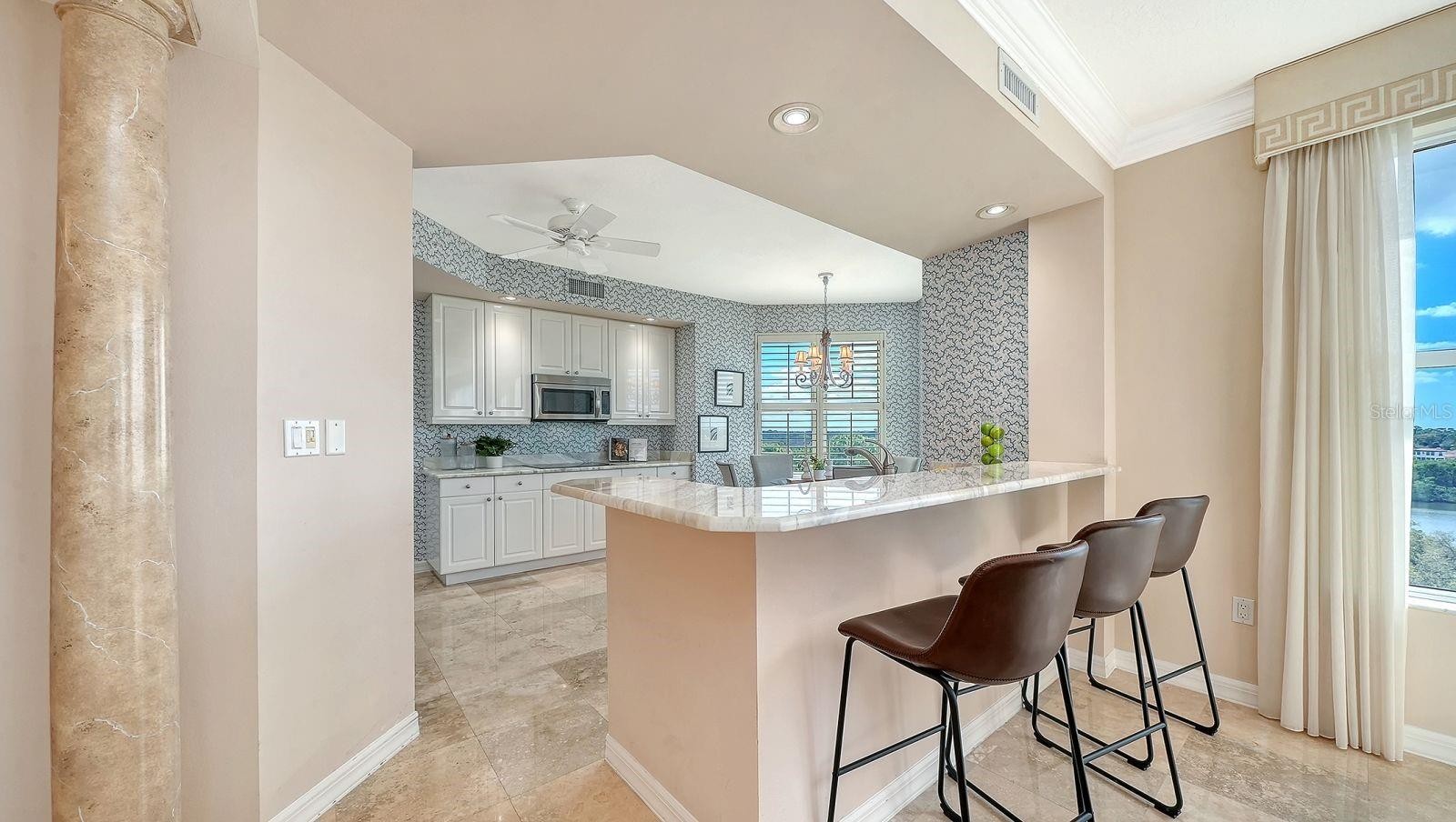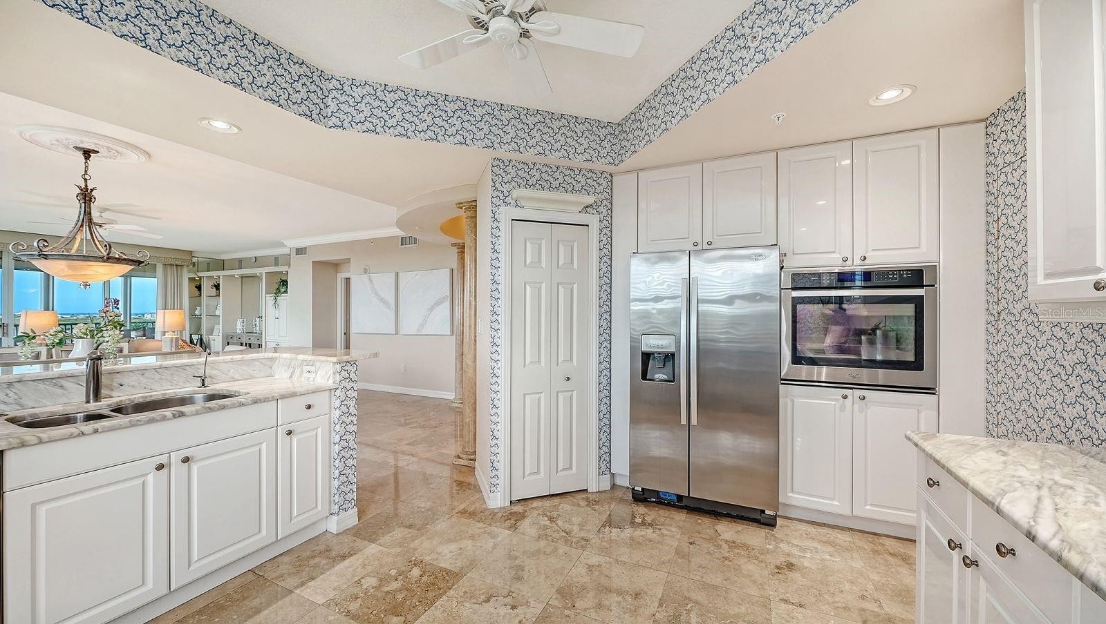 Situated on the 7th floor of The Meridian, this sophisticated three-bedroom plus den, three-bath residence with private two-car garage offers elevated waterfront living behind the gates of the prestigious The Oaks Preserve and within the exclusive Oaks Club community. Every detail has been carefully curated for refined comfort, luxury, and effortless Florida indoor-outdoor living. A private elevator opens directly into your personal foyer, adorned with marble flooring, creating an immediate sense of privacy and elegance. Expansive water views greet you from the main living areas and primary suite, filling the home with natural light and serene vistas. The expansive lanai provides the perfect setting to begin and end each day, whether savoring morning coffee or an evening beverage as the sun rises and sets over the water. The open living and dining area is framed by waterfront vistas, offering a tranquil backdrop for entertaining or everyday enjoyment. The gourmet eat-in kitchen is appointed with marble countertops, stainless steel appliances, breakfast bar seating, and a reverse osmosis and water softener system, blending elegance with practicality. The primary suite is a private sanctuary, featuring a sitting area overlooking the water, a walk-in closet, and a spa-inspired bathroom with spa tub, separate shower, dual vanities, and water closet. The second guest bedroom is ensuite, while the third bedroom and den provide flexible spaces for family, guests, or a home office. A separate laundry room with laundry tub completes the residence. Additional highlights include secured building access, private under-building parking, and the elevated vantage point of the 7th floor, which enhances panoramic water views. The Meridian neighborhood offers a community pool, fitness center, and walking trails throughout The Oaks Preserve. Residents enjoy membership to The Oaks Club, Sarasota’s unmatched Country Club lifestyle, featuring: 36 championship fairways, 16 courts, croquet, fitness and recreational facilities, refined and casual dining, pool and a vibrant social calendar. Membership is required, with options for Equity or Social Memberships. The coastal, sophisticated lifestyle within The Oaks Club combines privacy, resort-style amenities, and close proximity to Sarasota’s world-famous beaches, cultural landmarks, shopping, and dining, creating a lifestyle designed for the refined and active Florida living. This is a rare opportunity to experience luxury waterfront living, elevated elegance, and exclusive club access in one of Sarasota’s most distinguished communities.