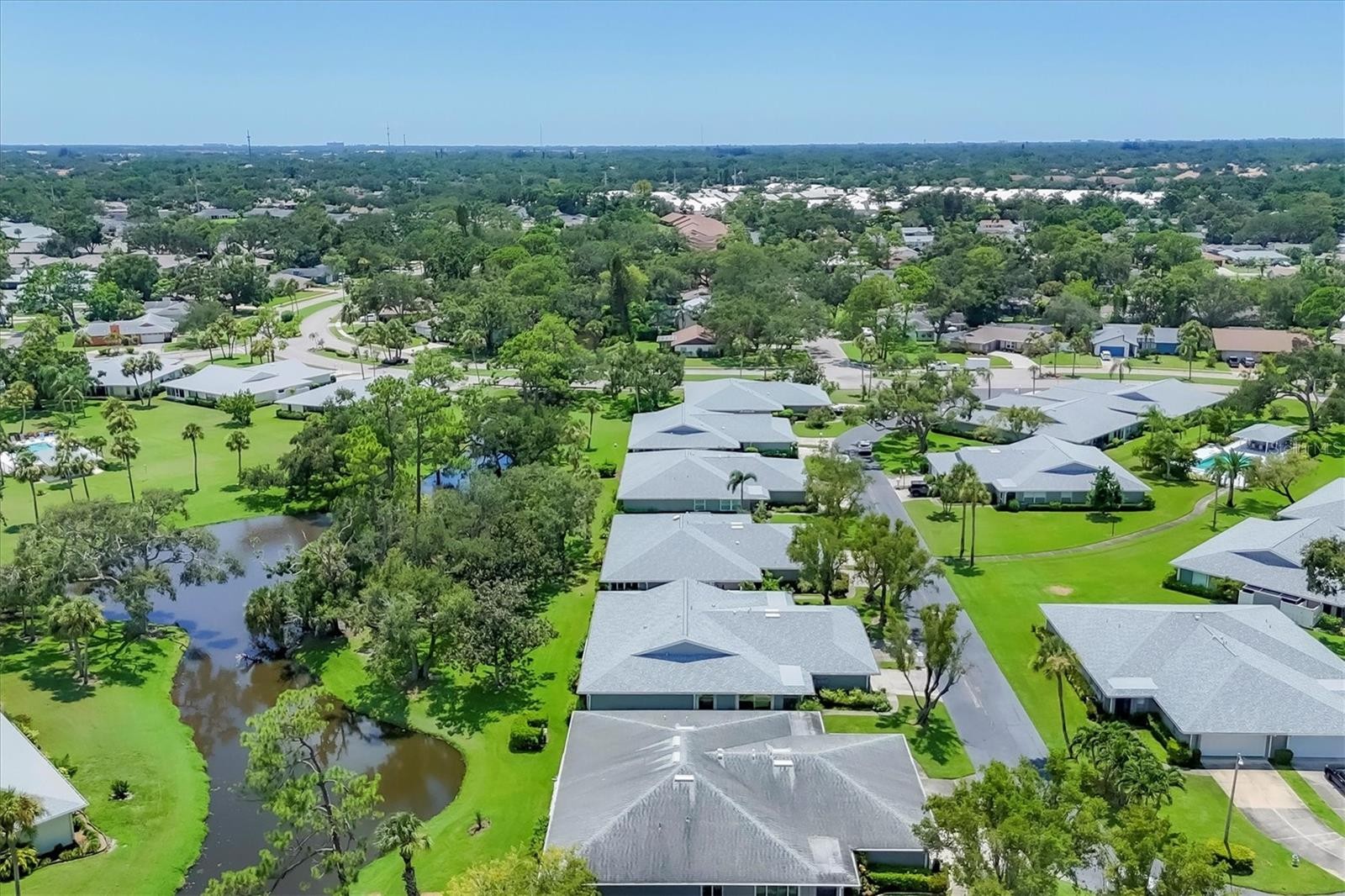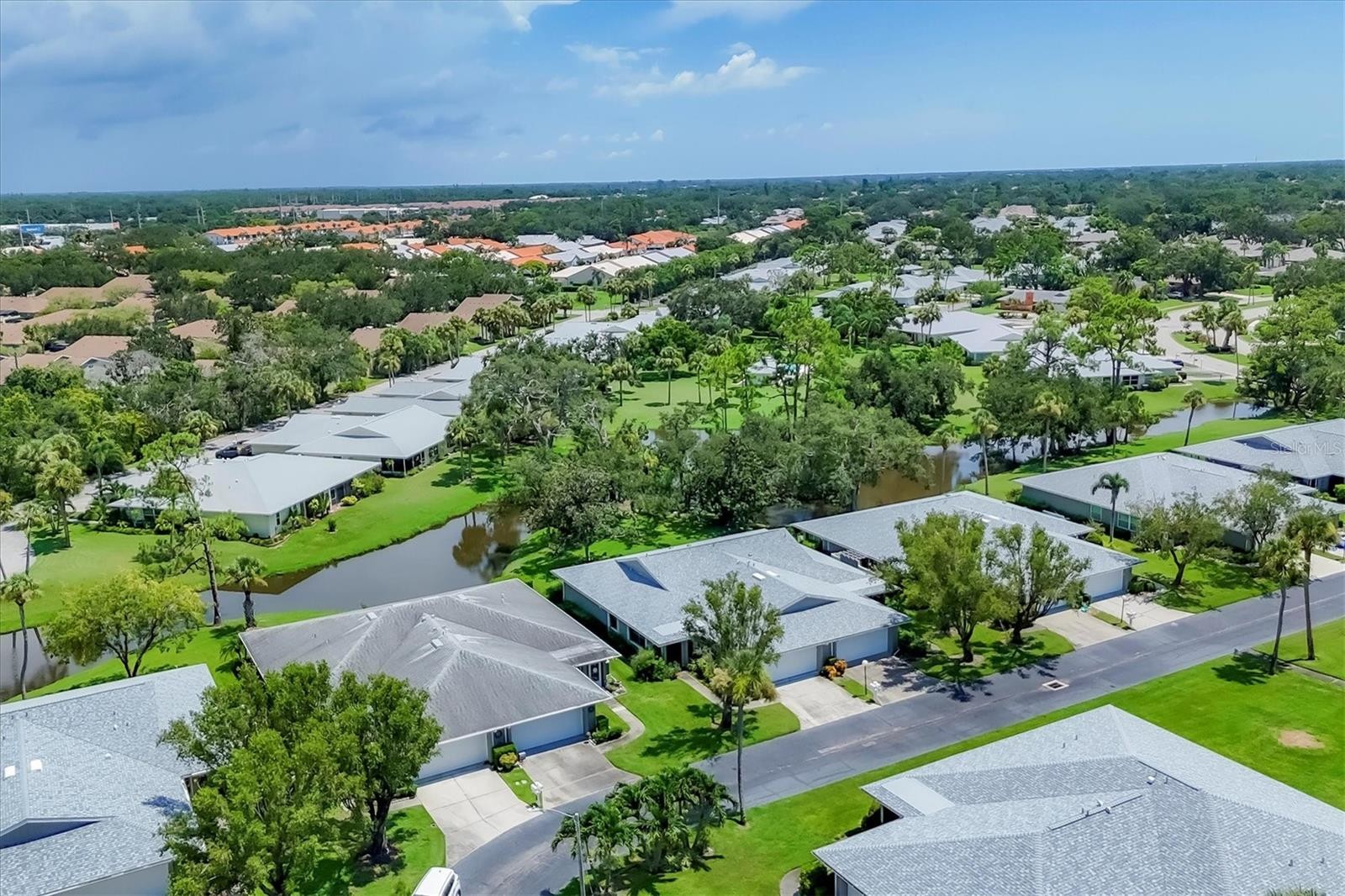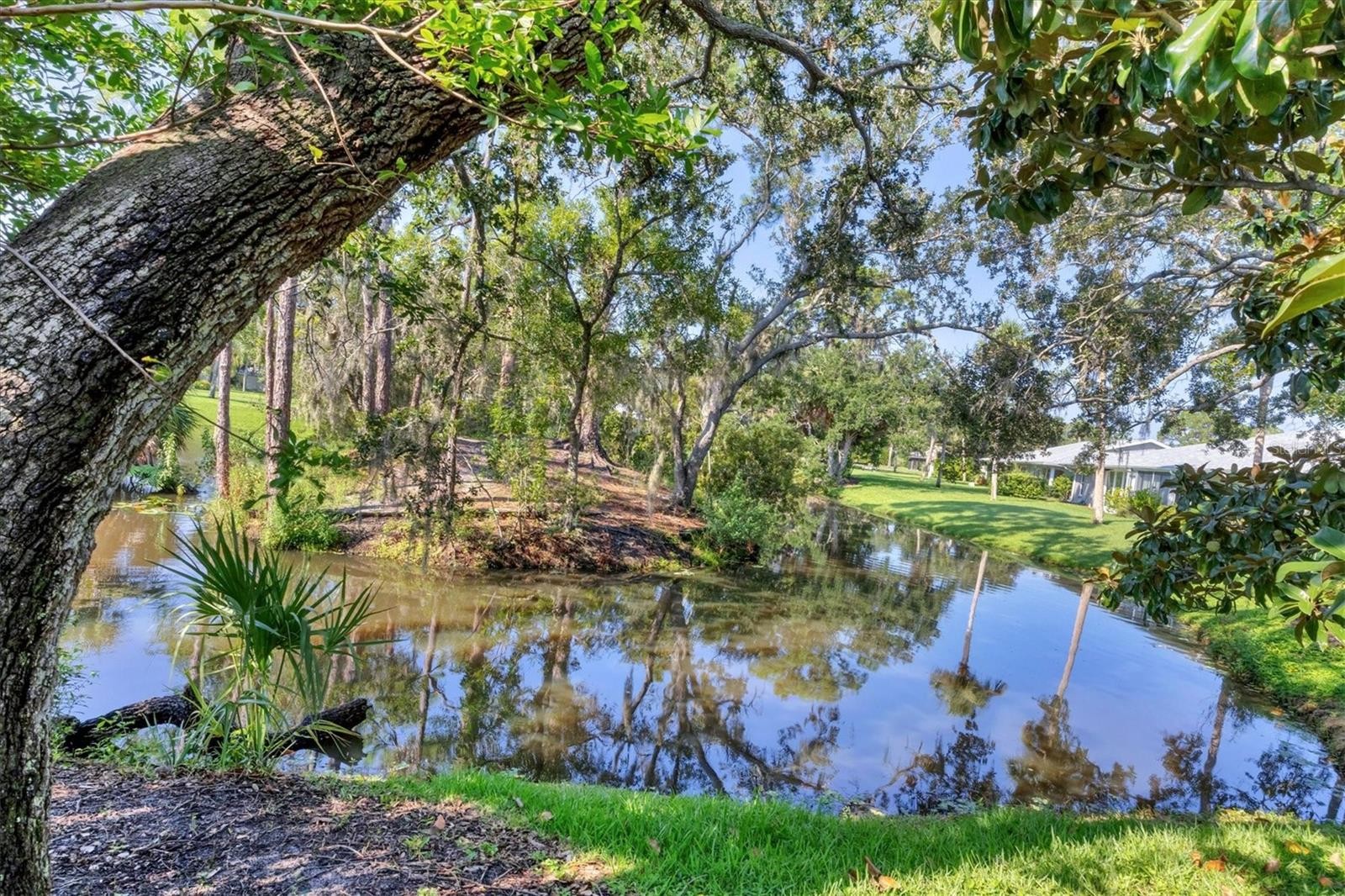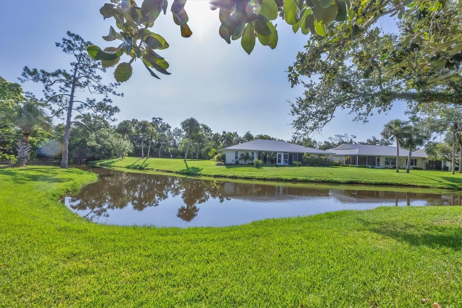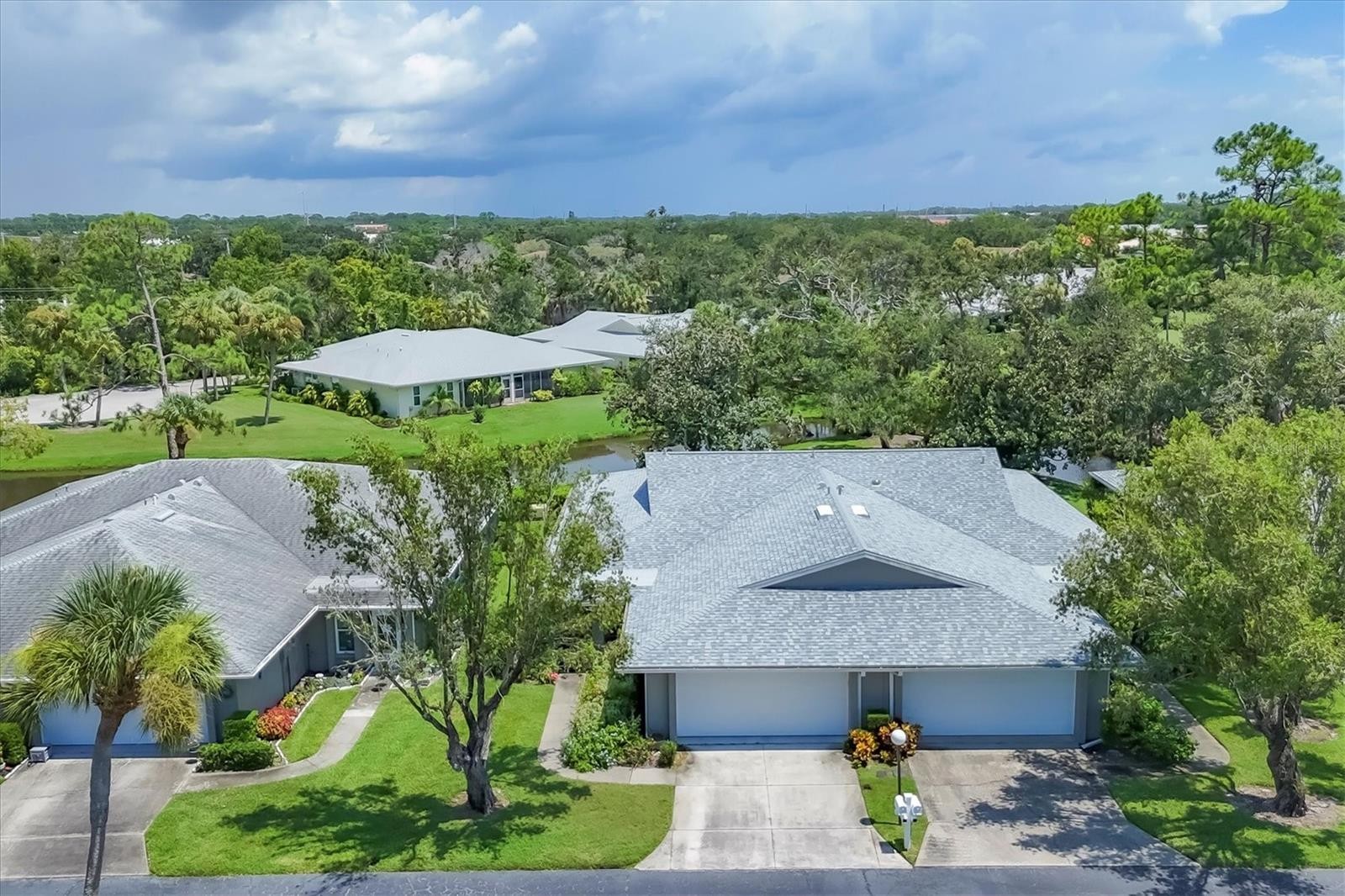 Tucked within Center Gate Village, this inviting home is ready for your updates—featuring a NEW ROOF (2023) and NEW A/C (2022), two separate living spaces, a bright Florida room, and peaceful pond views that make every day feel a little more relaxed. Step inside and you’re welcomed by a spacious living room at the front of the home, where natural light fills the space and flows easily into the dining area. A wide pass-through window from the kitchen to the dining room keeps the conversation going while meals are prepared. The kitchen provides ample cabinetry, generous counter space, and, on the opposite side, a breakfast bar with space for seating that opens to the great room. Just off the kitchen, the laundry room is equipped with extensive cabinetry for storage, a utility sink, and a countertop with additional storage underneath—keeping everything organized and within reach. The great room offers a comfortable second living space with plenty of room for seating and the option to add a casual dining area. Nearby, the second bedroom is conveniently positioned close to the full guest bathroom, making it ideal for visitors or a private home office. The primary bedroom is set at the back of the home and features sliding doors to the Florida room, a walk-in closet, and an en-suite bathroom with a vanity area, linen closet, and step-in shower. Accessible from both the great room and the primary bedroom, the Florida room is an inviting spot to relax year-round while overlooking the open grassy yard, mature trees, and glistening pond beyond. Center Gate Village residents enjoy access to a community pool and a location that truly delivers on convenience. Shopping, dining, medical facilities, and access to I-75 are right outside your door, while US-41 and the beautiful Gulf beaches are only a short drive west. Make this inviting home your own and start enjoying the best of Sarasota living!