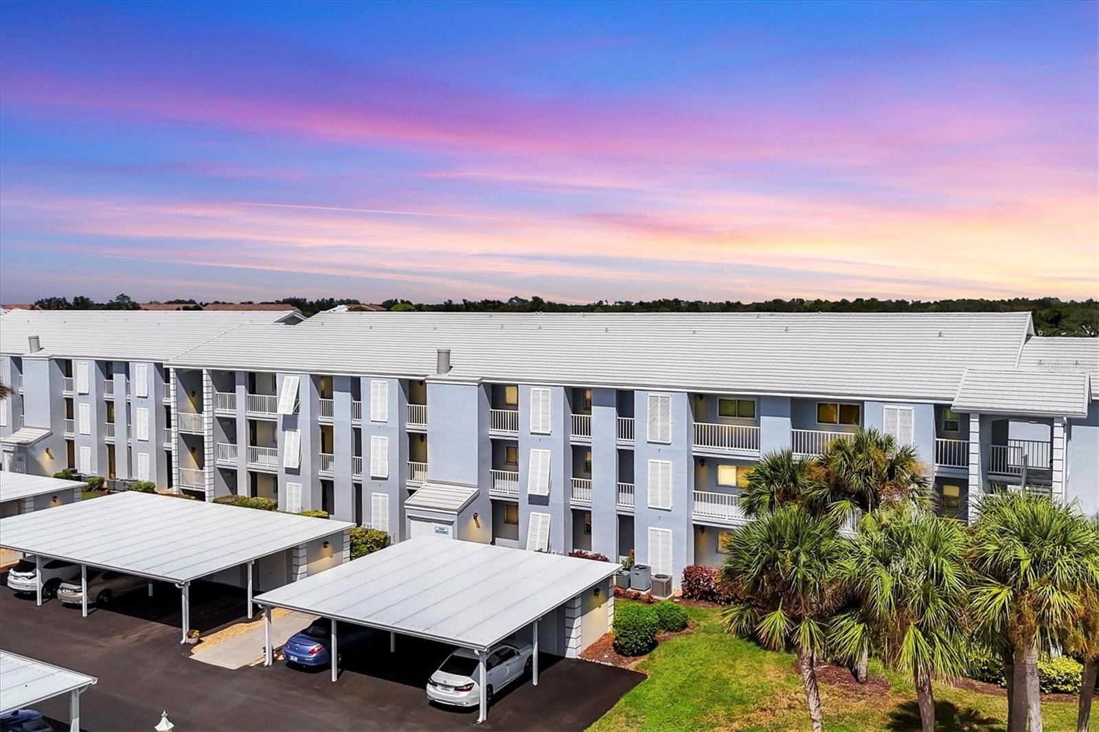 SPECTACULAR LAKE AND FAIRWAYS VIEWS await you from this TOP-FLOOR, END-UNIT Condominium - offered Turnkey Furnished, making it ready for immediate enjoyment whether as a full-time residence or seasonal retreat. This inviting 2-bedroom, 2-bath condo features a thoughtfully designed kitchen with granite countertops, a pass-through breakfast bar, white raised-panel cabinetry, dome ceiling and an updated pantry. The guest suite offers privacy with its own pocket door access to the second bedroom and bath, while the primary suite boasts a spacious walk-in closet, abundant natural light from end-unit windows, a convenient stack washer/dryer, and sliding doors leading to the enclosed lanai - perfect for soaking up the Florida sunshine. Vaulted ceiling in the dining and living areas enhanced the sense of openness and the living room seamlessly extends to the air-conditioned glass enclosed lanai, where you can enjoy year-round comfort while watching wildlife, golfers, or simply savoring morning coffee overlooking the 9th Fairway of the Bobcat Course. Recent updates include a newer roof, brand new carport with storage shed, exterior painting and freshly paved roads and dive ways. For added convenience, this building is equipped with an elevator (or stairs, if you prefer) and comes with a 9X9 storage room located in front of your covered parking space - ideal for bikes, golf clubs or beach gear. Westchester Gardens offers a vibrant social lifestyle with heated community pool, clubhouse and BBQ areas along with lush mature tropical landscaping. If you wish you can explore the various membership options at the Plantation Golf & Country Club - through membership is not mandatory. All of this is set in a tranquil community just minutes from, the pristine Gulf beaches, a wide array of dining and shopping, Wellen Park, The Atlanta Braves Spring Training Stadium, Historic Downtown Venice and easy access to US41 and I-75.