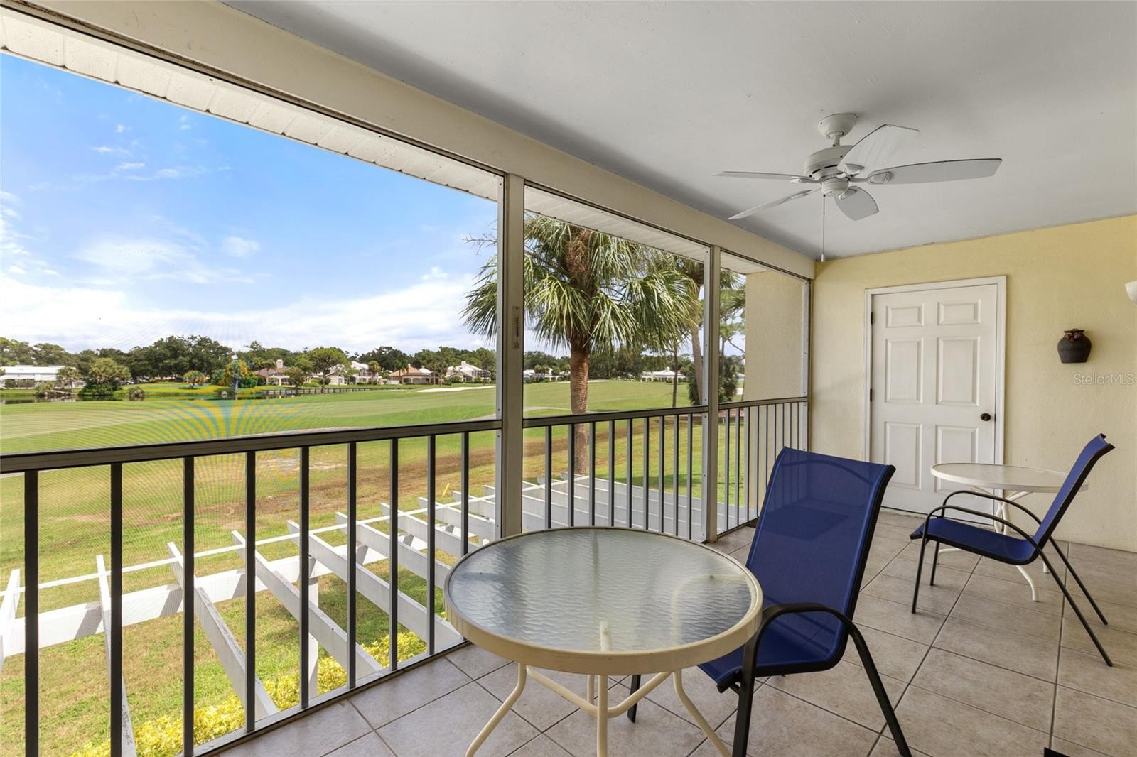 Stunning 2-bedroom, 2-bath condo with beautiful golf course views, just steps away from the pool, and located in Plantation Golf & Country Club. Overlooking the first hole of the Bobcat course, this light-filled home features vaulted ceilings and a spacious open floor plan designed for comfortable Florida living. The updated kitchen offers wood cabinetry, granite countertops, and appliances installed in 2020, while wood plank flooring flows throughout the great room and bedrooms. There is a laundry area with a full-sized washer and dryer within the condo. Enjoy peaceful lake and golf course views from the expansive screened lanai—perfect for morning coffee or relaxing afternoons. The condo is furnished in neutral tones and is offered fully furnished, making it move-in ready. Recent updates include a 2023 air conditioning system, 2022 water heater, and a private laundry room with a new washer in 2024. The primary suite features a walk-in closet, double sinks, spacious shower, and a private west-facing balcony ideal for sunset views or additional enclosed living space with sliding glass doors. Experience worry-free condominium living with professionally managed exterior maintenance. Major community improvements were completed in 2025, including new roofs, fresh exterior painting, and newly paved parking areas. The neighborhood offers a clubhouse and community pool just steps away. Plantation Golf & Country Club features two 18-hole championship golf courses, Har-Tru tennis courts, pickleball, bocce ball, fitness center, Jr. Olympic pool, dining, and social activities. Club membership is optional. Conveniently located minutes from Venice beaches, shopping, dining, Downtown Wellen Park, CoolToday Park, and I-75.