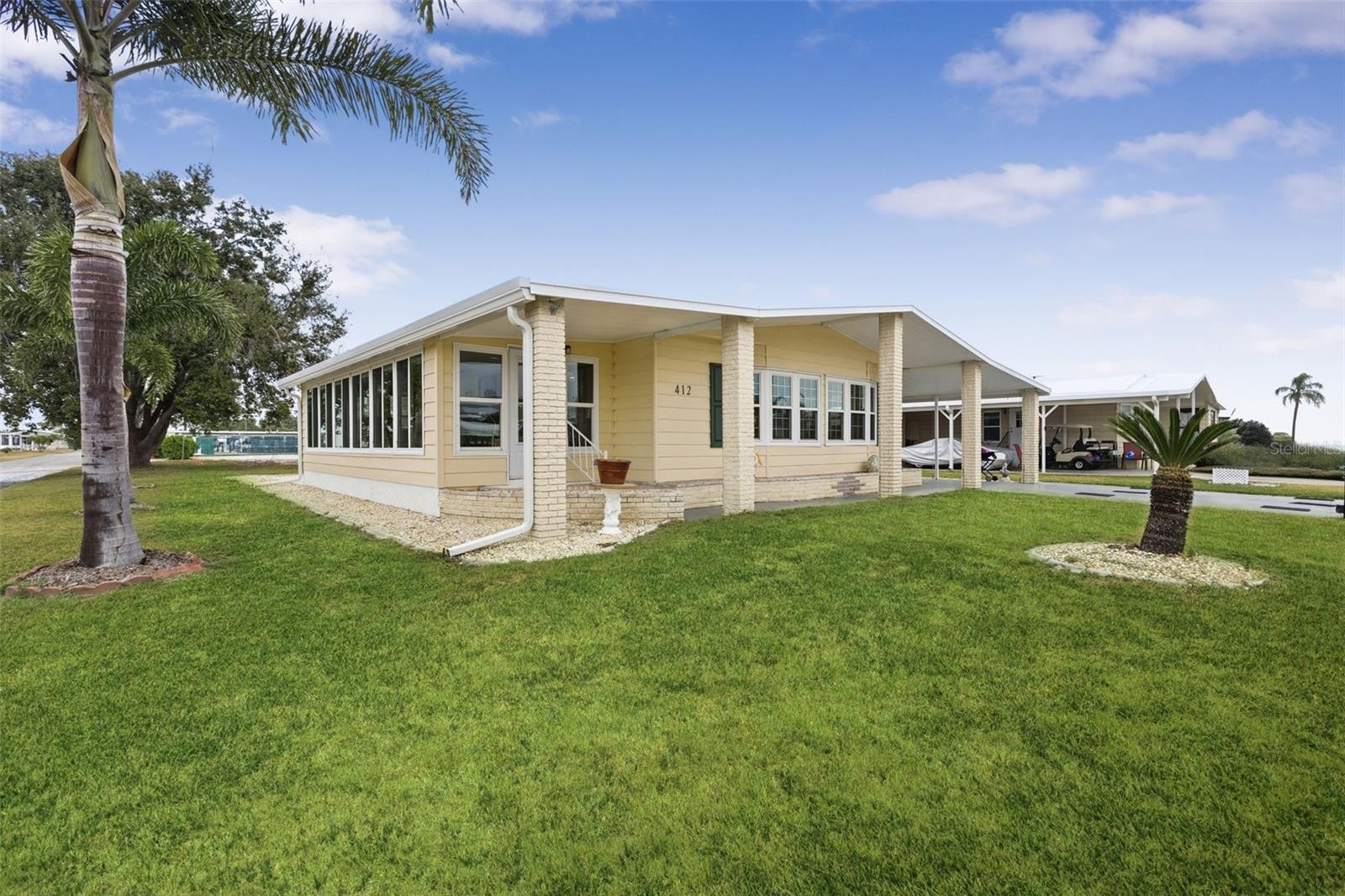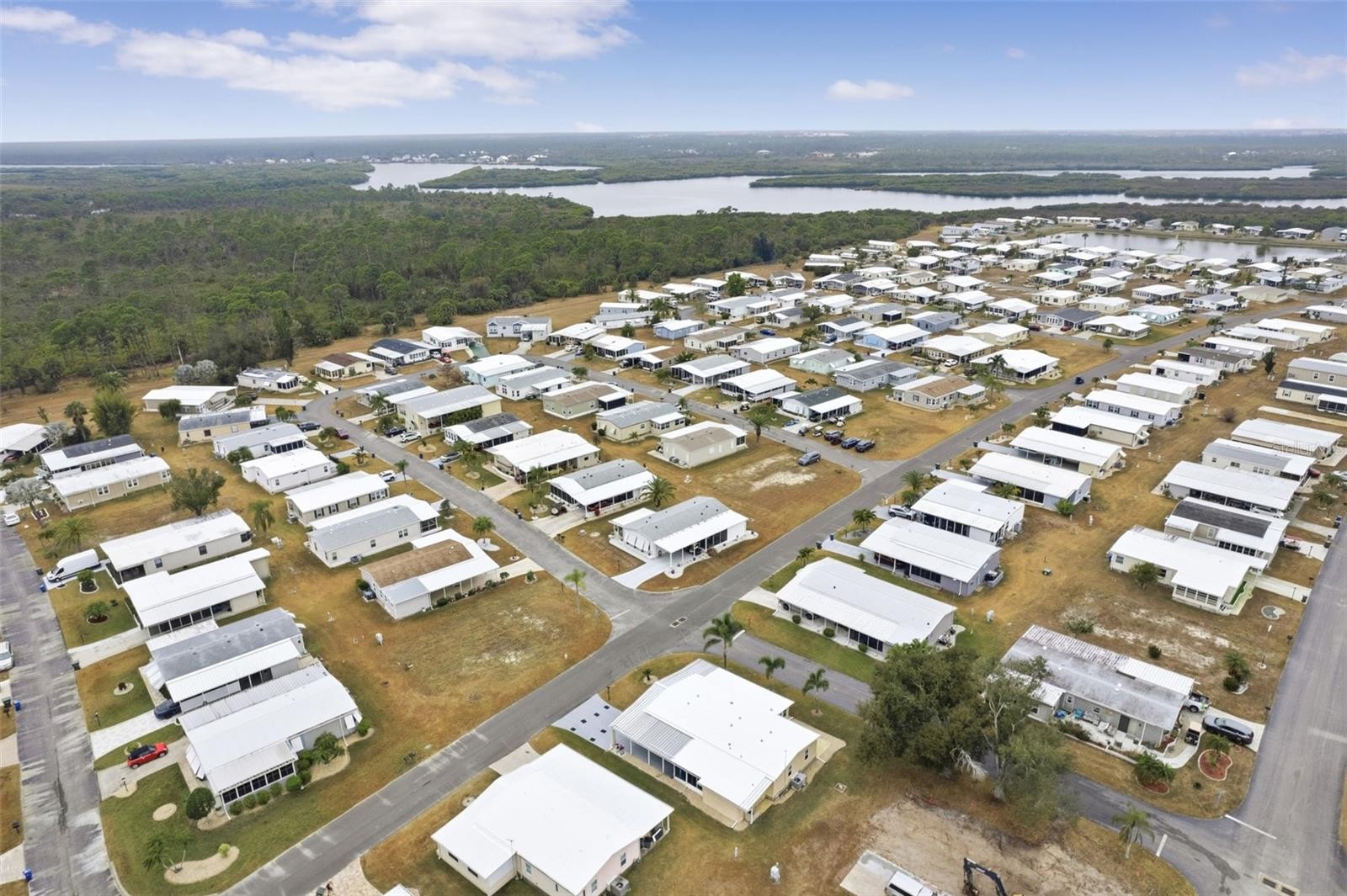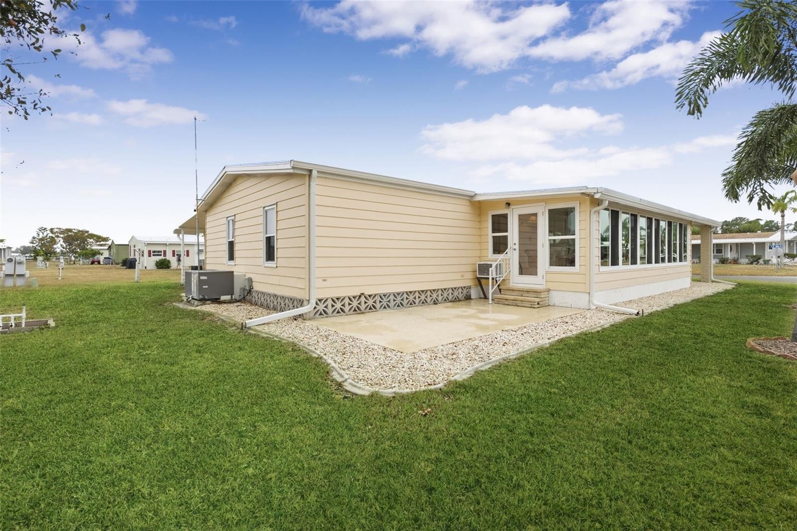 Brick pillars mark the entrance to this well-maintained two-bedroom, two-bath La Casa home. The pillars are secured to the overhang with tiedown straps. A widened, painted driveway leads to a tiled, vinyl-enclosed lanai and an extended utility room with a washer, dryer, deep sink, storage, and a 2020 electric water heater. The entry hall offers a washer and dryer hookup. The kitchen, remodeled in 2025, includes new cabinets, raised counters, a tiled backsplash, appliances, and a pantry. The open floor plan connects the kitchen, dining, and living areas into one spacious space. The bright living room features a vaulted ceiling and a sliding door to the carpeted Florida room, which includes a queen sleeper sofa and access to both the rear patio and the front covered walkway. Additional storage is available with a hall closet and a half pantry. The guest bedroom has two double closets and a sliding door to the Florida room. The guest bath offers a walk-in shower, new vanity, new commode, and a linen closet. The primary bedroom features a vaulted ceiling and two double closets, while the en suite bath includes a new vanity, commode, tiled walk-in shower, and extra cabinets for storage. Additional features include an automatic lawn sprinkler system, new windows (2017), new roof (2018), and A/C (2018). Come and enjoy the La Casa lifestyle in this lovely home located near our Rec Hall, pool and amenities. La Casa offers the ultimate lifestyle on Florida's Gulf Coast, and is located between Sarasota and Fort Myers with boat access to the Myakka River. La Casa is a quiet 55+ community of 974 home sites nestled among a variety of native trees. Spacious common grounds surround our eight lakes. Welcome To the Good Life! RECREATION, 2 Clubhouses, 2 Heated Pools. There is no shortage of activities in this community!