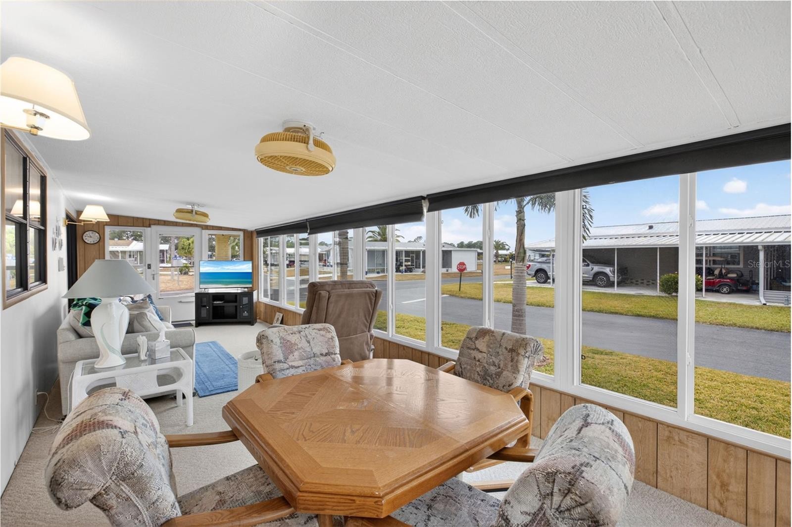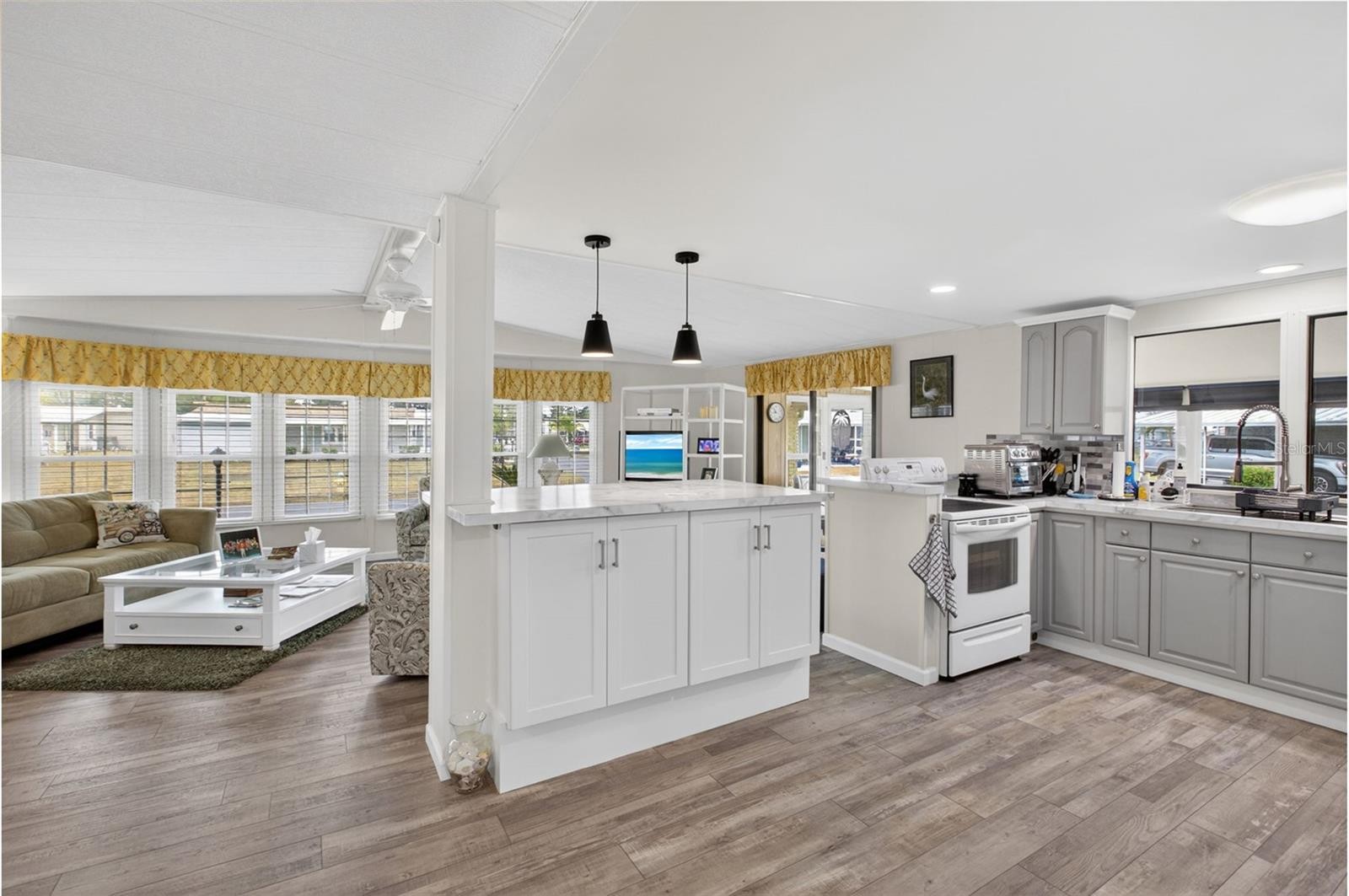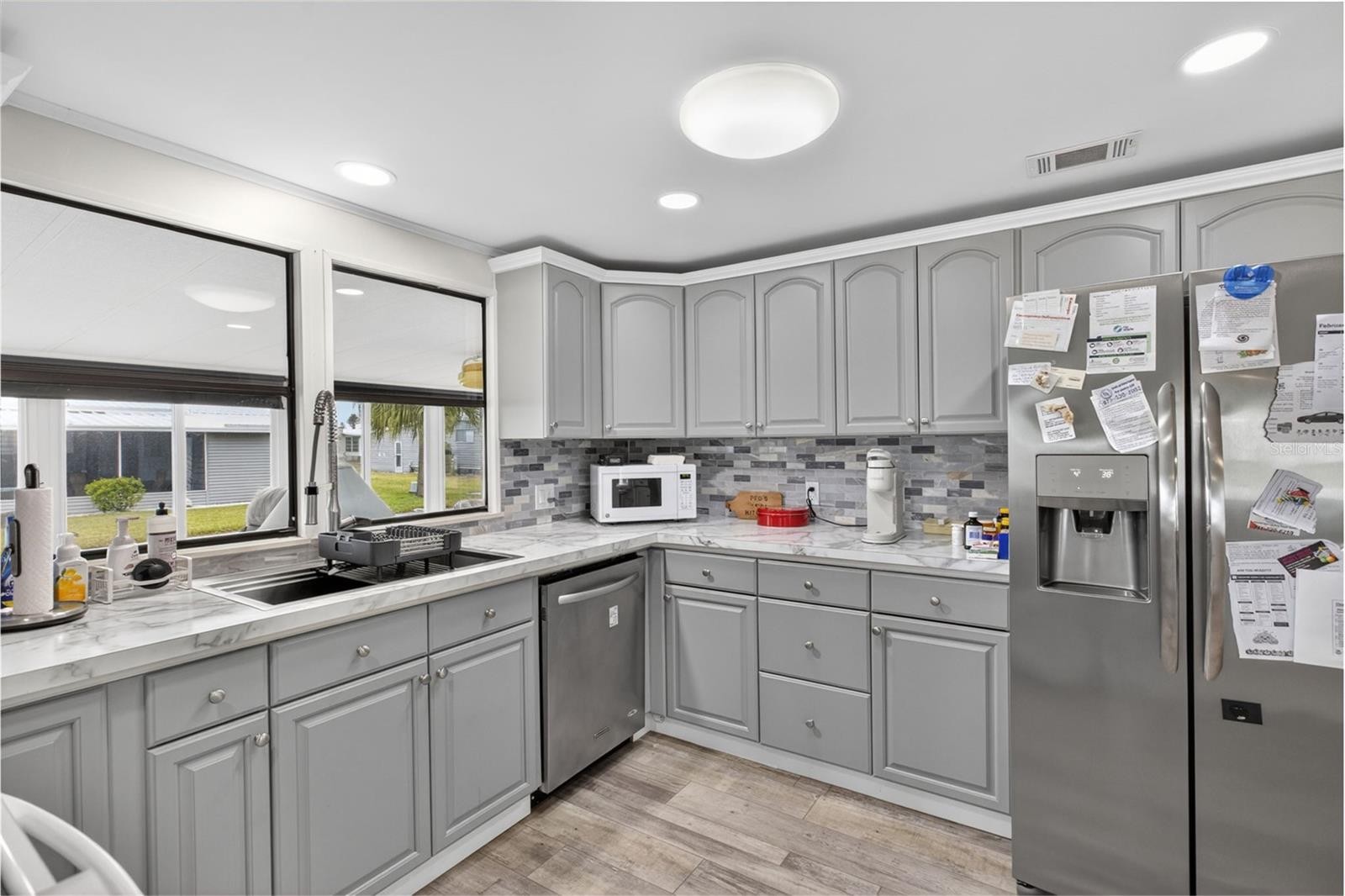 Brick pillars mark the entrance to this well-maintained two-bedroom, two-bath La Casa home. The pillars are secured to the overhang with tiedown straps. A widened, painted driveway leads to a tiled, vinyl-enclosed lanai and an extended utility room with a washer, dryer, deep sink, storage, and a 2020 electric water heater. The entry hall offers a washer and dryer hookup. The kitchen, remodeled in 2025, includes new cabinets, raised counters, a tiled backsplash, appliances, and a pantry. The open floor plan connects the kitchen, dining, and living areas into one spacious space. The bright living room features a vaulted ceiling and a sliding door to the carpeted Florida room, which includes a queen sleeper sofa and access to both the rear patio and the front covered walkway. Additional storage is available with a hall closet and a half pantry. The guest bedroom has two double closets and a sliding door to the Florida room. The guest bath offers a walk-in shower, new vanity, new commode, and a linen closet. The primary bedroom features a vaulted ceiling and two double closets, while the en suite bath includes a new vanity, commode, tiled walk-in shower, and extra cabinets for storage. Additional features include an automatic lawn sprinkler system, new windows (2017), new roof (2018), and A/C (2018). Come and enjoy the La Casa lifestyle in this lovely home located near our Rec Hall, pool and amenities. La Casa offers the ultimate lifestyle on Florida's Gulf Coast, and is located between Sarasota and Fort Myers with boat access to the Myakka River. La Casa is a quiet 55+ community of 974 home sites nestled among a variety of native trees. Spacious common grounds surround our eight lakes. Welcome To the Good Life! RECREATION, 2 Clubhouses, 2 Heated Pools. There is no shortage of activities in this community!