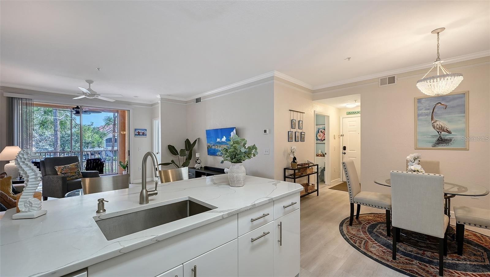 Located in Bella Villino on Palmer Ranch, beautifully renovated condo with pond & resort views. This large 1-bedroom, 1-bathroom second-floor condo is now available for annual rental and can be rented furnished, partially furnished, or unfurnished. As you Step inside this open, light-filled floor plan, you will find a stylish new kitchen featuring European-style cabinetry, quartz countertops, and a convenient breakfast bar—perfect for both everyday living and entertaining. The spacious living area opens onto a large, screened lanai, where you can relax and enjoy peaceful views of the pond, resort-style pool, and clubhouse. Luxury vinyl plank flooring throughout the main living spaces. Spacious bedroom, updated bathroom with a custom vanity and quartz countertops, and tub/shower combo. The separate laundry room has built-in shelving, and a full-size washer and dryer. Located in the sought-after Bella Villino community, residents enjoy an impressive array of resort-style amenities, including a heated pool and spa, clubhouse, indoor racquetball/basketball court, billiards room, tennis courts, media room, car detail bay, gas grills, picnic areas, and on-site management. Ideally situated near Siesta Key and beautiful Gulf beaches, nature preserves, the Legacy Trail, golf, shopping, restaurants, and so much more. Sarasota lifestyle living at its best!