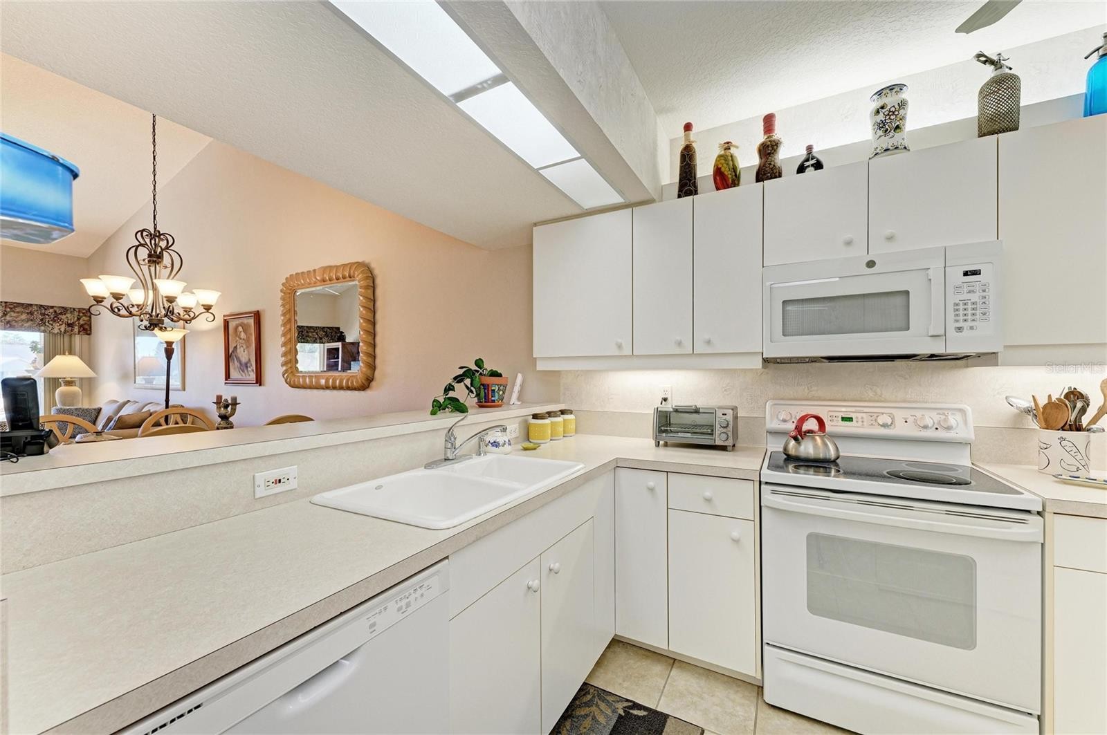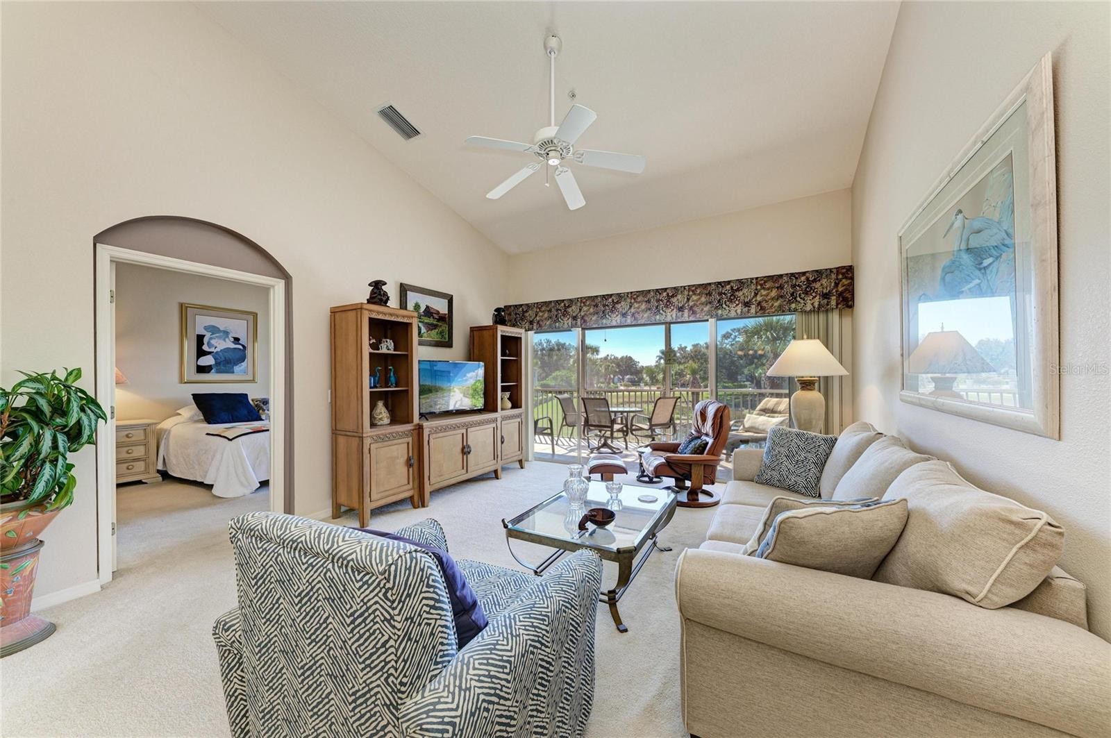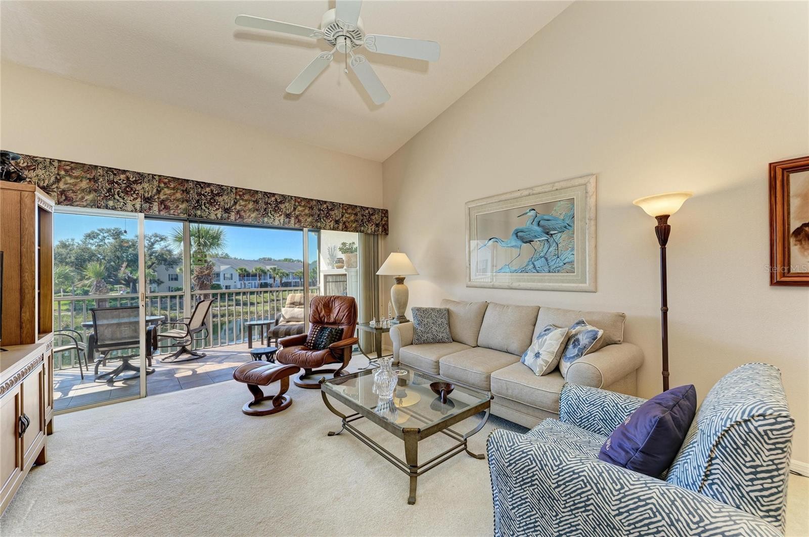 Fabulous opportunity to join the active community of Waterside Village in this immaculate, well maintained condo. The second floor home offers maximum privacy and incredible sunset views of the lake below. Cathedral ceilings give the open floor plan an expansive feel and opens to a spacious lanai overlooking the lake. A screened front porch welcomes your guests into a lovely foyer. Step into the spacious dining/living room with sliding glass doors to the lanai. Enjoy cooking in the well maintained kitchen which includes lots of cabinets with newly installed pull out drawers for storage and a recently replaced dishwasher. The cozy breakfast nook has bay windows with blinds (the stained glass covering will not stay with the home). In addition to lots of cabinets, there's a desk for organization. The comfortable owners' suite offers views of the lake below and includes a private bath with dual vanities, large walk-in shower and a huge walk-in closet. A guest bedroom, currently used as an office, is conveniently located near the kitchen for maximum privacy and boasts a spacious built-in closet and an adjoining full bath. You will love the privacy on the large lanai which offers views of the lush landscaping and nature surrounding the lake and includes pull down sun shades when the Florida sun gets too intense. There is an enclosed laundry room off the lanai which includes a brand new washing machine and lots of storage. This well maintained home also includes a brand new water heater, newly serviced air conditioner and all appliances have been regularly serviced. Included with this home is a designated carport and a private, locked, spacious storage unit. The friendly neighborhood has tons of guest parking right outside your door. Waterside Village amenities are beyond amazing! Enjoy swimming in one of 3 pools, playing tennis or pickleball, bocce, shuffleboard and gathering friends and family in the Clubhouse with a spacious screened porch for luncheons, games or meetings overlooking the pool. The community offers a wide variety of social activities, from card games and fitness classes to book clubs with a private lending library. The low monthly condo fee includes exterior maintenance, landscaping, water, sewer, trash, cable, pest control, building insurance and roof replacement. Waterside Village is conveniently located near the Historicl Downtown Venice, professionally run Community Theatre, restaurants, shops, fabulous Venice beaches, medical facilities, grocery stores, and a nearby golf course. Schedule your showing today!