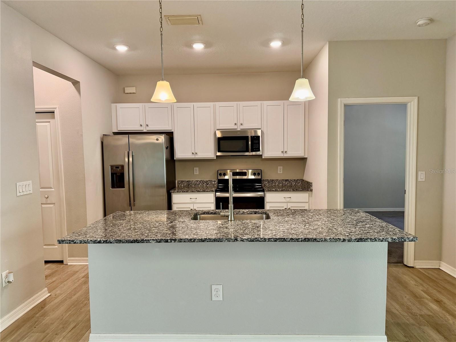 Charming 3-bedroom, 2-bath modern home with 1,548 square feet of comfortable living space, built in 2020 with modern design and everyday functionality in mind. The spacious open floor plan features luxury vinyl flooring throughout the main living areas and soft carpeting in the bedrooms, creating a stylish yet inviting atmosphere. The kitchen is thoughtfully designed with recessed lighting, stainless steel appliances, granite countertops, a pantry, and a large island with barstool seating that overlooks both the living room and separate dining area—perfect for entertaining or daily living. Sliding glass doors open to a covered lanai, providing a relaxing space to unwind and enjoy the outdoors. The generously sized primary suite includes two walk-in closets and a private ensuite bathroom with a tiled walk-in shower, granite countertop, and dual vanity sinks. The secondary bedrooms are also well-proportioned, making them ideal for family, guests, or a home office setup. Located outside of a flood zone and with no HOA dues or CDD fees, this home delivers added value and peace of mind. Schedule your private showing today.