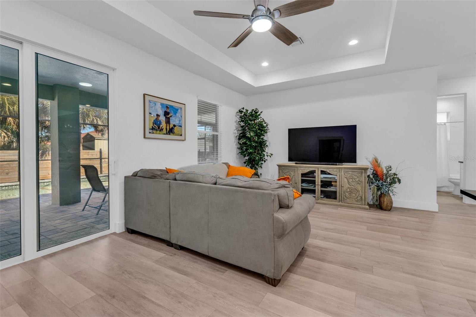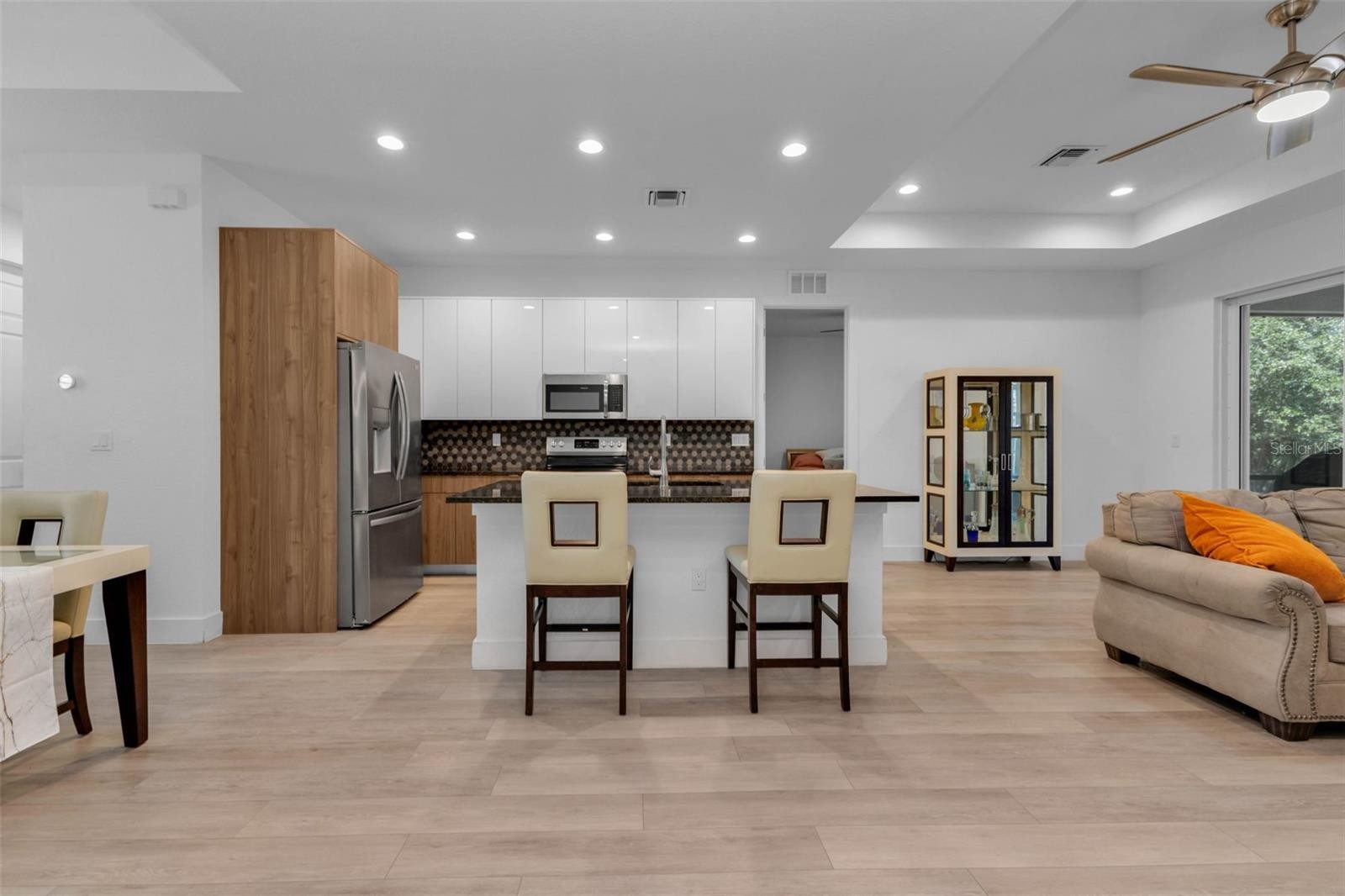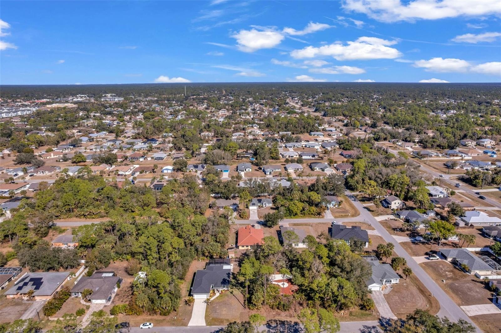 HIGH & DRY IN FLOOD ZONE X — BEAUTIFUL 2022-BUILT SALTWATER POOL HOME ON A PRIVATE DOUBLE LOT. Morning coffee tastes different when you step through the impact sliders and onto your lanai, the aqua-blue saltwater pool shimmering in the early light. Palms sway beyond the screen enclosure. No tight back neighbors pressing in. Just trees, sky, and the quiet kind of privacy that feels intentional. This 3 bedroom, 2 bath residence sits on a rare double lot — a meaningful distinction on this street where many homeowners have intentionally secured the lot beside them to preserve space and separation. It changes the entire feel of the property — expansive, protected, peaceful. Built with solid concrete block construction and impact windows and sliders throughout, this home offers strength and peace of mind without the need for shutters or last-minute storm preparation. Inside, the design is crisp and modern with warmth woven through it. Tray ceilings elevate the main living area. Recessed lighting keeps the lines clean. Wide plank flooring grounds the home in a soft coastal palette. The kitchen is striking without being flashy — glossy white upper cabinetry balanced by warm wood lowers, granite countertops, stainless appliances, and a contemporary backsplash that adds texture and depth. The oversized island invites conversation, wine glasses, homework, and late-night laughter. It opens naturally into the living and dining areas while still feeling defined and intentional. The primary suite offers a quiet retreat. Guest bedrooms are light-filled and welcoming — ideal for visitors, family, or a refined home office. Bathrooms carry through the same polished finishes with modern vanities and granite surfaces. And then — the outdoor living. The covered lanai is generous and shaded, perfect for entertaining as music drifts and conversations stretch long into the evening. The screened enclosure frames the pool beautifully, while the surrounding paver deck gives you space to lounge, gather, and truly live outside the way Florida living was meant to be. The additional lot provides breathing room and flexibility — whether preserved as green space or simply enjoyed as the buffer that makes this home feel different from the rest. This is not just a newer home. It is intentional Florida living — done right.