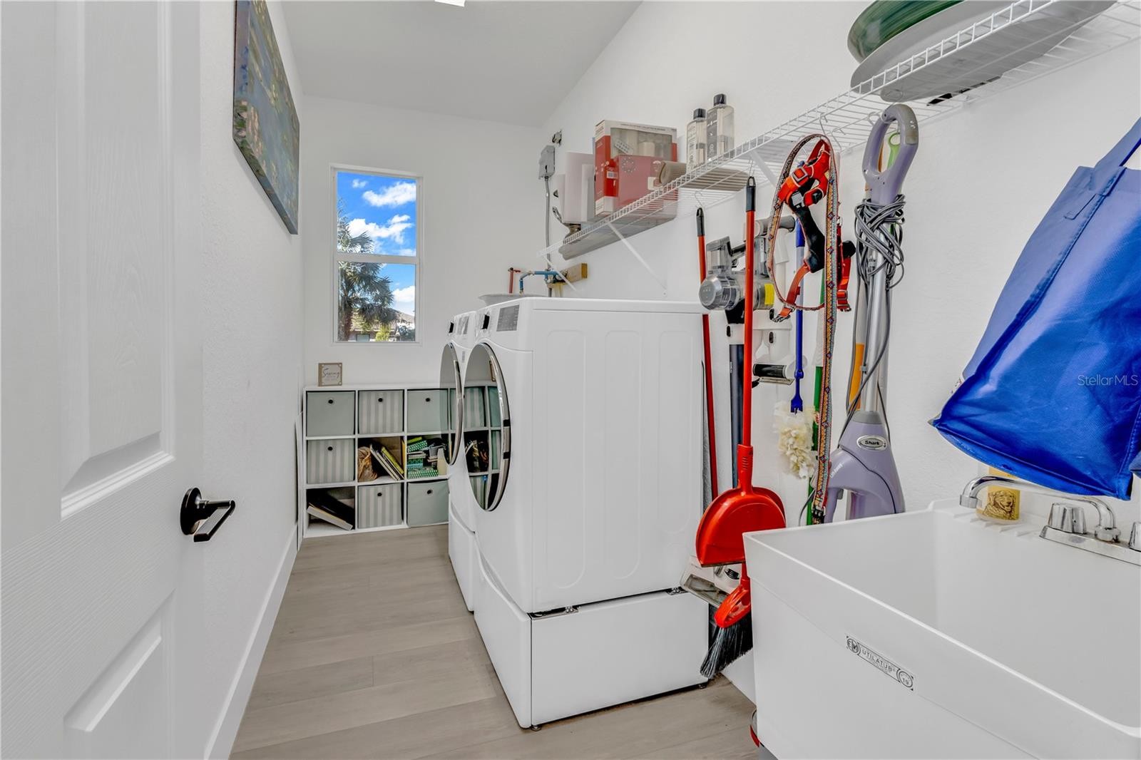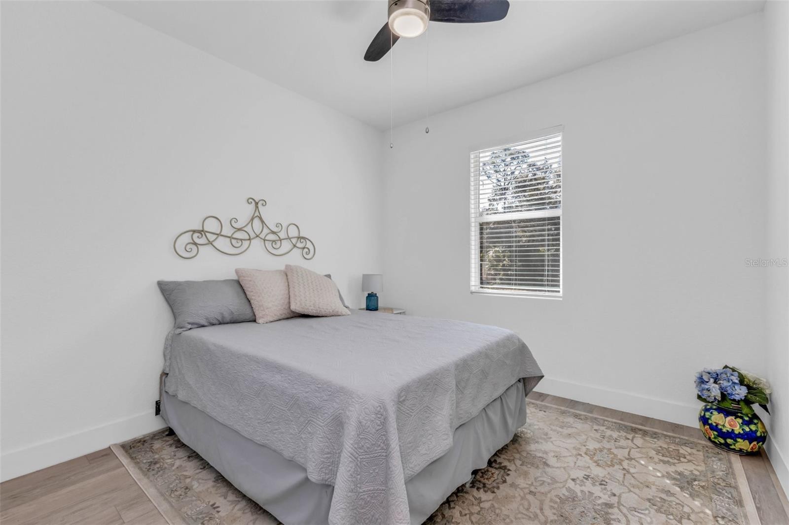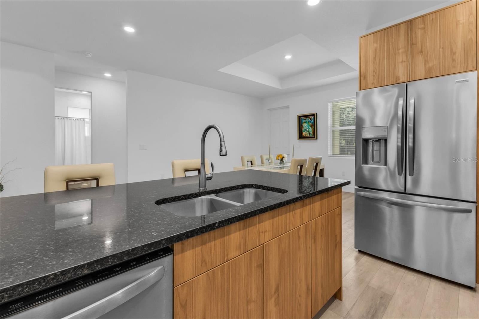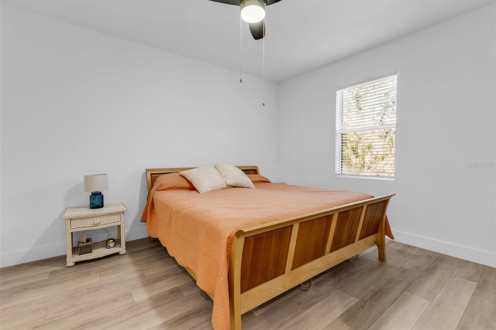 HIGH & DRY IN FLOOD ZONE X — BEAUTIFUL 2022-BUILT SALTWATER POOL HOME ON A PRIVATE DOUBLE LOT. Morning coffee tastes different when you step through the impact sliders and onto your lanai, the aqua-blue saltwater pool shimmering in the early light. Palms sway beyond the screen enclosure. No tight back neighbors pressing in. Just trees, sky, and the quiet kind of privacy that feels intentional. This 3 bedroom, 2 bath residence sits on a rare double lot — a meaningful distinction on this street where many homeowners have intentionally secured the lot beside them to preserve space and separation. It changes the entire feel of the property — expansive, protected, peaceful. Built with solid concrete block construction and impact windows and sliders throughout, this home offers strength and peace of mind without the need for shutters or last-minute storm preparation. Inside, the design is crisp and modern with warmth woven through it. Tray ceilings elevate the main living area. Recessed lighting keeps the lines clean. Wide plank flooring grounds the home in a soft coastal palette. The kitchen is striking without being flashy — glossy white upper cabinetry balanced by warm wood lowers, granite countertops, stainless appliances, and a contemporary backsplash that adds texture and depth. The oversized island invites conversation, wine glasses, homework, and late-night laughter. It opens naturally into the living and dining areas while still feeling defined and intentional. The primary suite offers a quiet retreat. Guest bedrooms are light-filled and welcoming — ideal for visitors, family, or a refined home office. Bathrooms carry through the same polished finishes with modern vanities and granite surfaces. And then — the outdoor living. The covered lanai is generous and shaded, perfect for entertaining as music drifts and conversations stretch long into the evening. The screened enclosure frames the pool beautifully, while the surrounding paver deck gives you space to lounge, gather, and truly live outside the way Florida living was meant to be. The additional lot provides breathing room and flexibility — whether preserved as green space or simply enjoyed as the buffer that makes this home feel different from the rest. This is not just a newer home. It is intentional Florida living — done right.
