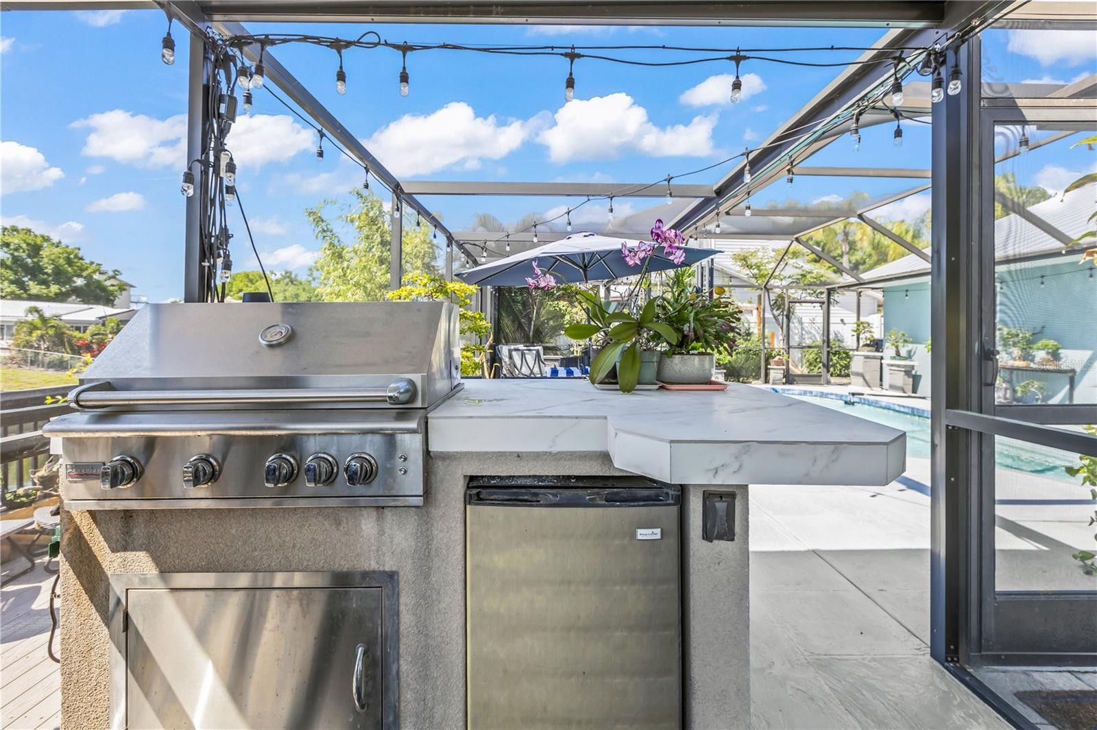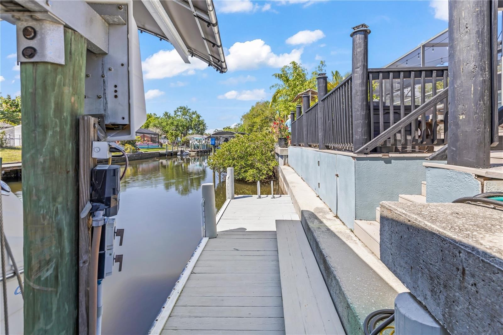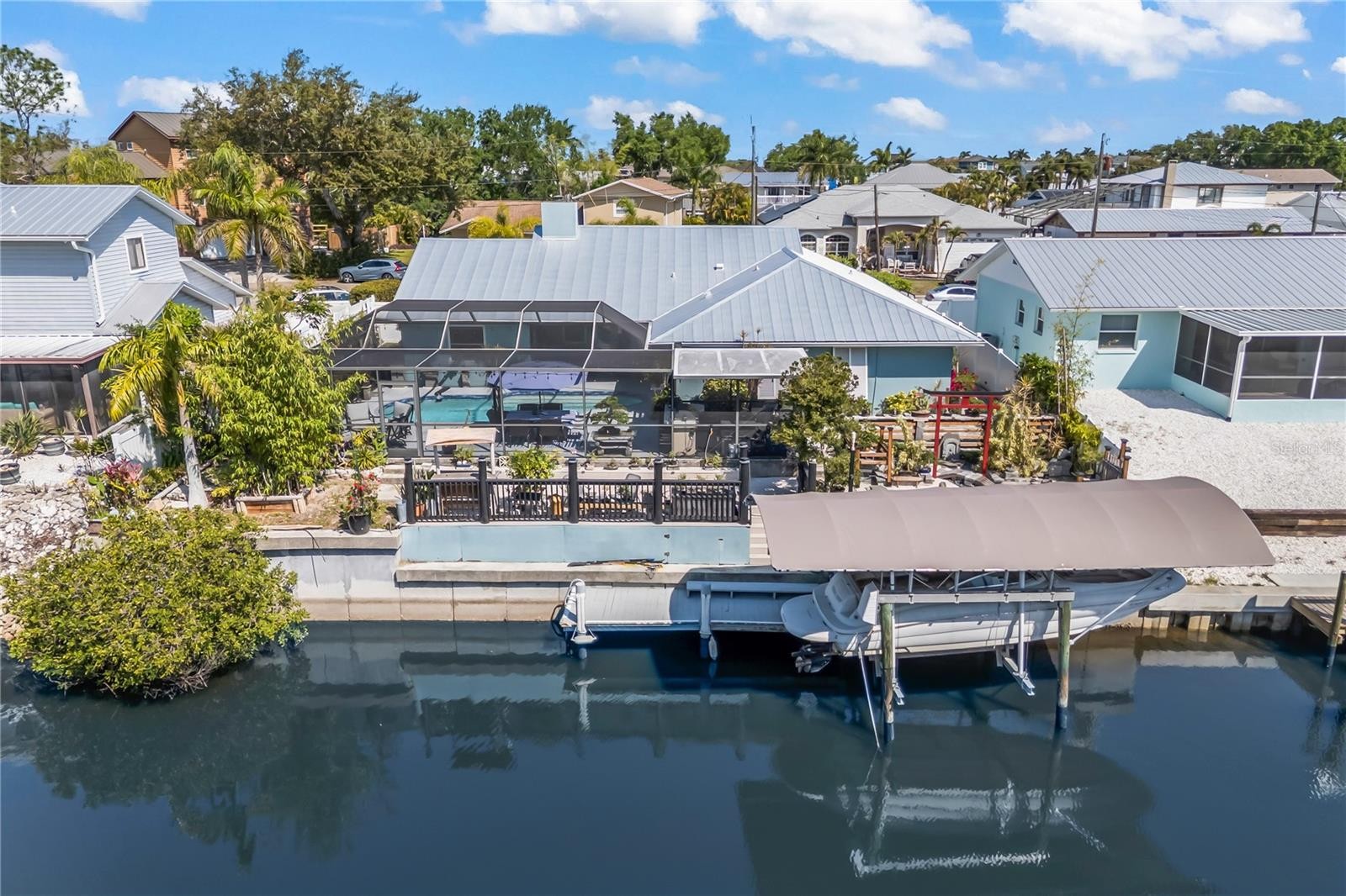 This 4-bedroom, 2-bath home on a canal is truly move-in ready, with direct boating access and your own boat lift, plus a private pool. Every detail has been thoughtfully upgraded. Improvements include a metal roof (2023), hurricane-proof front door, side panels, garage doors, and bermuda shutters, plus professionally painted walls and an extended lanai with updated screens—perfect for enjoying the Florida lifestyle worry-free. Your outdoor living space is a coastal paradise, featuring a resurfaced pool and deck, new pool heater, outdoor kitchen island, fire pit, decorative fences, and beautiful landscaping. Inside, the home is equally impressive with a mini-split garage A/C, spacious two-car garage, and all systems maintained in excellent condition. From morning coffee overlooking the canal to sunset evenings by the pool or fire pit, this home blends comfort, style, and functionality at every turn. Move in, bring your boat, and start living the ultimate Florida waterfront lifestyle!