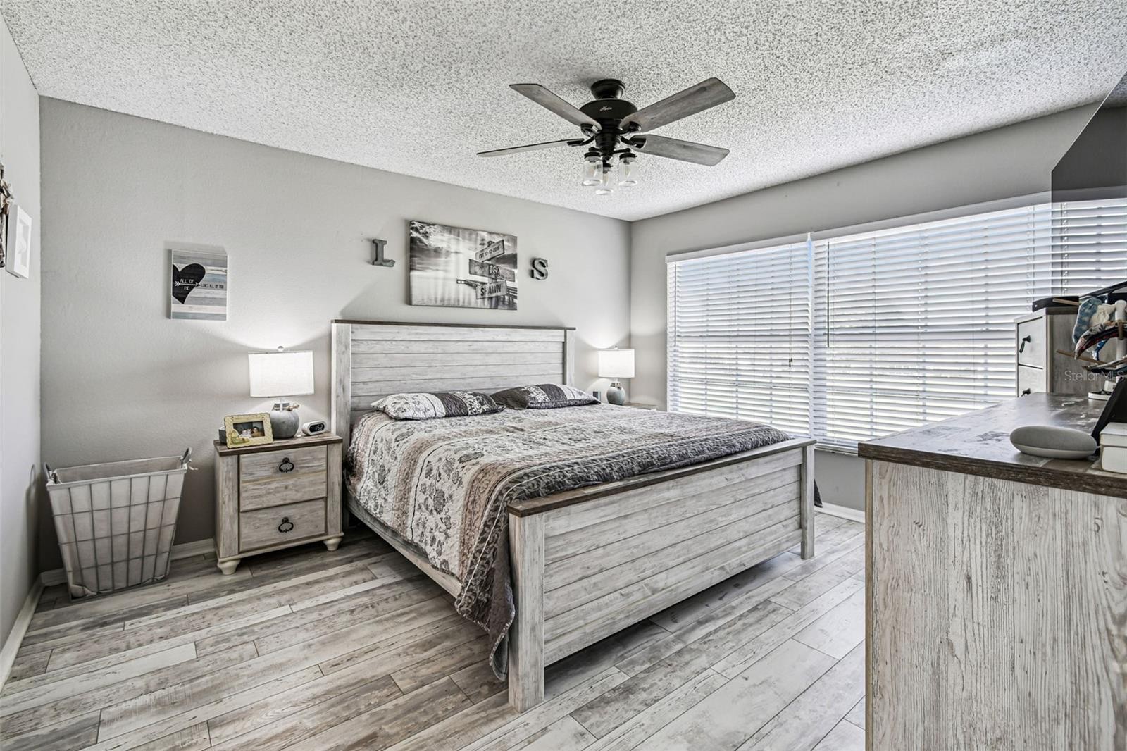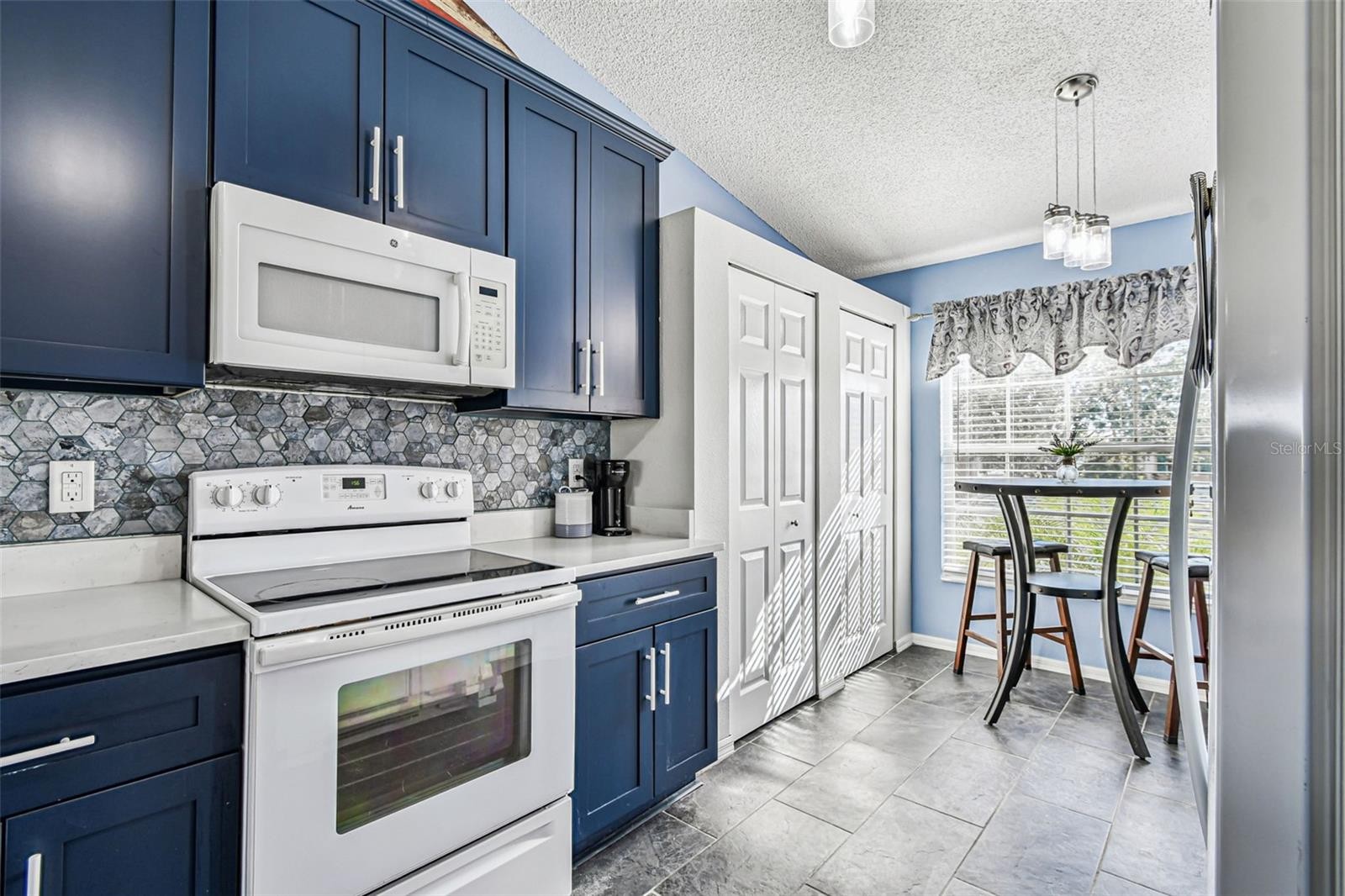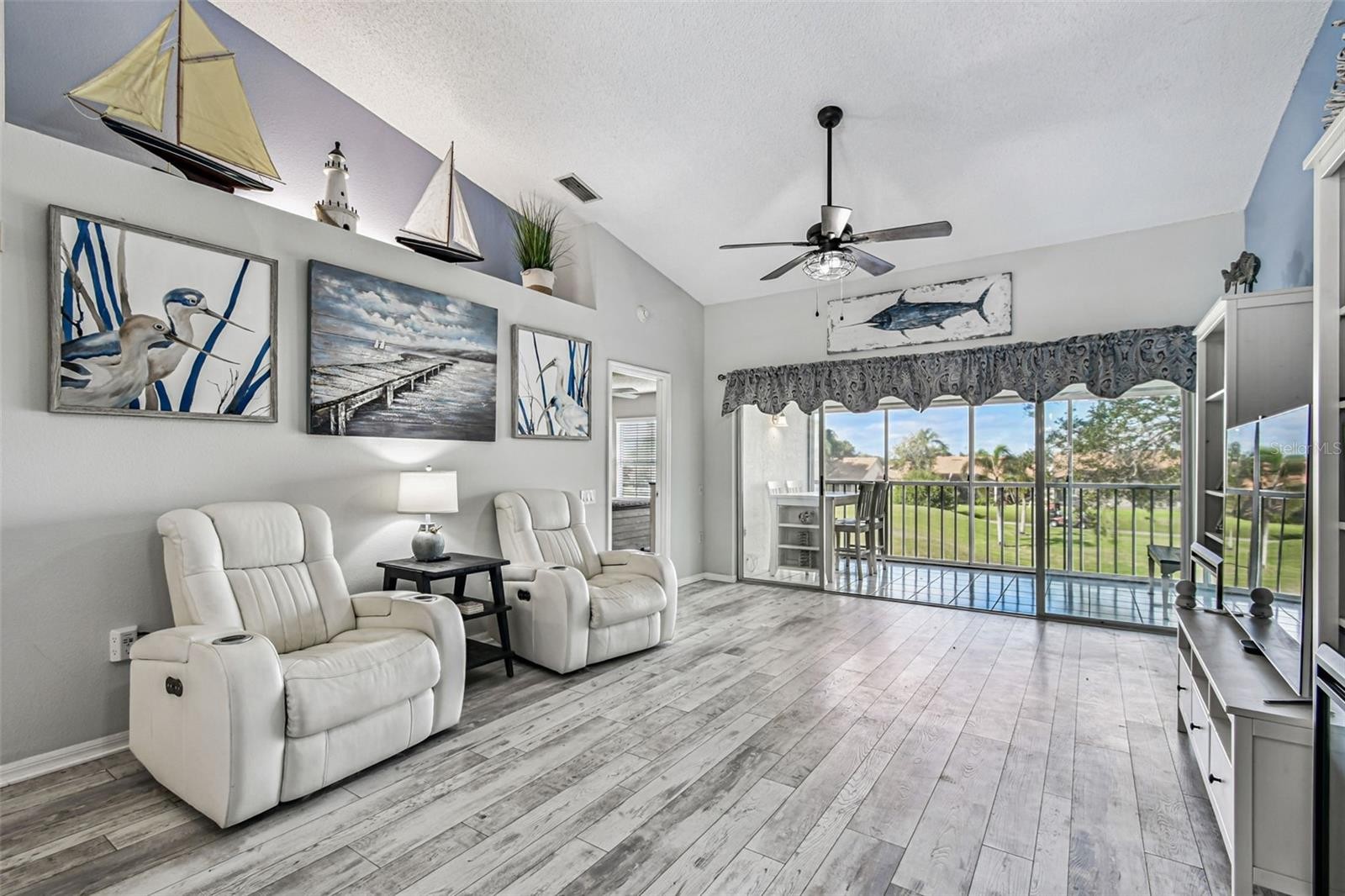 If you are looking for a condo offering COASTAL VIBES, your search is over! Located in the Golf Course Community of Peridia, this 2 BEDROOMS, 2 BATH, 1 CAR GARAGE Condo offers a SPLIT FLOOR PLAN, VAULTED CEILINGS and AMAZING VIEWS OF THE GOLF COURSE! Stepping inside you will be greeted with WHITEWASHED WOOD LOOK LVP FLOORING throughout the MAIN LIVING AREA, FOYER AND BEDROOMS. The Kitchen has been FULLY REMODELED (2023) with SHAKER CABINETS IN A TIDAL BLUE SHADE, QUARTZ COUNTERTOPS AND BEAUTIFUL DEEP BLUE TILE FLOORS. Storage is not an issue as this Kitchen offers a floor to ceiling cabinet and a wall of closet for additional storage. There is a nook for you to dine in or choose the EAT AT BAR that extends the width of the kitchen. The Main Living and Dining area feel spacious with vaulted ceilings and the large slider to the lanai with views of the Golf Course (Green of Hole 5). Grab your clubs and practice some chipping and putting! The Primary Bedroom also have views of the golf course and is sizable to fit a king size bedroom suite (Furniture shown in photos included). The hallway leads to the walk-in closet and ensuite bathroom offers a large walk-in shower and glass door. The second bedroom is situated off the foyer, so the split is perfect for guests. The Guest Bath offers shower/tub combo. The stackable washer and dryer are also located in this area. The community offers a Community Pool, Golf Course, Pickleball and Tennis Courts, Club House and Restaurant. Maintenance fees include Cable TV, Exterior Maintenance, Roofs, Exterior Paint, Water, Sewer, Trash, Grounds Maintenance. HVAC AND WATER HEATER REPLACED IN 2023.
