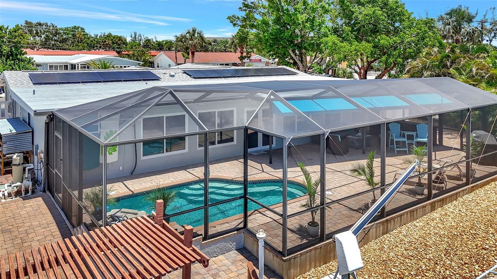Discover the ultimate Florida waterfront lifestyle in this canal-front pool home located in the highly desirable San Remo Shores boating community with no bridges to the Gulf of Mexico. Great Vacation spot, close to the Beaches! This home did not flood and offers true boat-to-bay convenience with a private dock and 10,000 lb boat lift on saltwater canal waters ideal for serious boaters. Inside, you’ll find a stunning custom chef’s kitchen designed for both everyday living and entertaining, featuring a large center island, expansive prep space, custom cabinetry, quartz countertops, and newer high-end appliances including a cooktop with vented hood. The home offers three spacious bedrooms, three full bathrooms, and a large bonus room with its own mini-split air conditioning system, perfect for a home theater, office, gym, or flex space, or covert back onto a garage. Step outside to a private backyard retreat where a sparkling swimming pool with waterfall overlooks the canal, creating the perfect setting for relaxing or entertaining. The expansive screened lanai includes a large covered entertaining area, while the oversized corner lot provides exceptional privacy, extra parking, and a circular paver driveway. Additional features include a new air conditioner in 2025, a roof replaced in 2020, and owned solar panels installed in 2021 to help keep electric costs low. Enjoy breathtaking sunsets, excellent boating water, and convenient access to nearby beaches, dining, and shopping, all while enjoying the flexibility of an optional HOA. This waterfront home delivers comfort, functionality, and the boating lifestyle buyers are searching for in Bradenton.