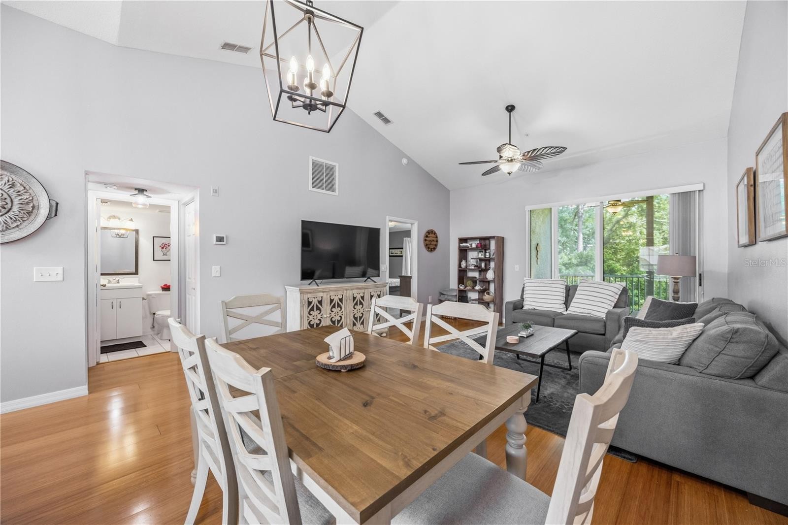 Welcome to Pinestone at Palmer Ranch, one of Sarasota’s most desirable gated communities offering true resort-style living in the heart of Palmer Ranch. This beautifully updated unit delivers the perfect blend of style, comfort, and convenience. This natural light-filled residence features vaulted ceilings and an open-concept layout, enhanced by rich bamboo flooring and LED recessed dimmable lighting, creating a warm yet modern ambiance throughout. The beautifully updated kitchen showcases elegant quartz countertops, a mosaic tile backsplash, newer stainless steel appliances and thoughtful finishes that elevate both form and function. Designer ceiling fans and a mobile-controlled thermostat add comfort and efficiency, while a stackable washer and dryer provide everyday convenience. The split-bedroom floor plan offers privacy for both owners and guests, with spacious living and dining areas that flow seamlessly to a private screened lanai perfect for morning coffee or relaxing evenings. Residents enjoy lush tropical surroundings and an impressive array of amenities, including a resort-style heated pool and spa, fitness, billiards room, library, tennis and pickleball courts, shuffle board, basketball, fire pit, BBQ grills, there is even a private community theater! An active social calendar and welcoming atmosphere make this community truly stand out. Ideally located just minutes from Siesta Key Beach, as well as shopping, dining, and the Legacy Trail, with easy access to I-75, this home offers the best of Sarasota living. Whether you're searching for a full-time residence or a seasonal getaway, this move-in ready condo checks all the boxes for easy Florida living. ***Couch, loveseat and area rug in living room, conveys with sale.