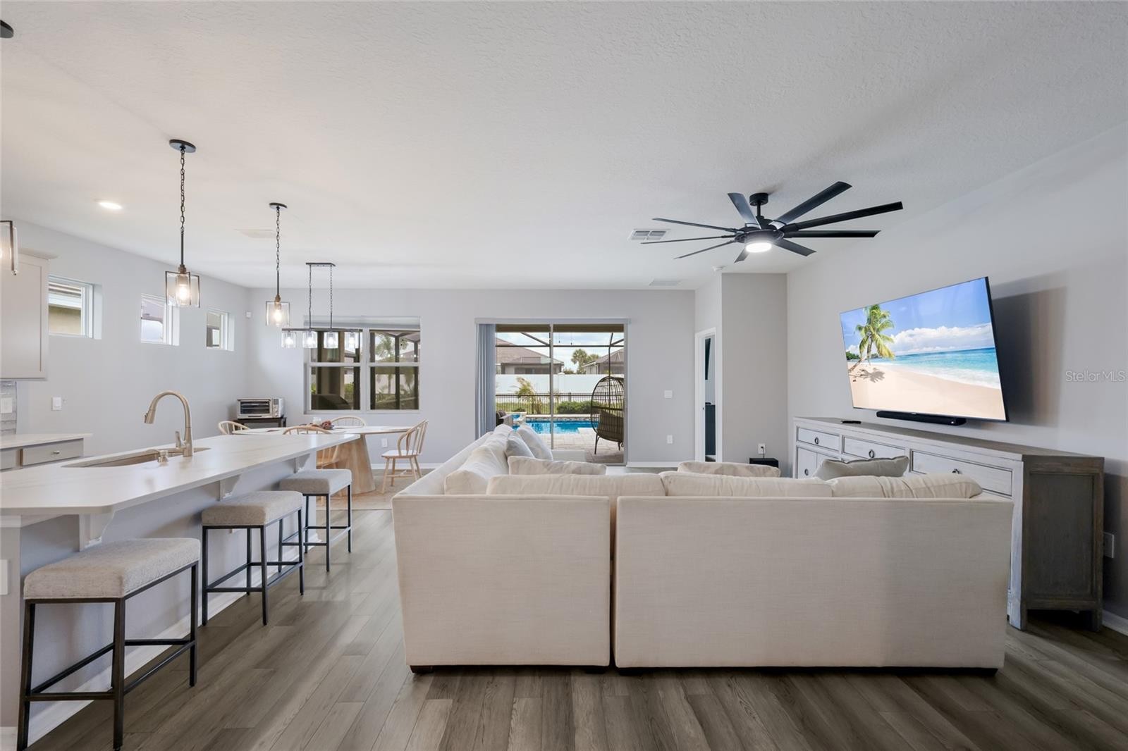 Welcome to Star Farms at Lakewood Ranch, where elevated living meets everyday comfort in this beautifully customized pool home tucked within a guard-gated community known for its resort-style amenities and scenic surroundings. Built in 2022 and meticulously maintained, this 4 bedroom, 2 bathroom residence offers over 2,000 square feet of thoughtfully designed living space and well over $120,000 in upgrades, giving you the feel of new construction without the wait or added expense of building from scratch. Arriving at the home, you’re welcomed by a clean and well-maintained exterior with manicured landscaping and a paver driveway leading into the spacious garage featuring epoxy floors for both durability and style. Step inside where upgraded interior paint and soft, padded luxury vinyl plank flooring flow seamlessly throughout, setting the tone for a warm yet elevated feel from the moment you walk in. The heart of the home centers around a beautifully upgraded kitchen featuring quartz countertops, upgraded stainless steel appliances, a stylish tile backsplash, and ample cabinetry. The open layout connects effortlessly to the main living and dining spaces, all enhanced by custom blinds and upgraded ceiling fans throughout. The owner’s suite is thoughtfully designed with a fully redesigned closet featuring custom organizers, creating a space that feels both practical and refined. The ensuite bathroom continues the elevated finishes with upgraded quartz countertops, modern sinks, and a walk-in shower enclosed with custom glass doors. Additional bedrooms are well-sized and versatile, while the secondary bathroom mirrors the same level of detail and upgrades. Step outside to your private backyard oasis where the upgrades truly shine. The oversized custom heated saltwater pool and spa serves as the focal point of the outdoor space, surrounded by a screened enclosure and enhanced landscaping for added privacy and ambiance. The fenced backyard adds an extra layer of privacy and provides a secure space for pets or play. This is the kind of outdoor living space that typically comes months after closing with new construction, already completed here for you to enjoy from day one. Living in Star Farms means access to an impressive lineup of amenities including a large clubhouse, resort-style pools, walking and biking trails, and a dog park. This particular section of the community also offers access to its own private clubhouse, dedicated pools, and pickleball courts just blocks from the home, giving you the best of both neighborhood and community-wide amenities. Ideally located in the heart of Lakewood Ranch, known for its tree-lined streets, scenic preserves, and beautifully maintained neighborhoods, this area offers a lifestyle centered around convenience, community, and connection. Just minutes from Waterside Place, you’ll enjoy waterfront dining, boutique shopping, farmers markets, and year-round events. With close proximity to top-rated schools, commuting to Sarasota or Tampa is simple, while the Gulf Coast beaches, including Siesta Key, are a short drive away. With new construction still ongoing in the community, this home presents a rare opportunity to skip the build time, avoid construction delays, and move straight into a like-new home that has already been elevated far beyond builder-grade. Every detail has been thoughtfully completed, allowing you to settle in immediately and enjoy the full Lakewood Ranch lifestyle without compromise.