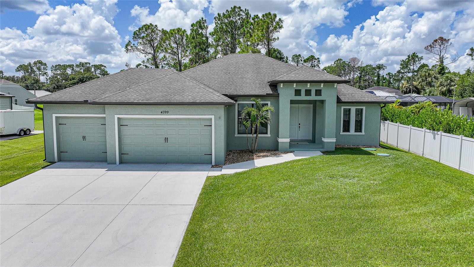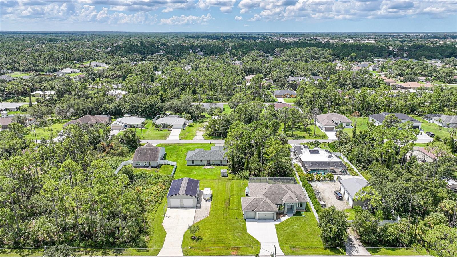 Boasting a 30x40 detached garage/workshop with double doors, full insulation, and air conditioning—along with an attached 3-car garage, this exceptional 3-bedroom, 2-bath home was built in 2020 and sits on an oversized double lot, ideal for those who live big and dream even bigger. Enjoy Florida living year-round with a heated pool and screened lanai, perfect for relaxing, entertaining, or soaking up the sun in total comfort and privacy. With ample parking and expansive outdoor space, there’s room for all your recreational vehicles, boats, and toys. Inside, the open-concept, split-bedroom floor plan features sleek porcelain plank tile flooring throughout, creating a modern and inviting living space. Added comforts include a whole-home reverse osmosis water system with a 300 gallon tank, delivering clean, purified water from every tap. The home is equipped with a 44-panel solar power system paired with three Tesla Powerwall batteries, providing seamless backup power—so you’ll never go without electricity. Fully automated so there’s no need to worry about switching systems or starting a generator. Whether you’re entertaining guests, working on your next project, or simply enjoying peace of mind, this home truly has it all. Furnishings are available for purchase under a separate contract.