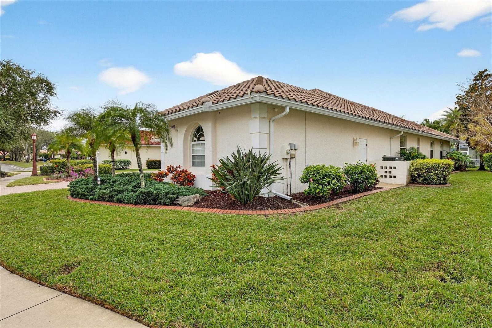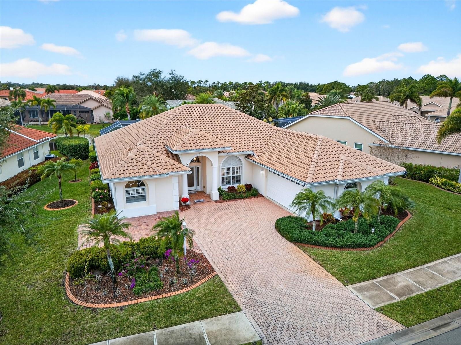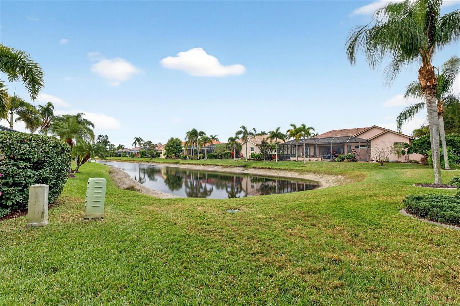 Tastefully upgraded and impeccably maintained, this light-filled home is located in the highly desirable, gated community of Venetia, offering an ideal low-maintenance lifestyle for full-time, seasonal, or downsizing buyers. Curb appeal includes lush tropical landscaping, a paver driveway, oversized garage, and elegant leaded-glass entry door. Inside, soaring ceilings, 4" crown molding (top and bottom), hardwood flooring, plantation shutters, and custom shade window coverings enhance the open, inviting design. The split floor plan provides privacy, while the centrally located kitchen features new Quartz countertops that match the glass mosaic backsplash, warm wood cabinetry, double pantry closets, and new range/oven and microwave. The living area opens through large sliding glass doors to a new screened lanai enclosure, pool, and tranquil pond view. Additional features include a new tile roof, soffits, and rain gutters (2024), AC replaced in 2019, hurricane shutters, security cameras, walk-in tiled shower, updated ceiling fans and fixtures throughout, and negotiable furnishings. Venetia offers a clubhouse, heated pool and spa, fitness center, and tennis and basketball courts, all minutes from Venice beaches, golf, dinning, and shopping.