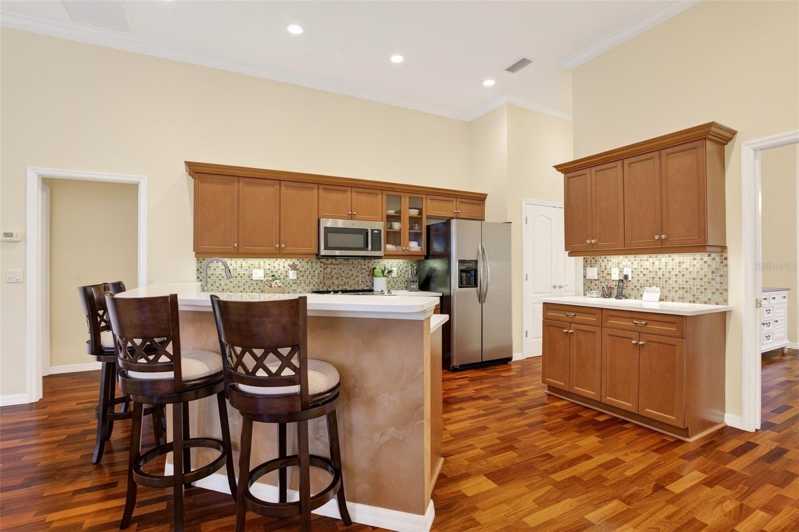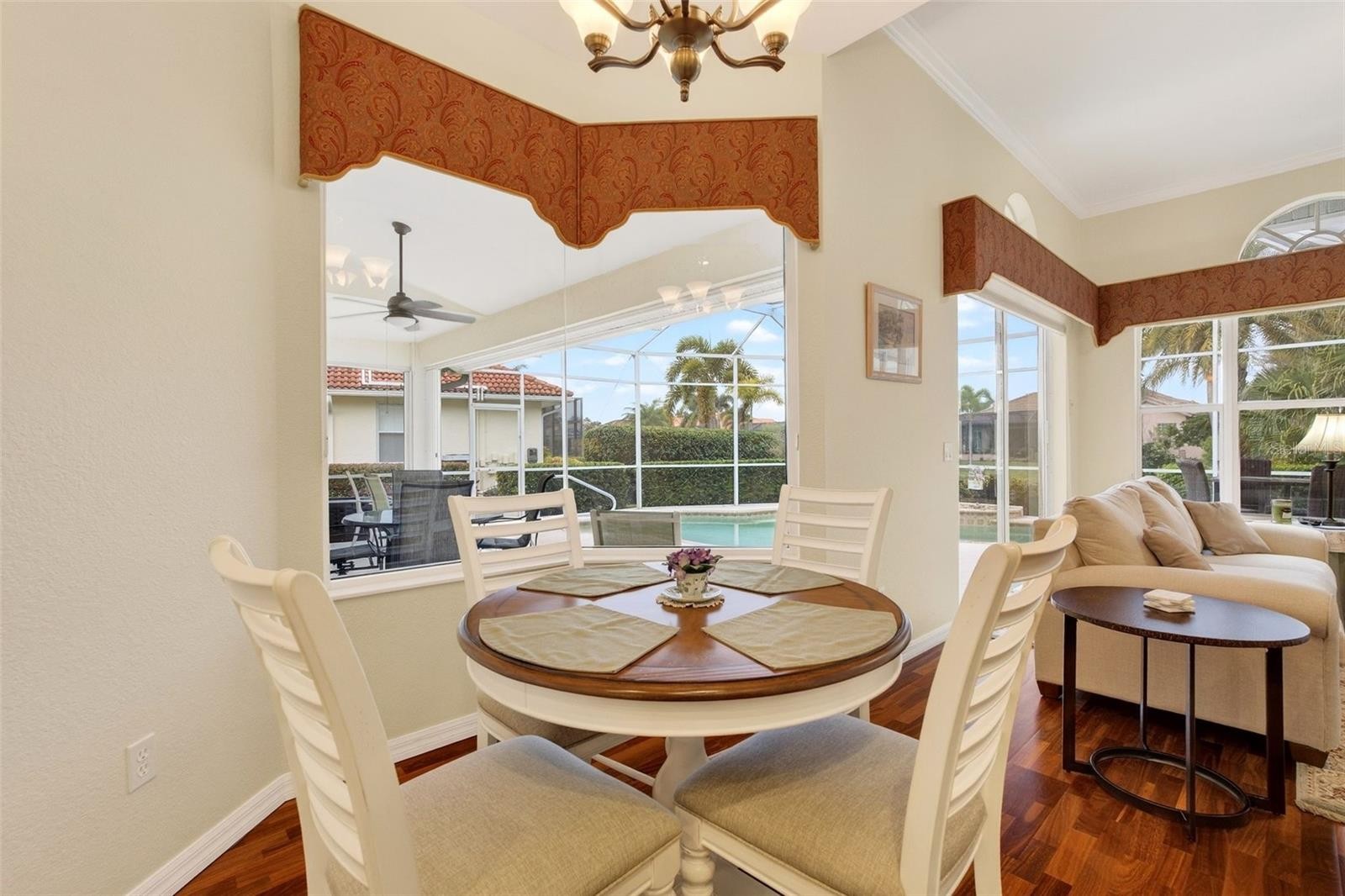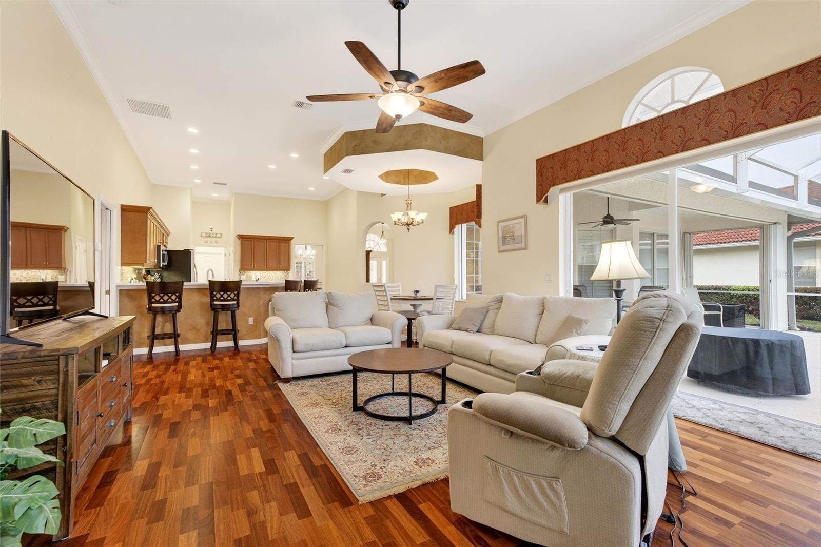 Tastefully upgraded and impeccably maintained, this light-filled home is located in the highly desirable, gated community of Venetia, offering an ideal low-maintenance lifestyle for full-time, seasonal, or downsizing buyers. Curb appeal includes lush tropical landscaping, a paver driveway, oversized garage, and elegant leaded-glass entry door. Inside, soaring ceilings, 4" crown molding (top and bottom), hardwood flooring, plantation shutters, and custom shade window coverings enhance the open, inviting design. The split floor plan provides privacy, while the centrally located kitchen features new Quartz countertops that match the glass mosaic backsplash, warm wood cabinetry, double pantry closets, and new range/oven and microwave. The living area opens through large sliding glass doors to a new screened lanai enclosure, pool, and tranquil pond view. Additional features include a new tile roof, soffits, and rain gutters (2024), AC replaced in 2019, hurricane shutters, security cameras, walk-in tiled shower, updated ceiling fans and fixtures throughout, and negotiable furnishings. Venetia offers a clubhouse, heated pool and spa, fitness center, and tennis and basketball courts, all minutes from Venice beaches, golf, dinning, and shopping.