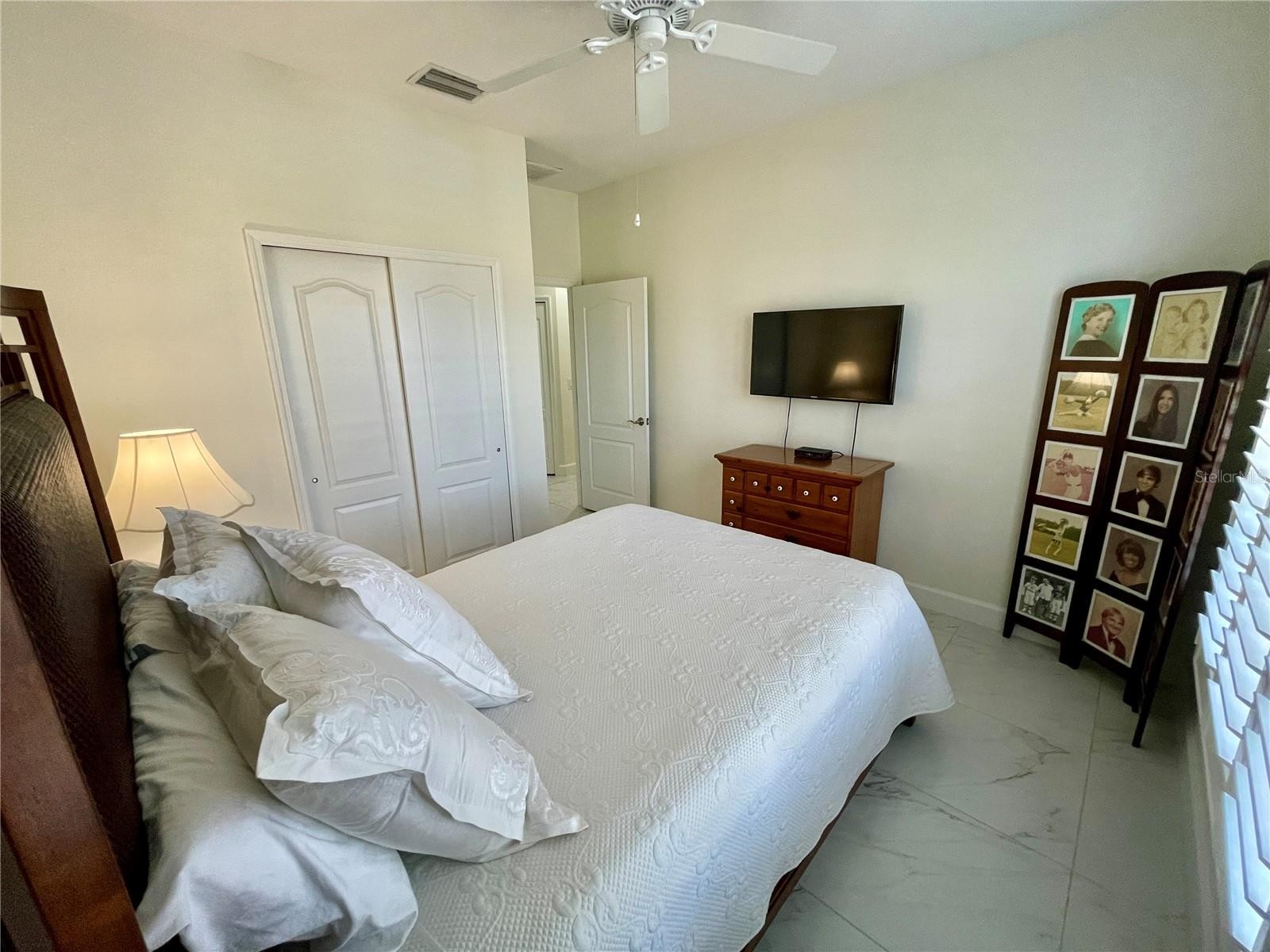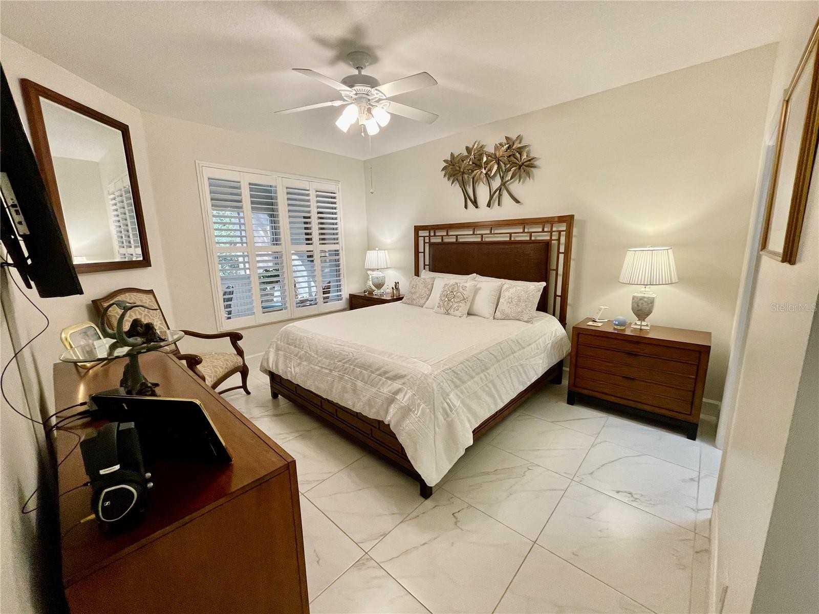 Stunning end unit, 3/2/2, 2013 built, split floor plan, 1471sf villa is located in the very desirable, maintenance free, gated community, Villas of Turnberry Trace. With high ceilings, plantation shutters and large porcelain tile throughout, it shows like a model. The kitchen has 42" tall wood, soft close cabinetry, under cabinet lighting, granite counter tops and new stainless appliances with a breakfast bar/island. The Casual Dining shares the space with the Kitchen and Great Room. Being a corner unit, the many tinted windows to allow soft light into the home. You have access to the enclosed lanai through double doors off of the Kitchen. The Lanai has plexiglass sliding windows along the outside wall, sun shades to help keep the room cool, add privacy and has a ceiling fan. The porcelain tile floor matches the interior flooring. This peaceful place adds to the living space . Beyond the enclosed Lanai is a concrete patio that adds to the outdoor living. The yard is private with a natural hedge that accompanies the community fence. There is open space between this unit and the pool/clubhouse next-door. The Master bedroom is accessed at the end of the entryway hall and looks out to the back. This spacious room has 2 large walk-in closets. The Master bathroom has a water closet, large walk-in shower with a hand held shower head, a huge vanity with 2 banks of drawers, wood cabinets and 2 sinks. The granite counters and cabinets match throughout the home. The 2nd bedroom is at the front of the home; It looks out to the front yard and community pond. The 3rd bedroom/Den. It is located off of the front entryway, it looks out to the side yard. It has double doors, large windows and a closet. This is a great multi-purpose space. The guest bathroom, laundry closet and garage are located near the 2nd bedroom at the front of the home. The guest bathroom has a tub/shower with a hand held shower head and grab bars, it is very spacious. There is a linen closet and an additional large storage closet in the hallway going toward the main living space. The Laundry closet has access through double doors. There are ceiling fans in most of the rooms. The 2 car garage is painted and has natural light from the windows in the overhead door. The overhead door spring and garage door access pad was just replaced. There is a paver driveway and walkway to the front door. The front door is a hurricane impact door. The house also has hurricane shutters. The hot water heater was replaced in 2022. Refrigerator, microwave, range and disposal replaced in 2024. Dishwasher replaced 2019. Washer and Dryer replaced 2025. The TV's and brackets convey with the home. Some furnishings are available on a separate contract. This is a lovely community with various activities and gatherings, a fitness center, and a community pool. Electric golf carts are permitted. Motor cycles and trucks are allowed. This community is on City water and sewer and is on the hospital power grid. Near I75, Hwy 41 for easy access to travel, close to grocery shopping, medical care, restaurants, shopping in North Port, Venice, Port Charlotte, Englewood and down town Punta Gorda. Boating, fishing, biking and beaches are a short distance. Come check it out and fall in love!